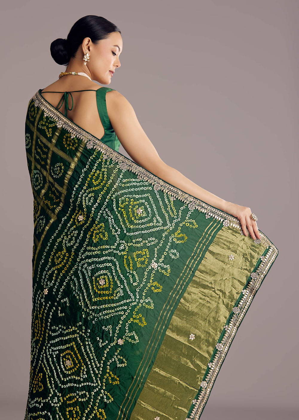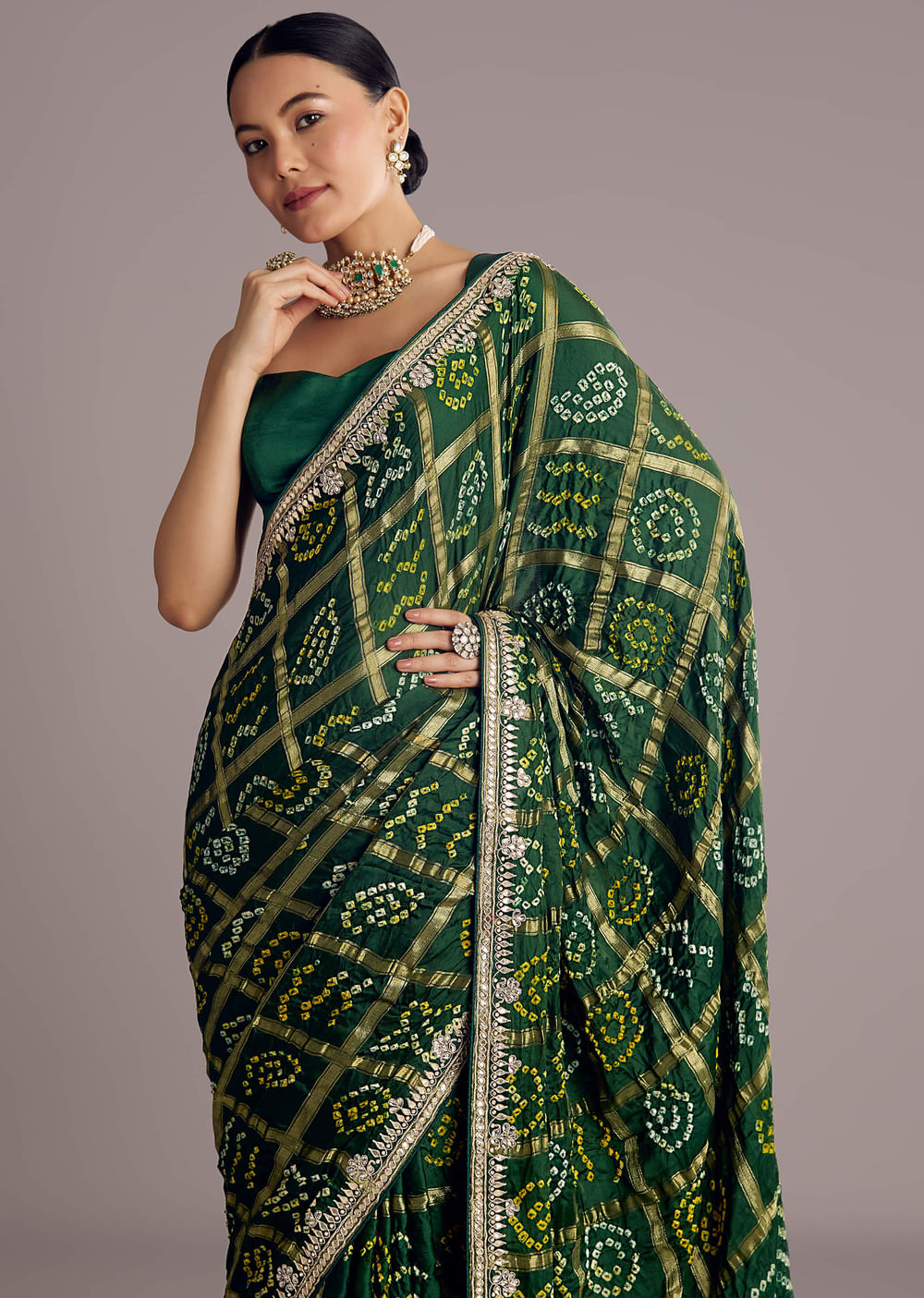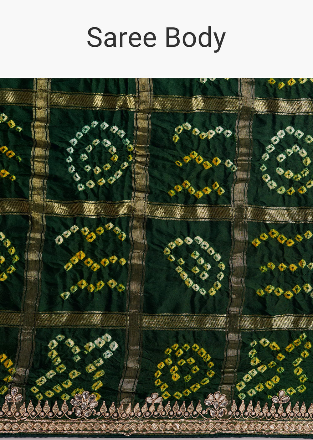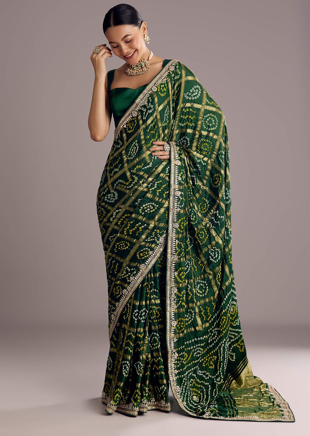 Rooted in tradition, this deep green satin Bandhani saree is a timeless beauty brought to life with intricate gota work shimmering across the fabric. The rich texture of satin blends... More Product Details