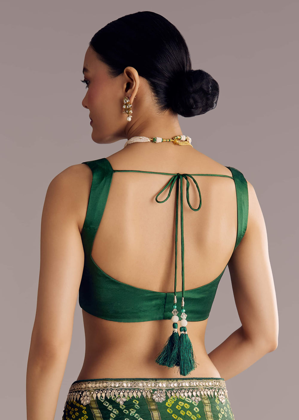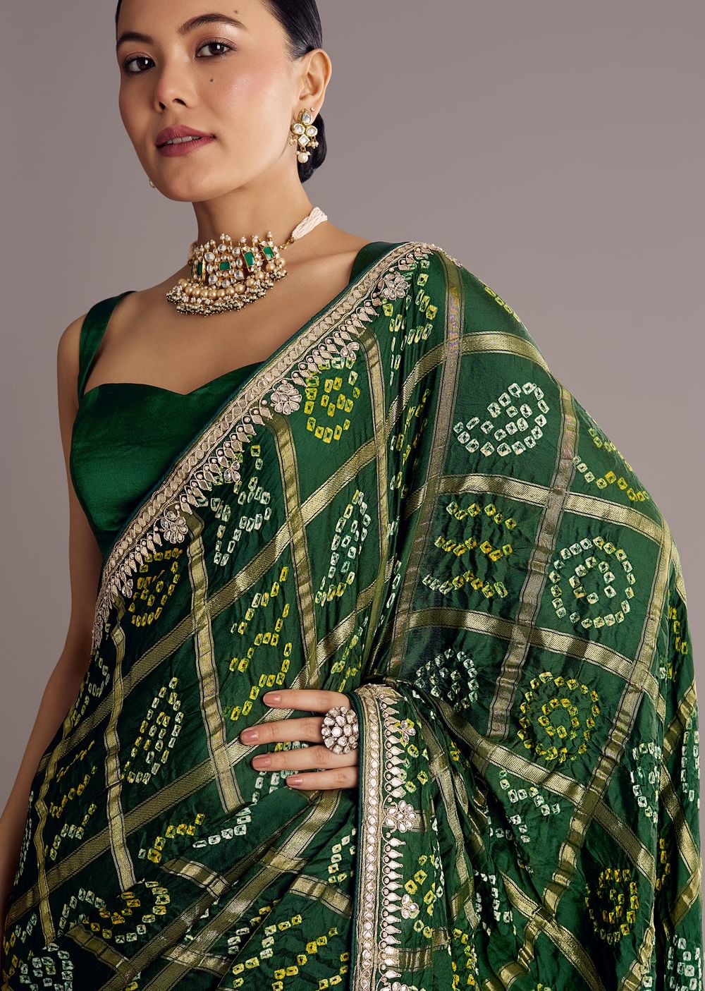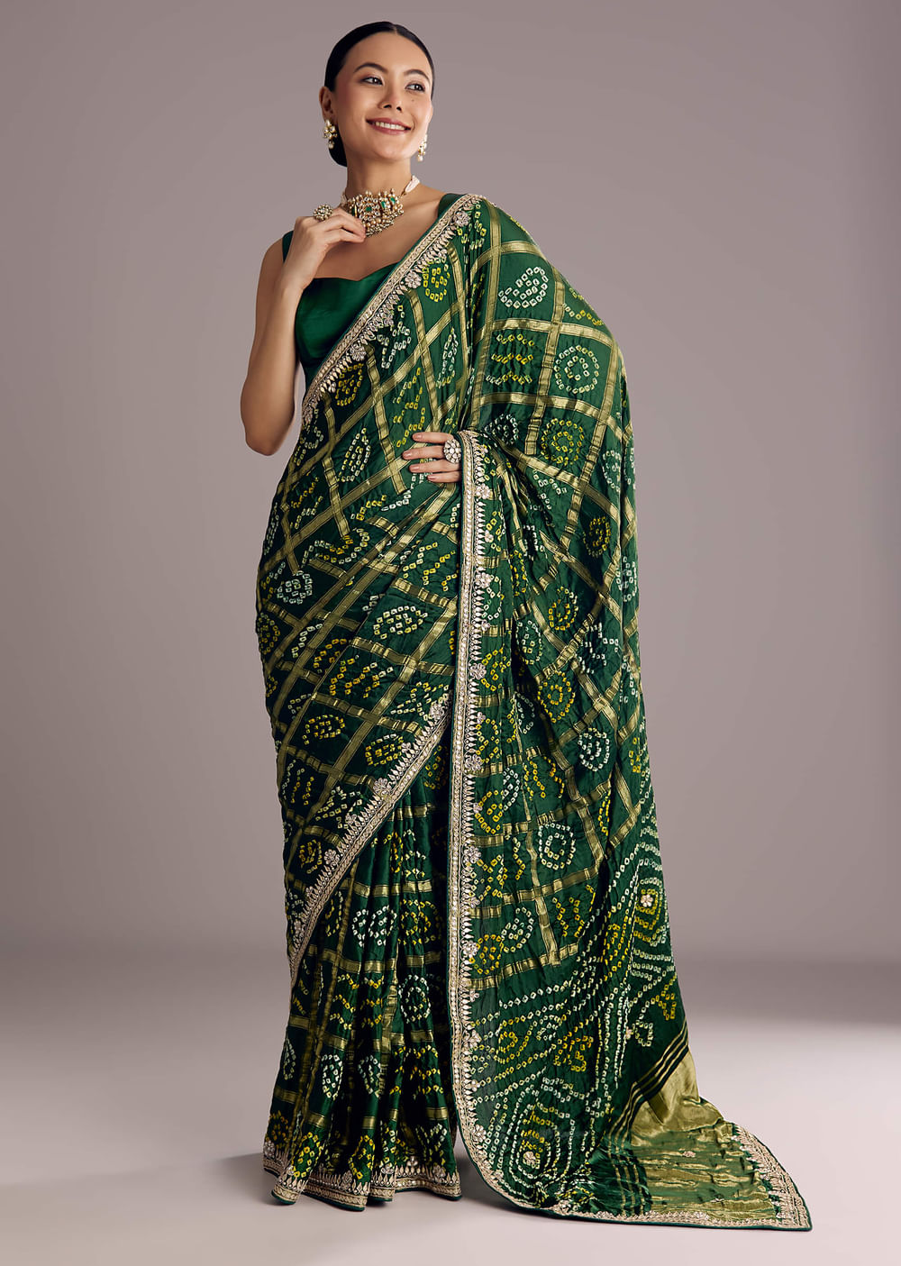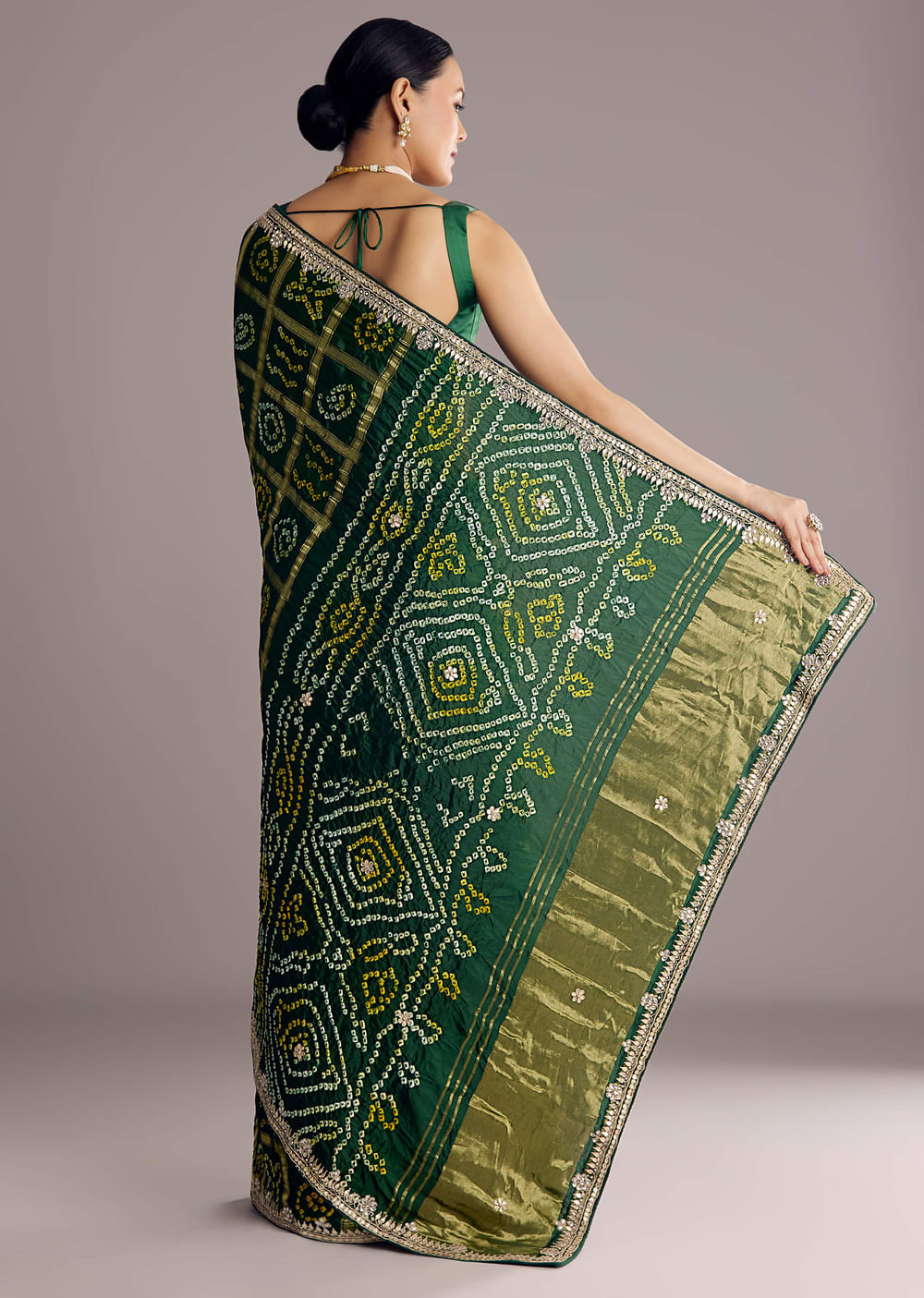 Rooted in tradition, this deep green satin Bandhani saree is a timeless beauty brought to life with intricate gota work shimmering across the fabric. The rich texture of satin blends... More Product Details