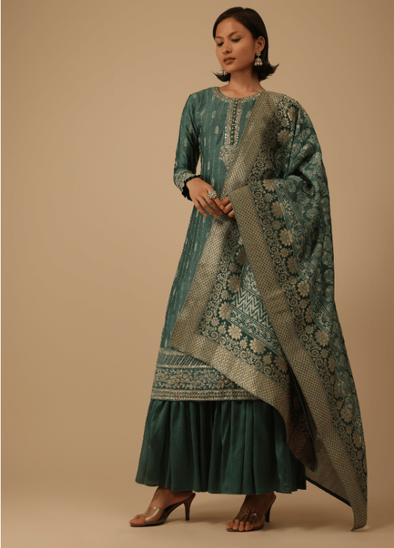 Deep Green Silk Kurti And Chiffon Sharara Set With Brocade