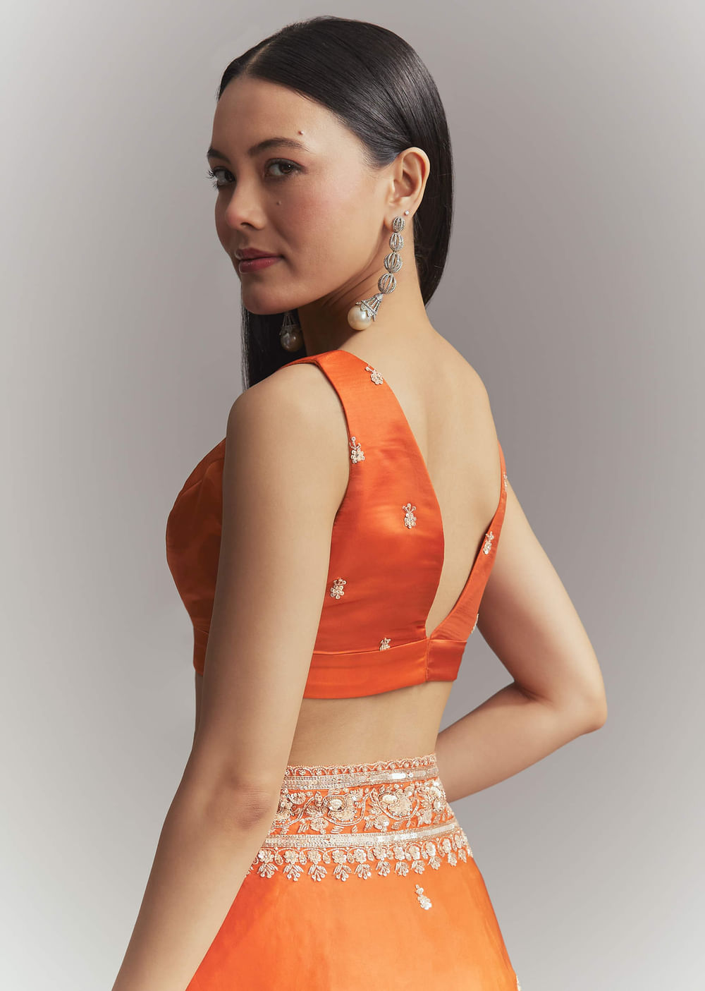 Dusky Orange Satin Embroidered Saree With Heavy Hand Embroidery