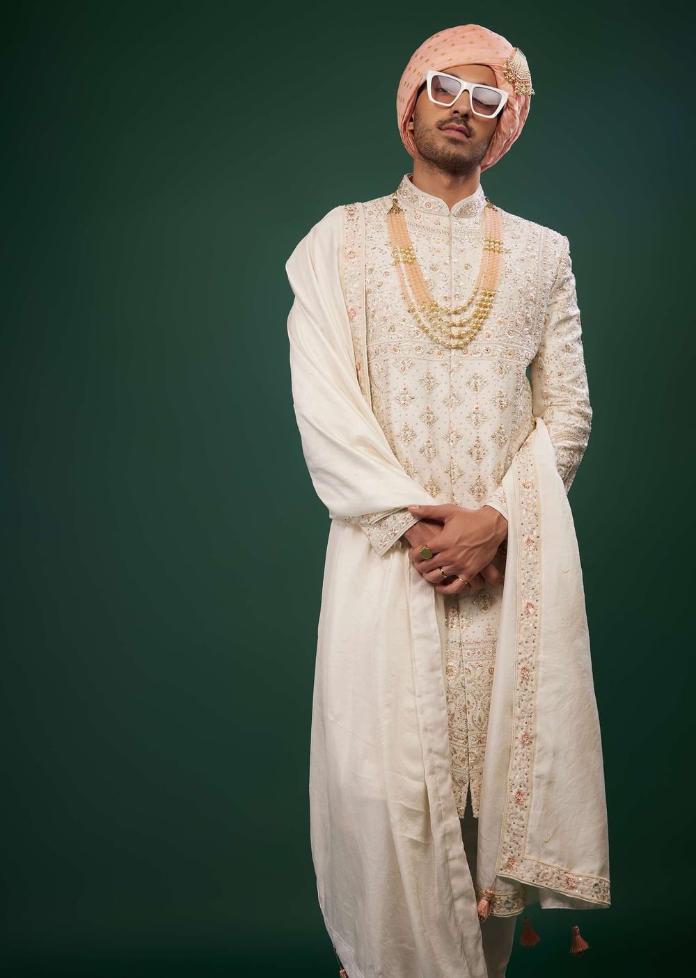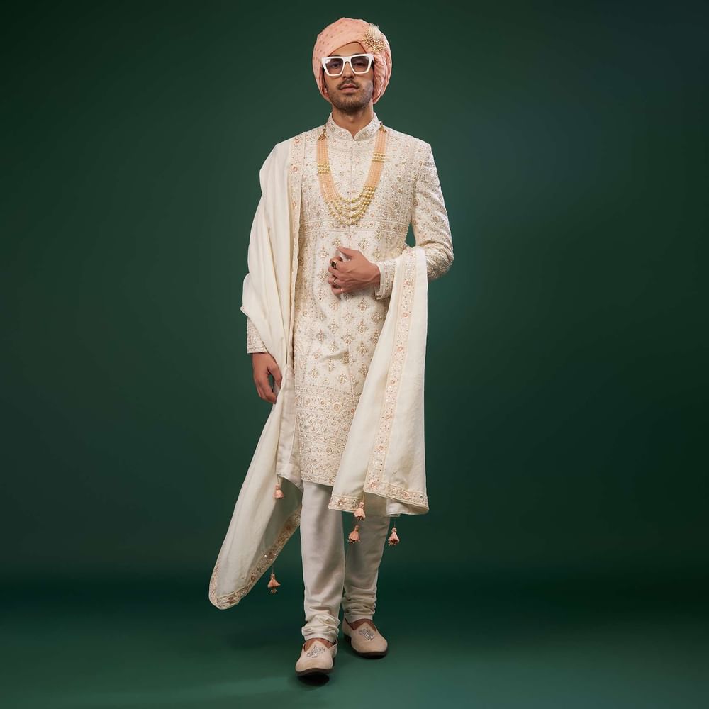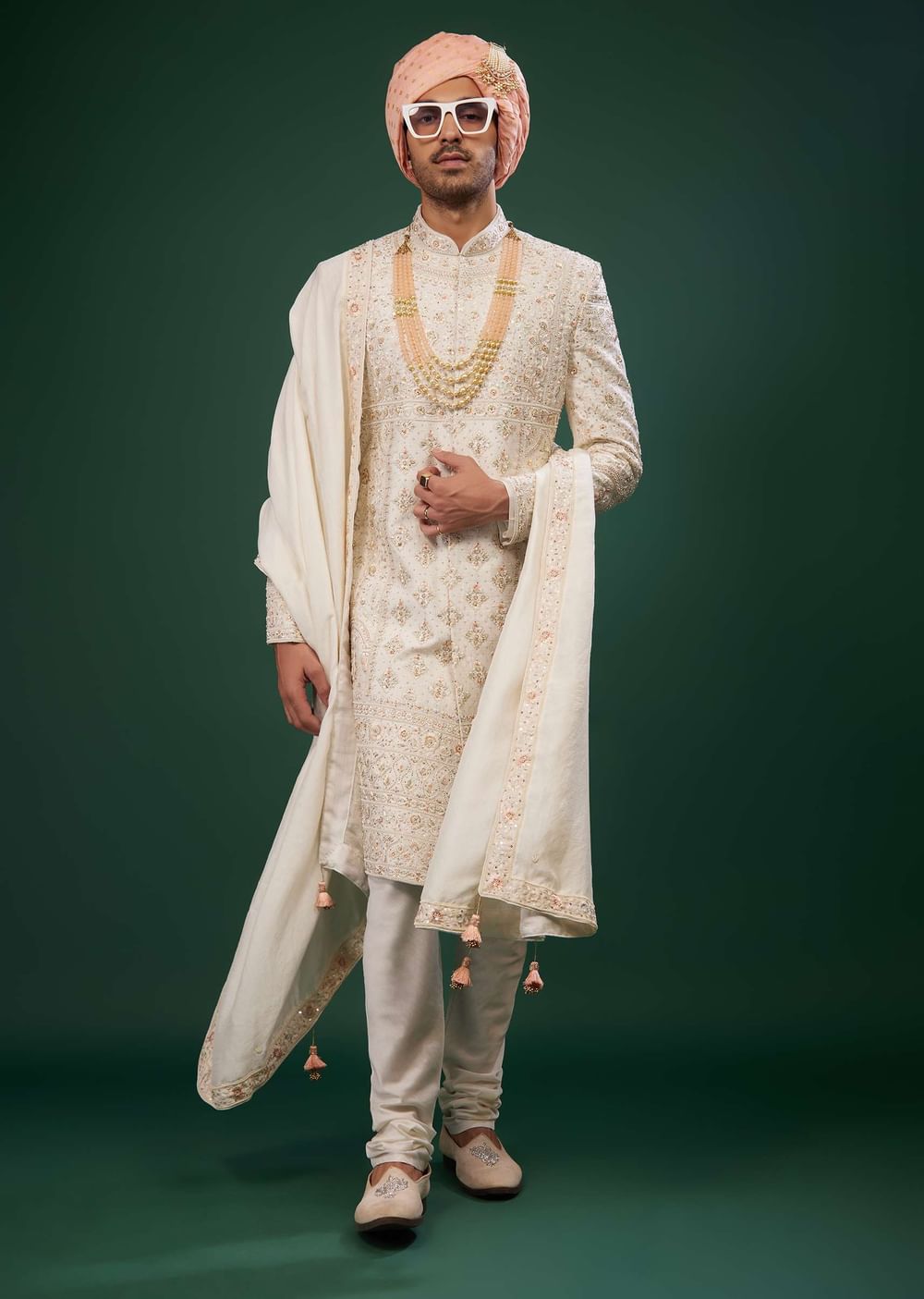 An elegant egret white sherwani set fabricated in raw silk.The sherwani is crafted in threadwork, french knots, beads, cut-dana, and sequins embroidery.It has full sleeves and a mandarin collar with a front closure, comes with a stole, matching churidar, and a multilayered pearl mala.Buttons and Accessories may vary in color, shape and size. Awarded as the Most Trusted Brand, we're delivering styles you love, just as promised.