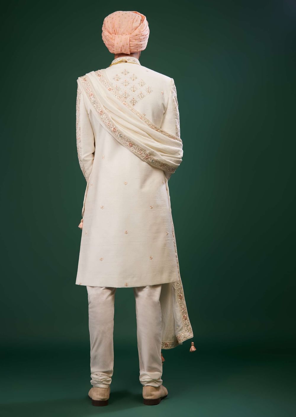 Ivory White Embroidered Sherwani Set In Raw Silk