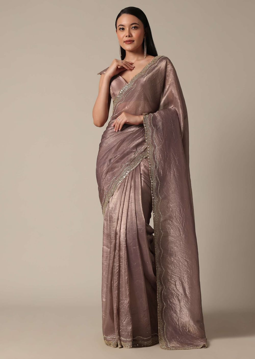 Discover elegance in the details with this Brown Glass Crush Saree. The mirror and stone embellishments form a captivating scallop border. The rich brown hue, coupled with subtle mauve accents, adds depth and sophistication to your party wear collection. Meticulously crafted, the saree ensures comfort and personalized style with the included unstitched blouse fabric. Awarded as the Most Trusted Brand, we're delivering styles you love, just as promised.