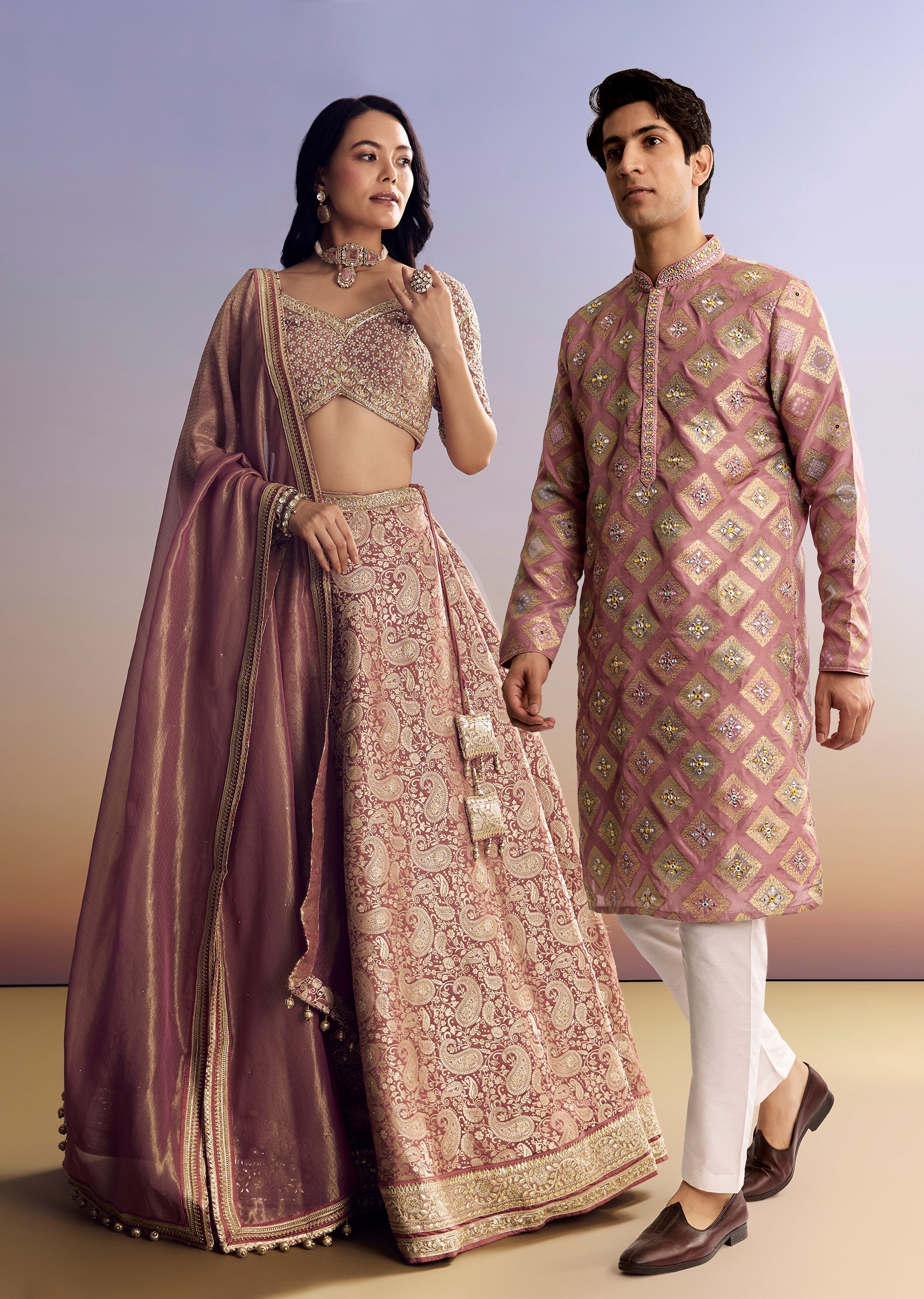 Elegant Couple Set – Light Pink Banarasi Silk Lehenga Set with Embroidered Choli for Her And Pink Silk Kurta Set with Mirror Geometric Print for Him