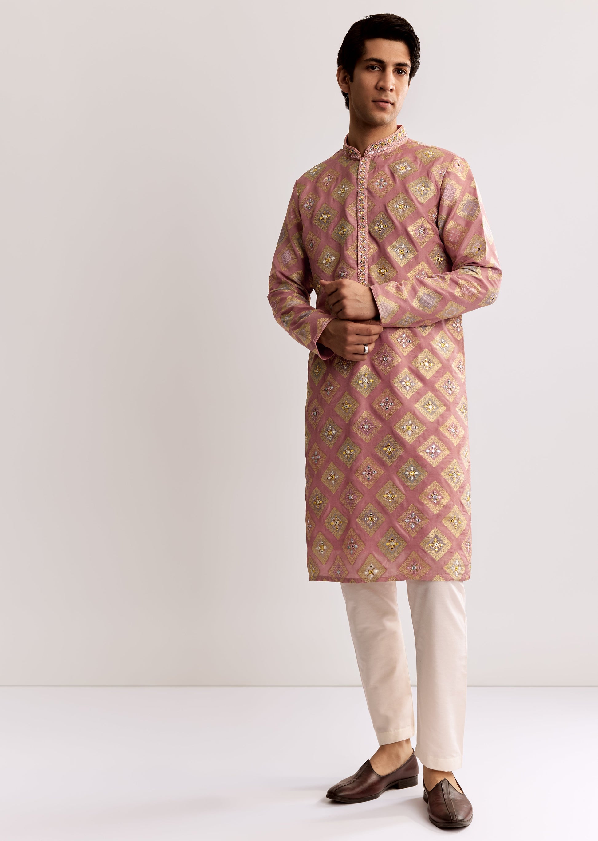 Chic and festive, this pink silk kurta set with mirror geometric print brings a modern yet celebratory vibe, beautifully complementing the softness of his partner’s lehenga.