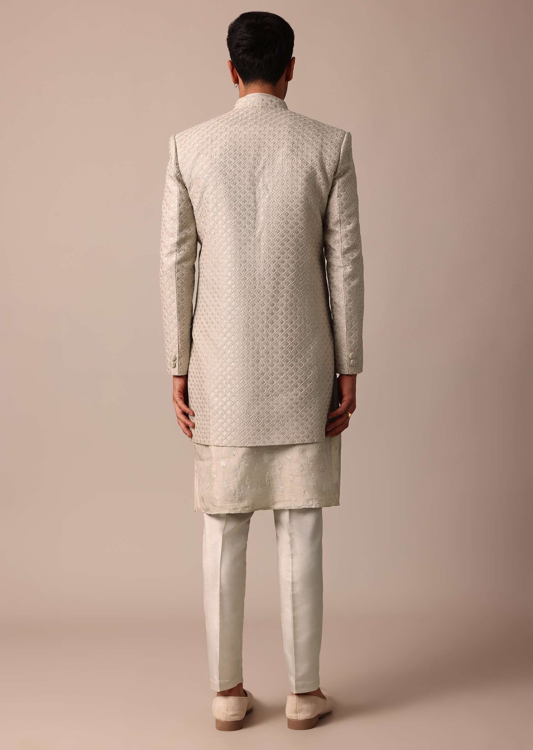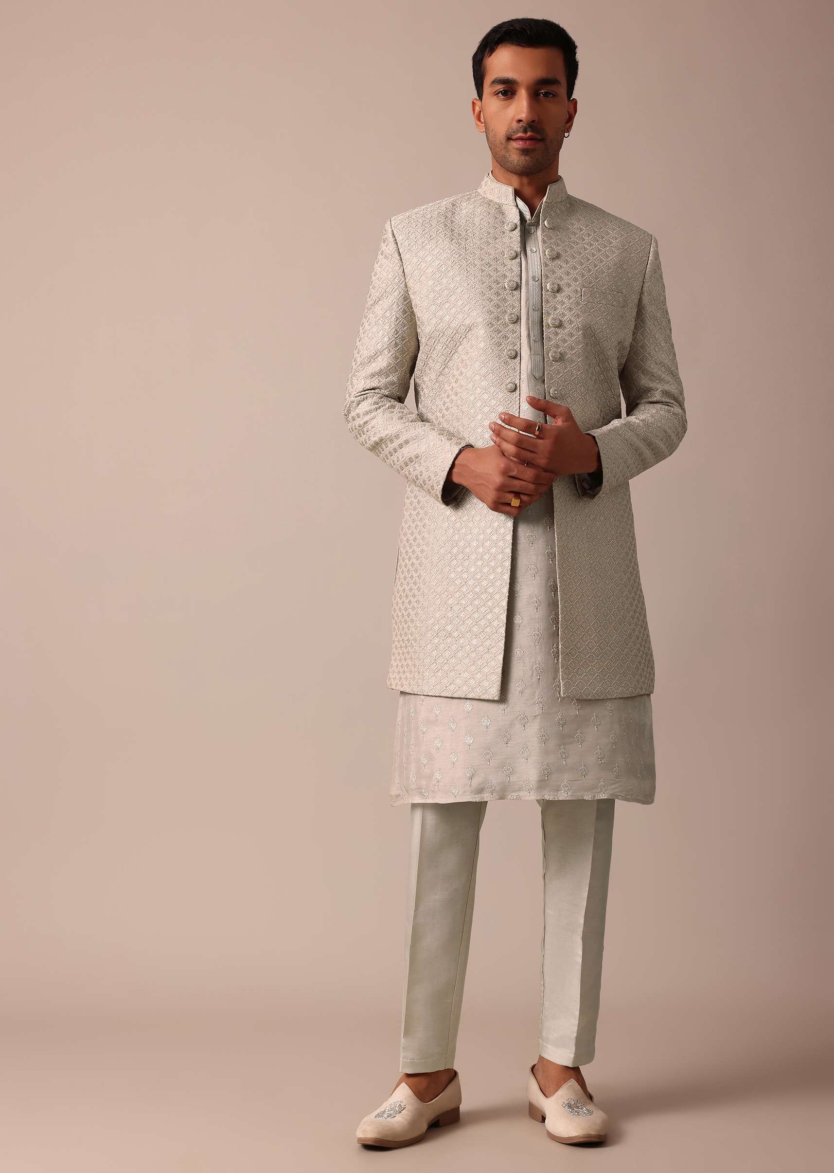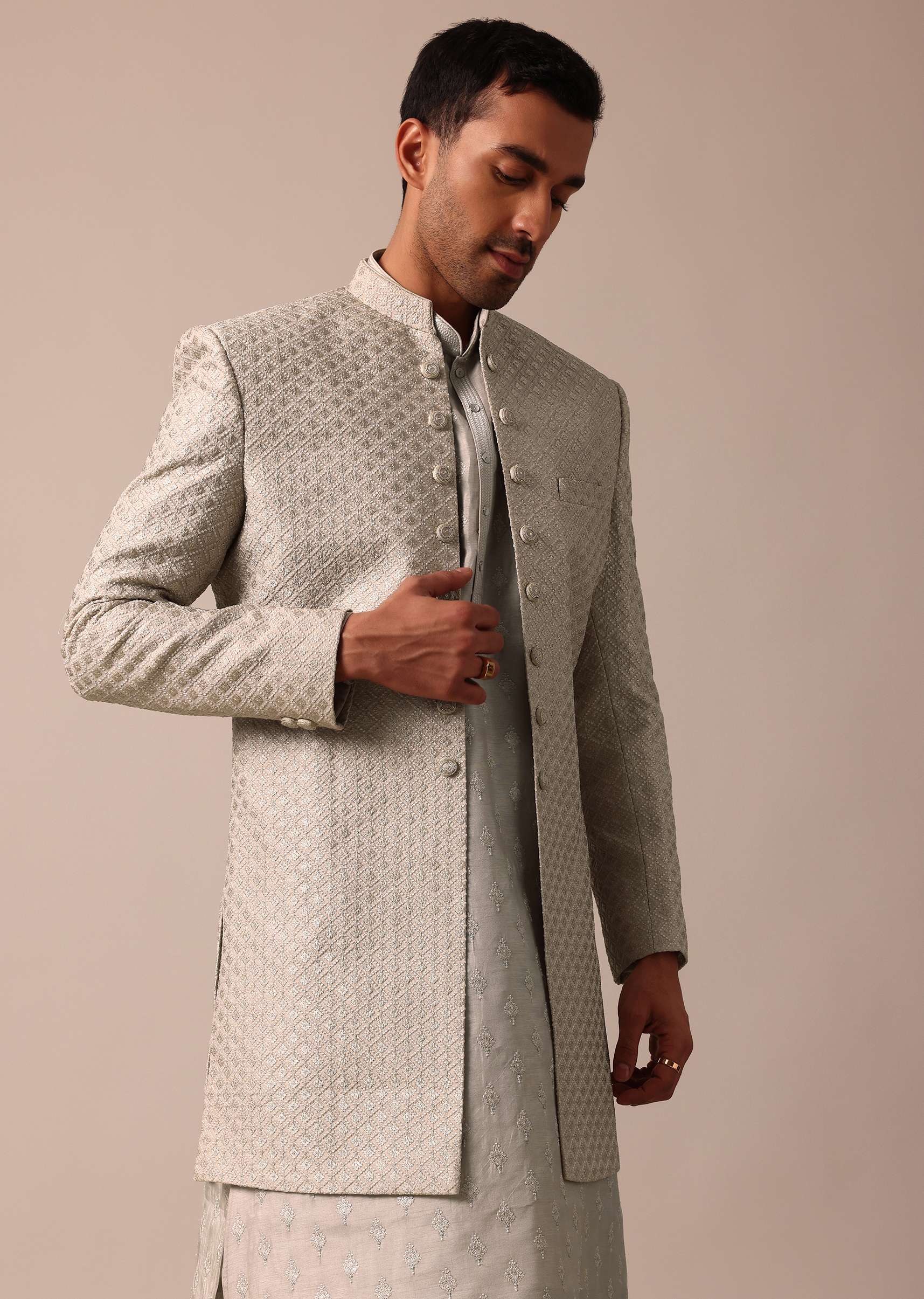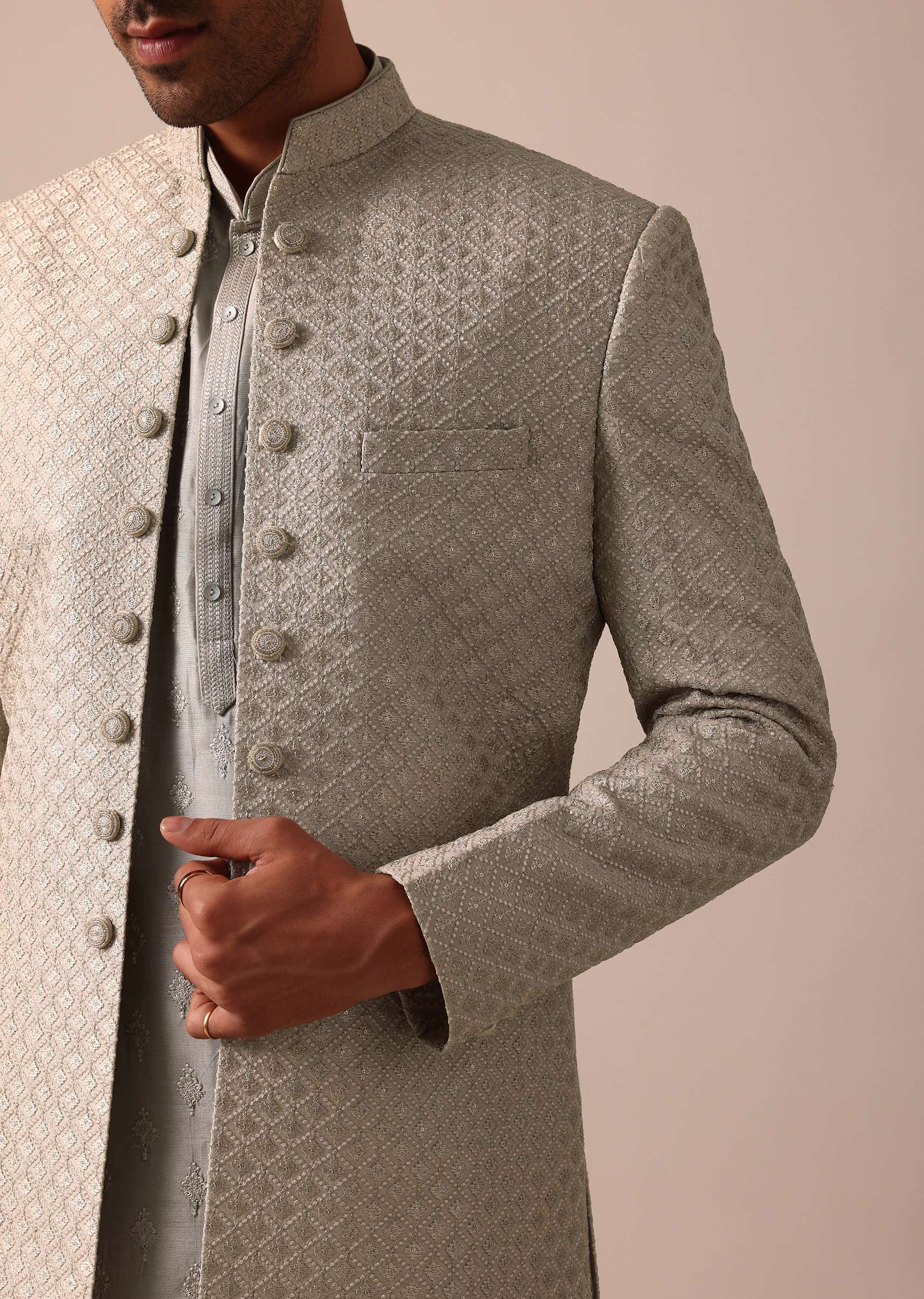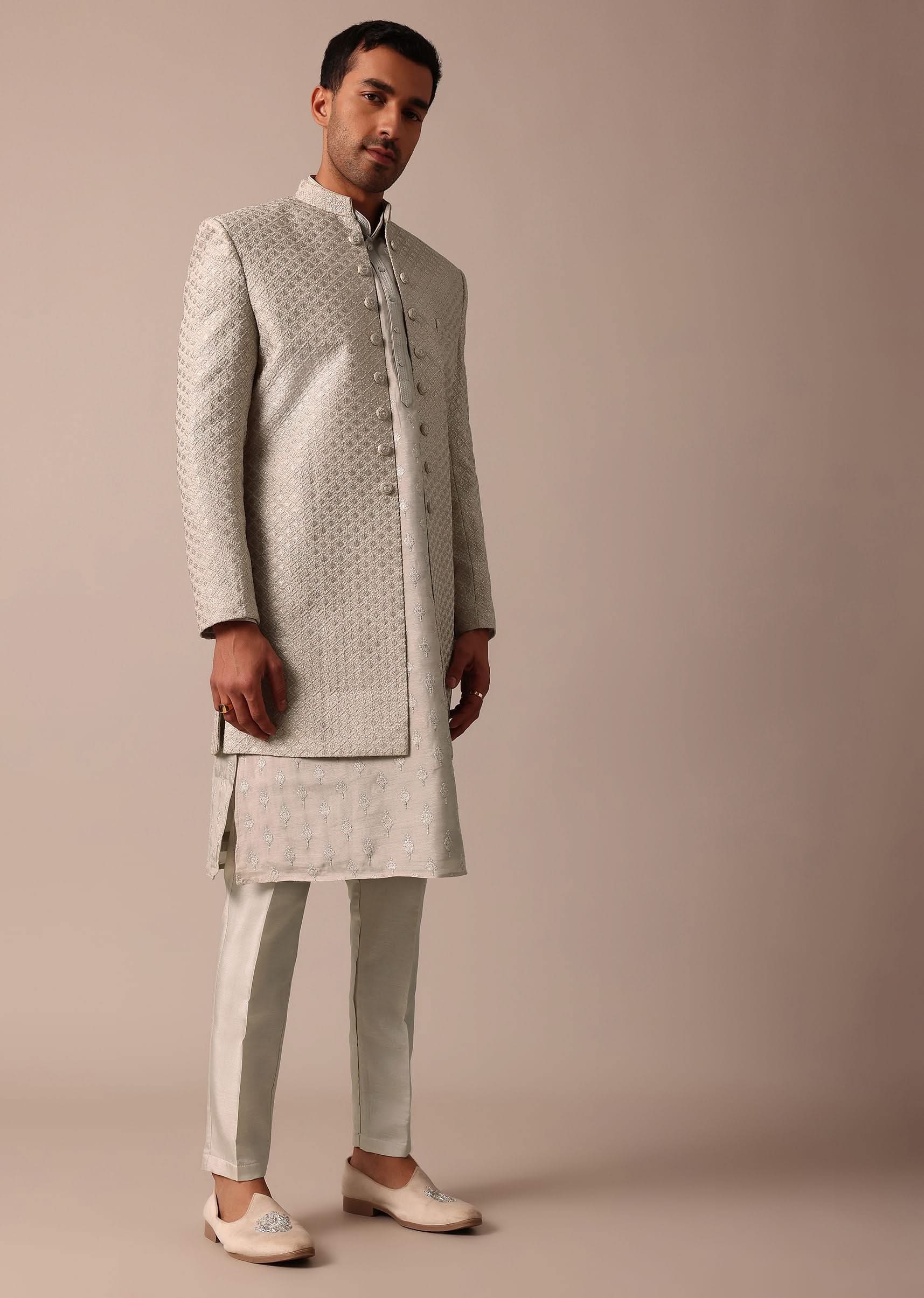Embrace sophistication on your wedding or Sangeet day with our Elegant beige Silk Sherwani Set. It is adorned with intricate embroidery all over. This set includes a Sherwani Kurta and Bottom all crafted from luxurious silk. The versatile grey color provides a timeless and modern look making it an ideal choice for a memorable celebration. Awarded as the Most Trusted Brand, we're delivering styles you love, just as promised.