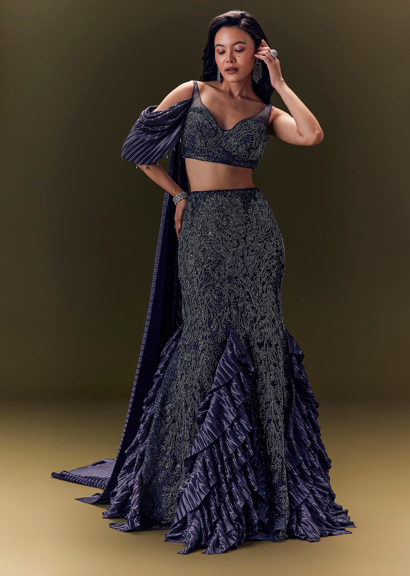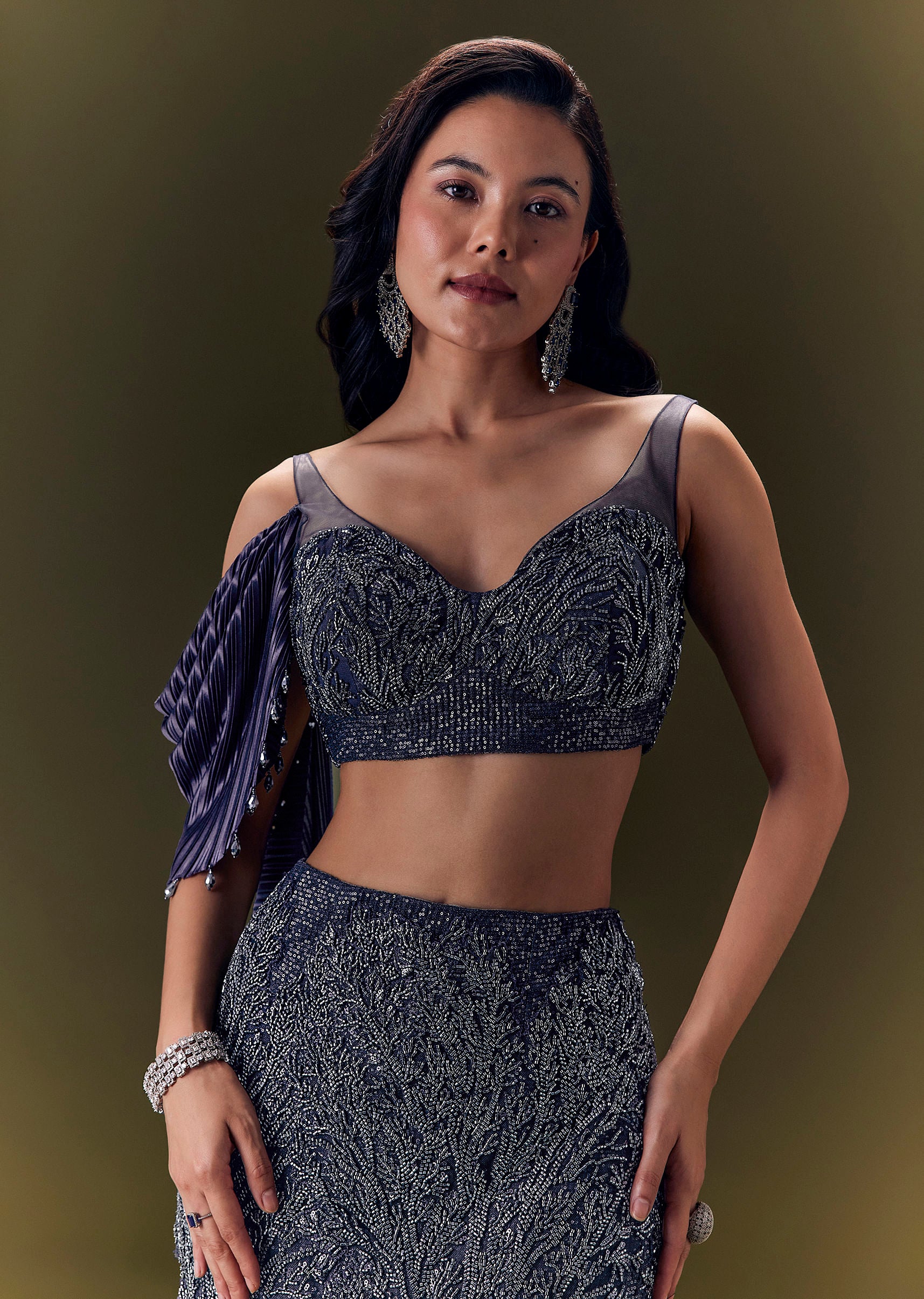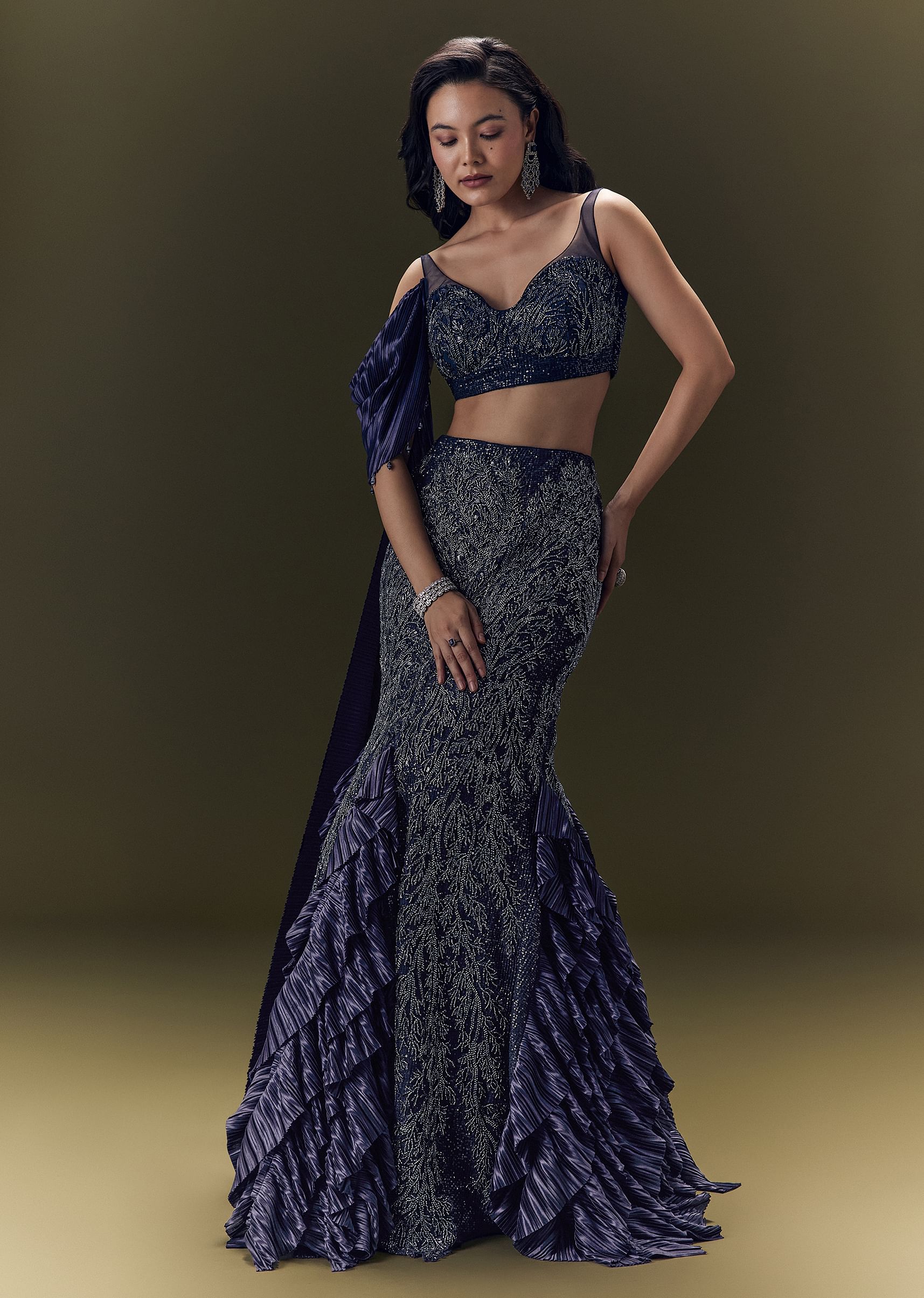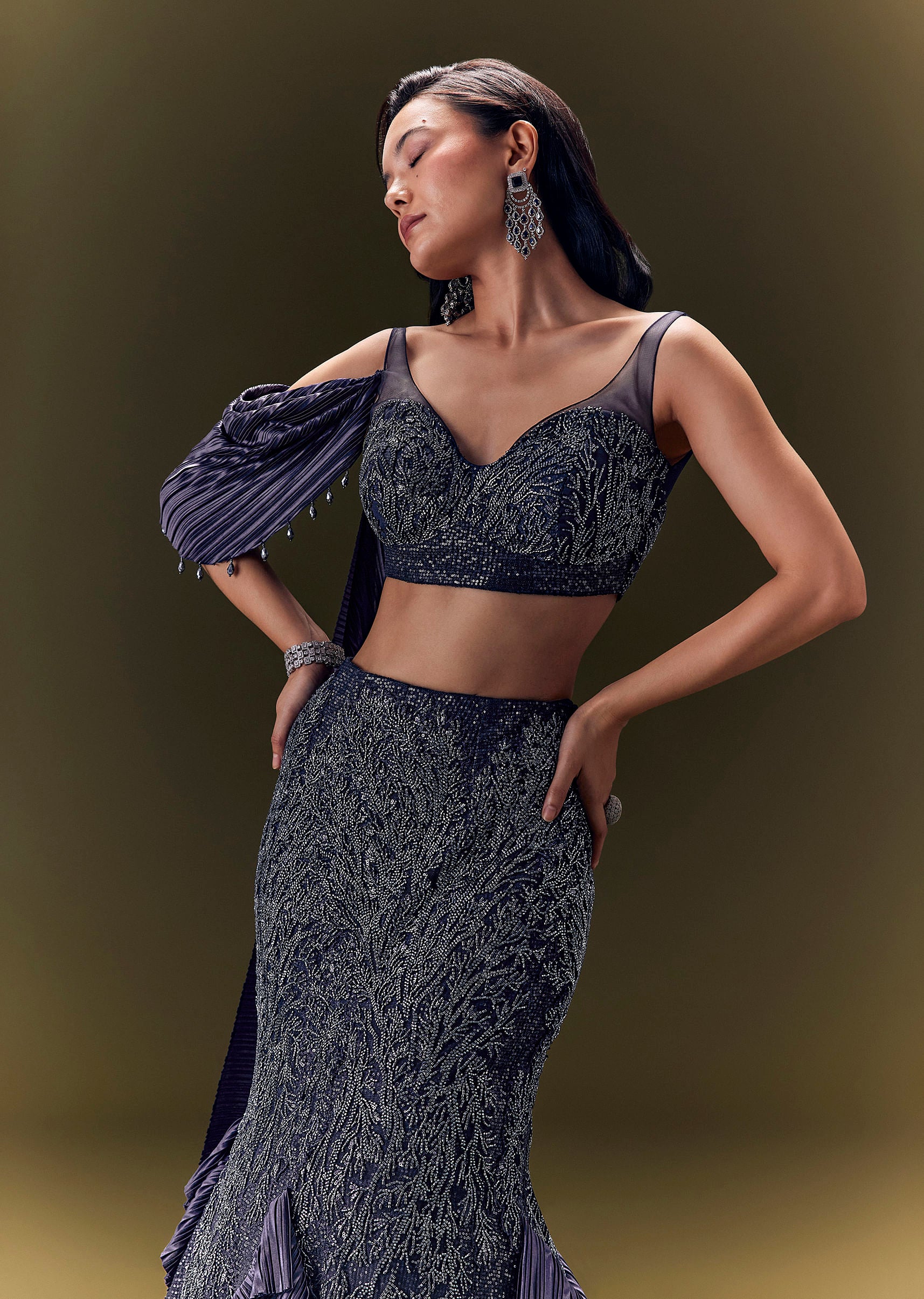 Dive into the depths of elegance with this navy blue crepe set featuring a meticulously hand-embroidered blouse with cutdana pearl and sequence work The dramatic pleated cape adds a regal touch flowing gracefully over the fitted fish cut skirt The ensemble exudes glamour and sophistication making it ideal for evening soirées and receptions A masterpiece of modern couture with timeless charm. Awarded As The Most Trusted Brand We'Re Delivering Styles You Love Just As Promised.