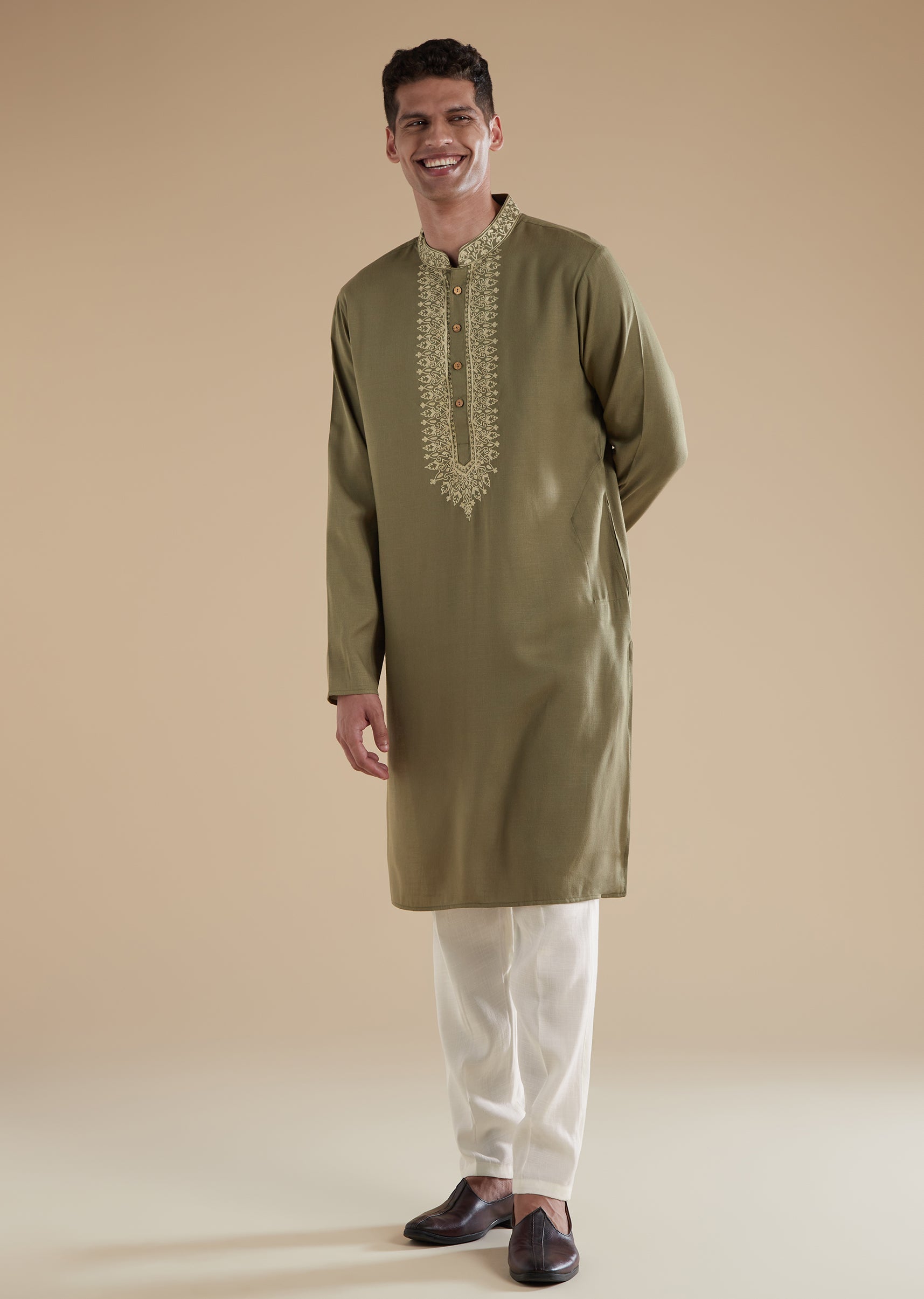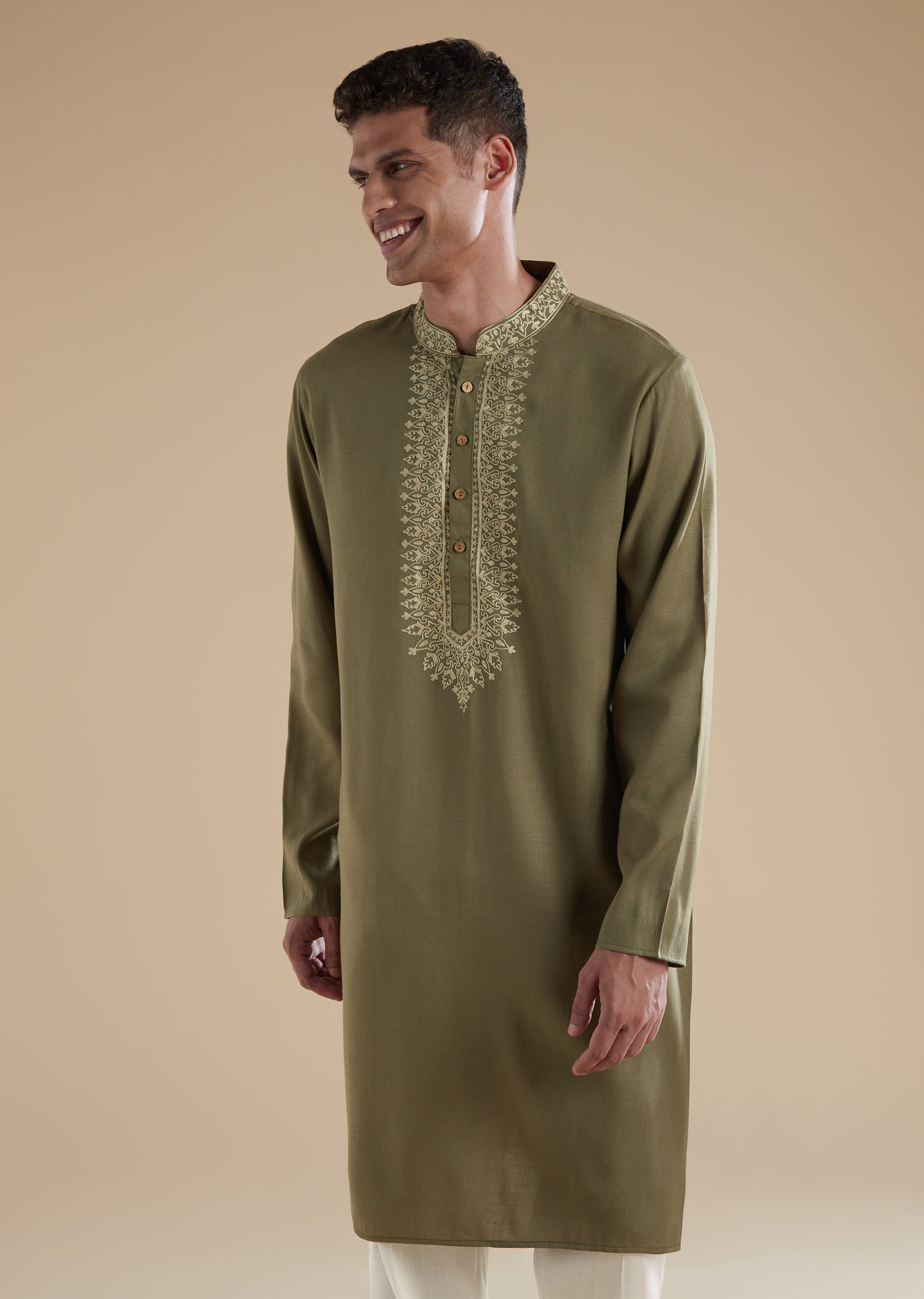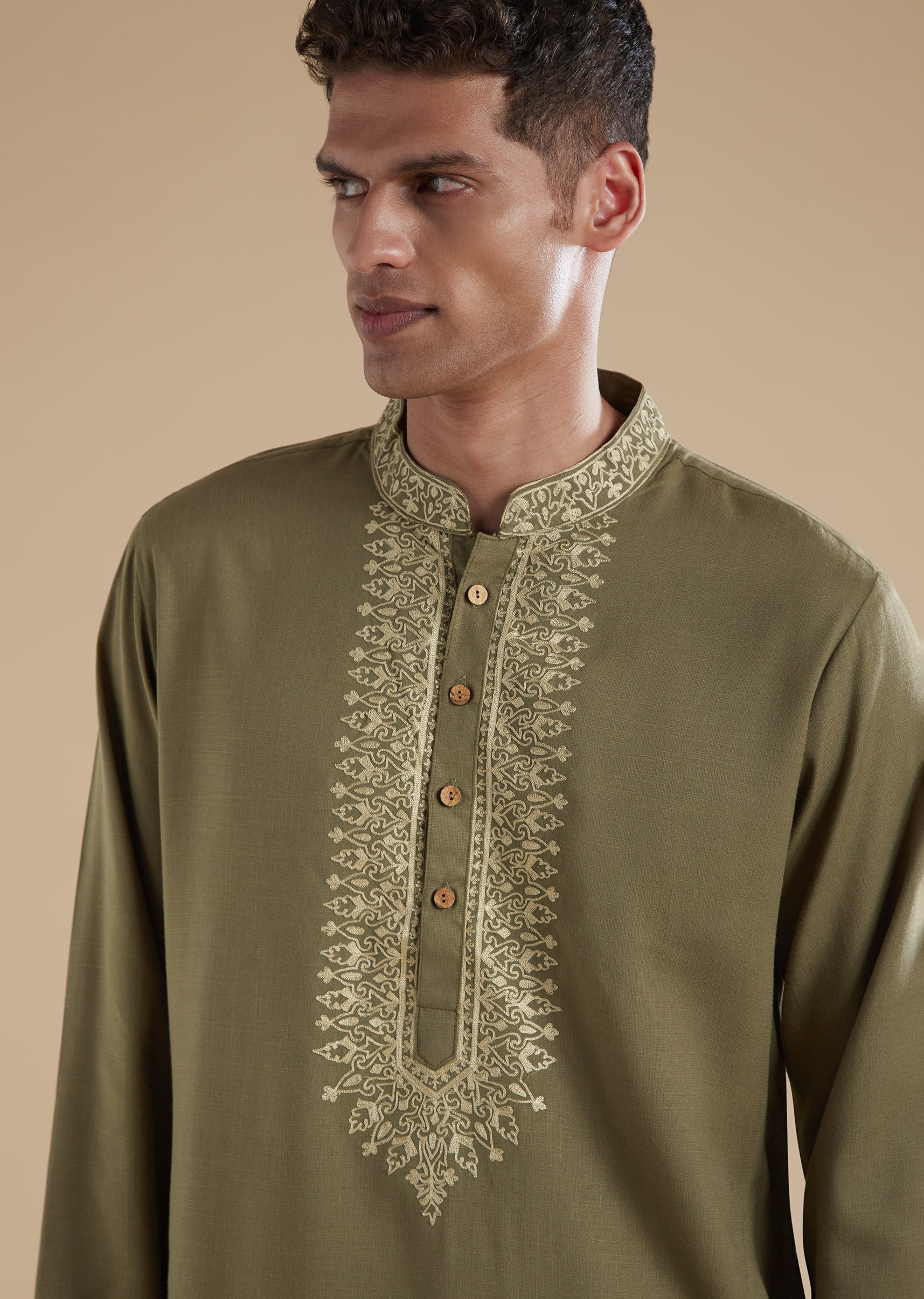 This emerald green kurta set is crafted in soft cotton with polyester as the secondary fabric, offering both comfort and a structured fall. The kurta features delicate resham thread work, full sleeves, a refined mandarin collar, and a front button closure for a classic finish. Coordinating pants with a matching front button fastening complete the set, creating a cohesive and polished festive look. Designed in soothing pastels, this ensemble is perfect for celebrations, rituals, and special occasions where elegance meets ease.