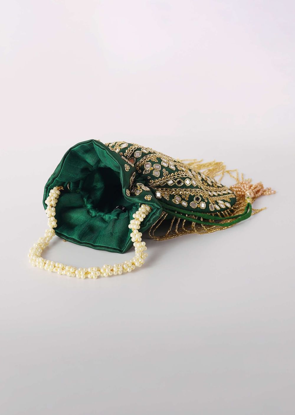 Bottle Green Mirror Work Silk Potli With Tassels And Pearl Handle