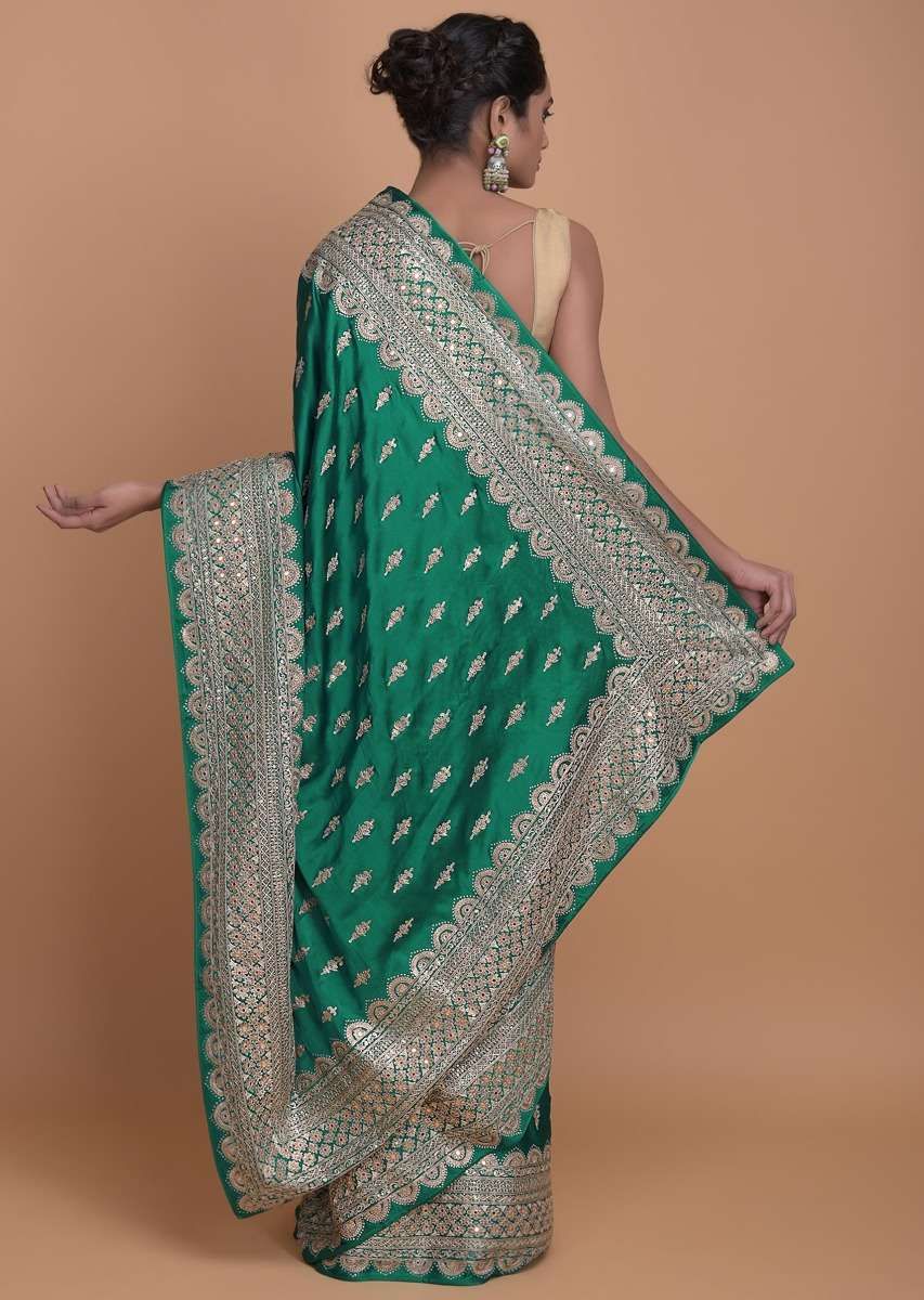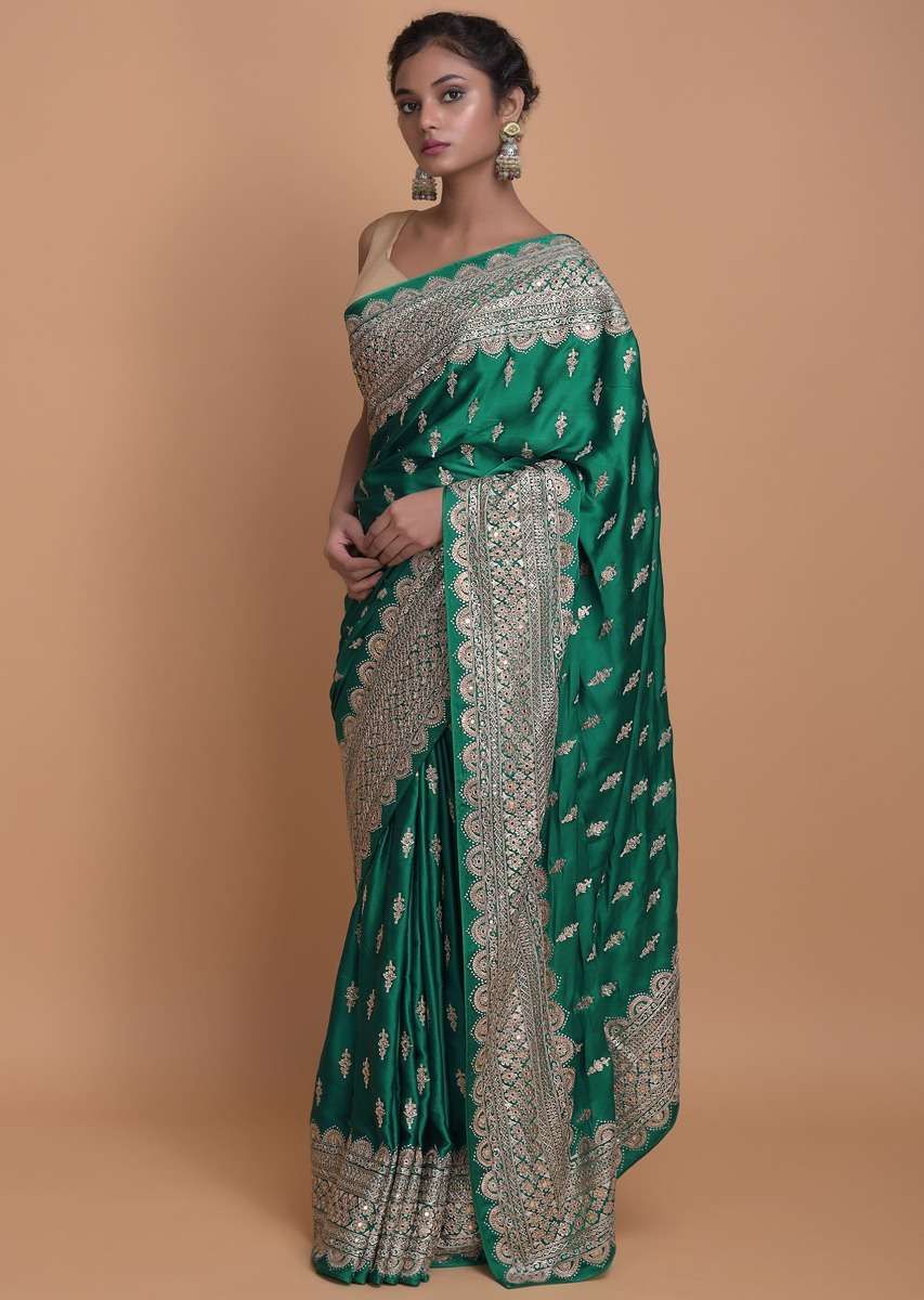 Emerald Green Saree In Satin With Zari Embellished Buttis Online - Kalki Fashion