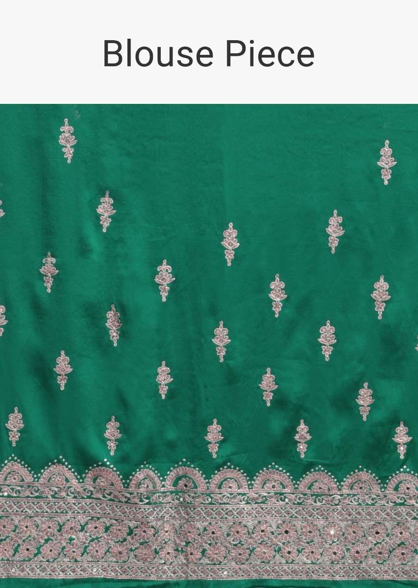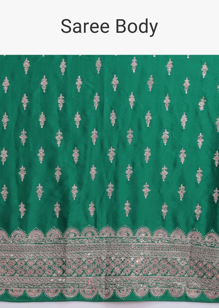Emerald green saree in satin with zari embellished buttis. Border adorned with zari, mirror and sequins in floral pattern. It comes with a matching unstitched blouse piece with similar embroidery... More Product Details