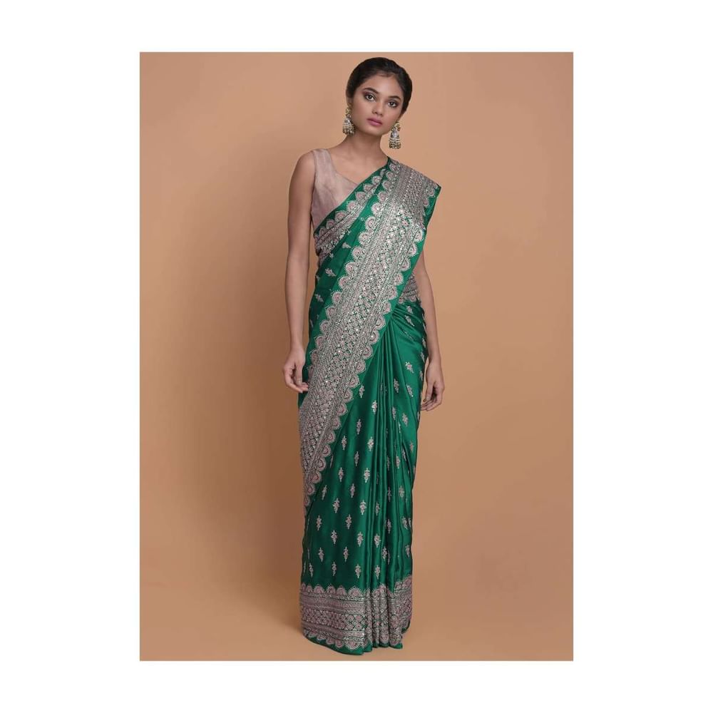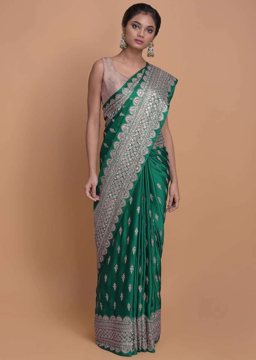 Emerald green saree in satin with zari embellished buttis. Border adorned with zari, mirror and sequins in floral pattern. It comes with a matching unstitched blouse piece with similar embroidery work. The length of the blouse is. Awarded As The Most Trusted Brand We'Re Delivering Styles You Love Just As Promised.