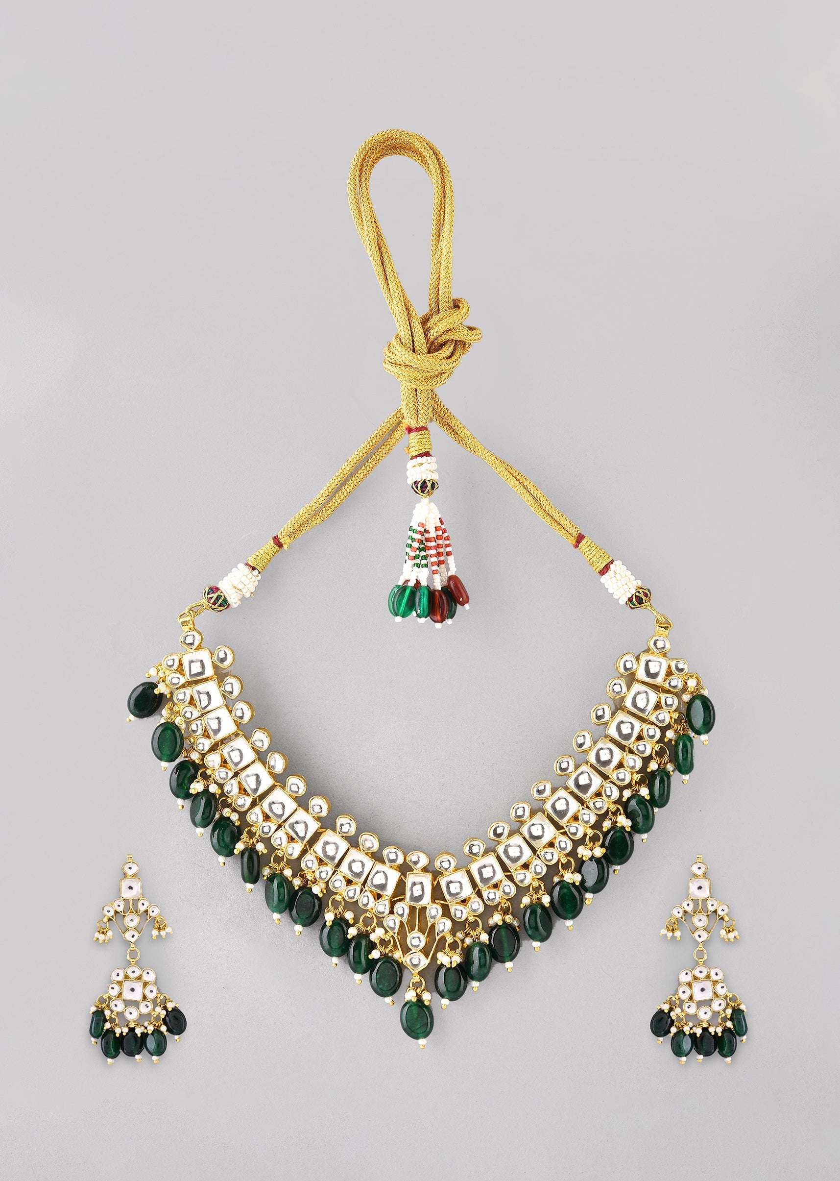 This emerald green and white necklace set features exquisite pachi kundan work for a vibrant and festive appeal. Perfect for mehendi and reception ceremonies, it is ideal for bridesmaids or guests attending a wedding. The rich emerald and crisp white tones combined with detailed craftsmanship create a statement piece that enhances elegance and complements traditional attire beautifully. Designed to make special occasions memorable, this set ensures a standout presence.Awarded as the Most Trusted Brand, we're delivering styles you love, just as promised.