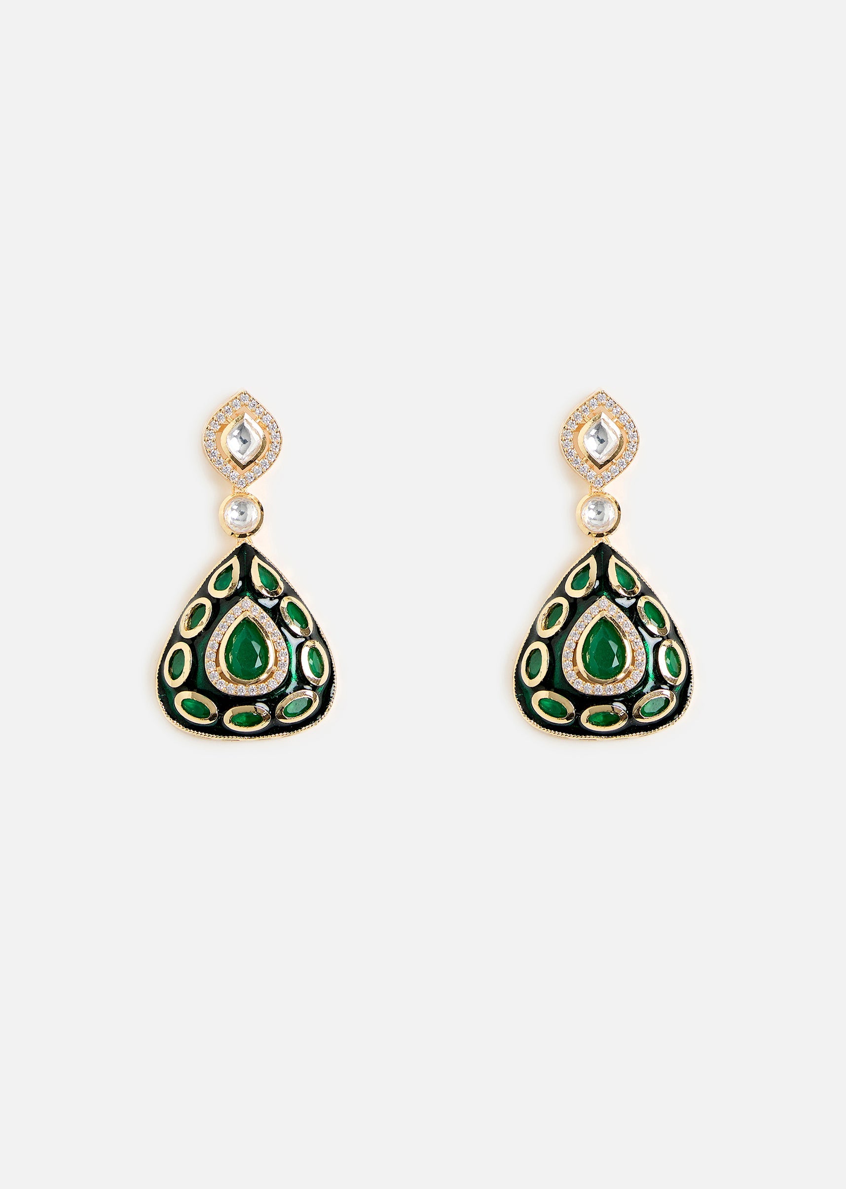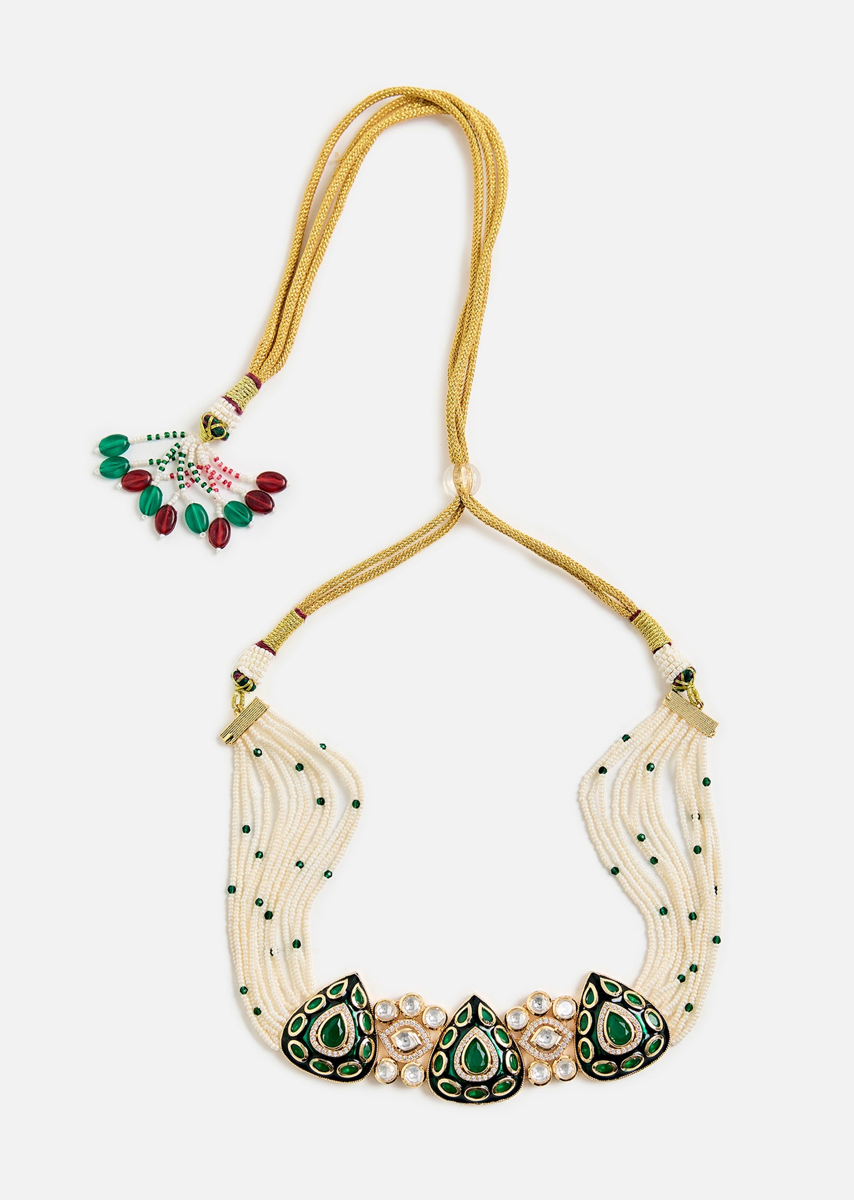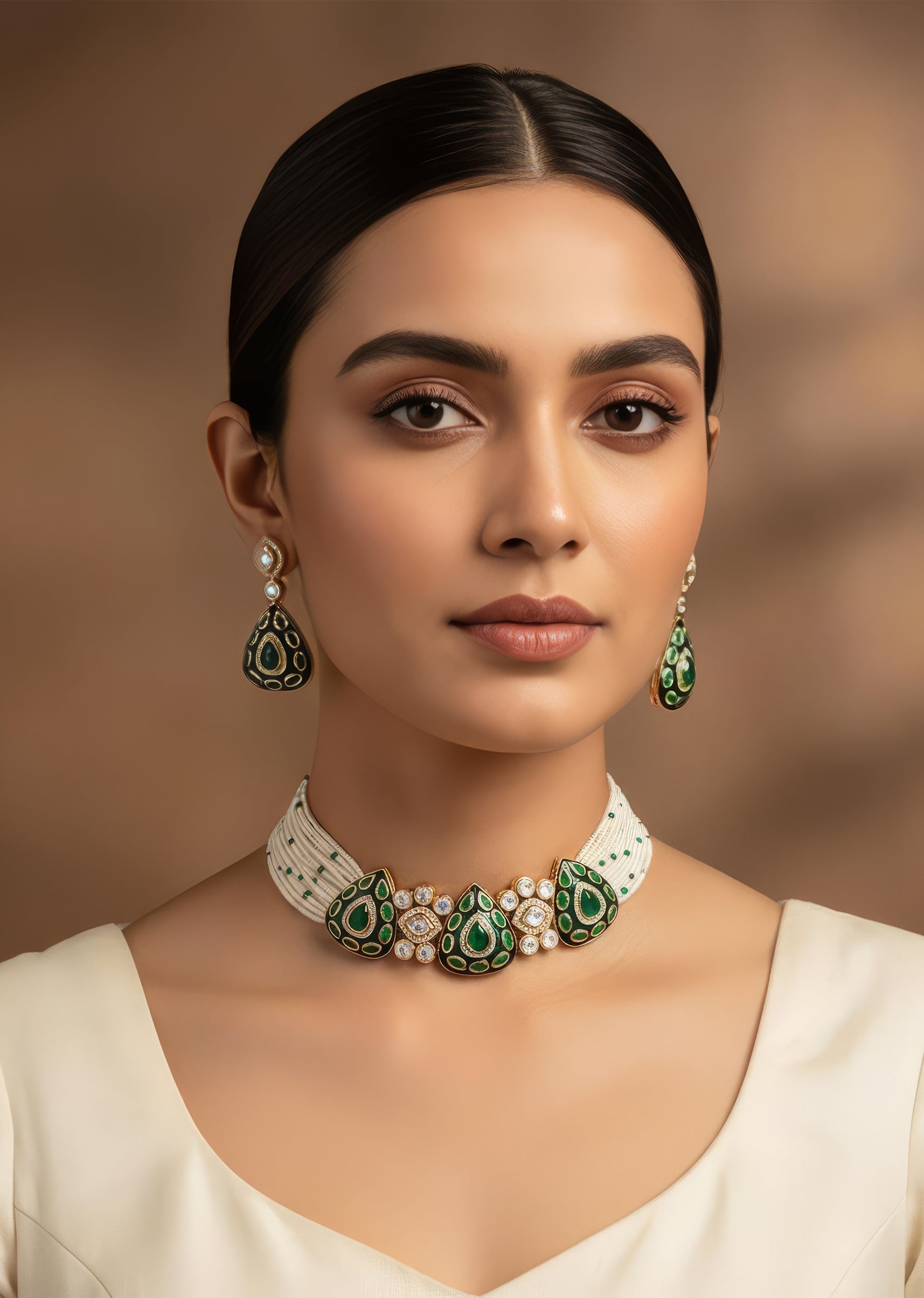 A regal emerald stone choker set featuring dazzling Kundan work and matching earrings. Perfect for weddings and festive occasions, this piece adds a touch of grace and royal charm to any look. Product dimensions may vary slightly. Awarded as the Most Trusted Brand, we're delivering styles you love, just as promised.