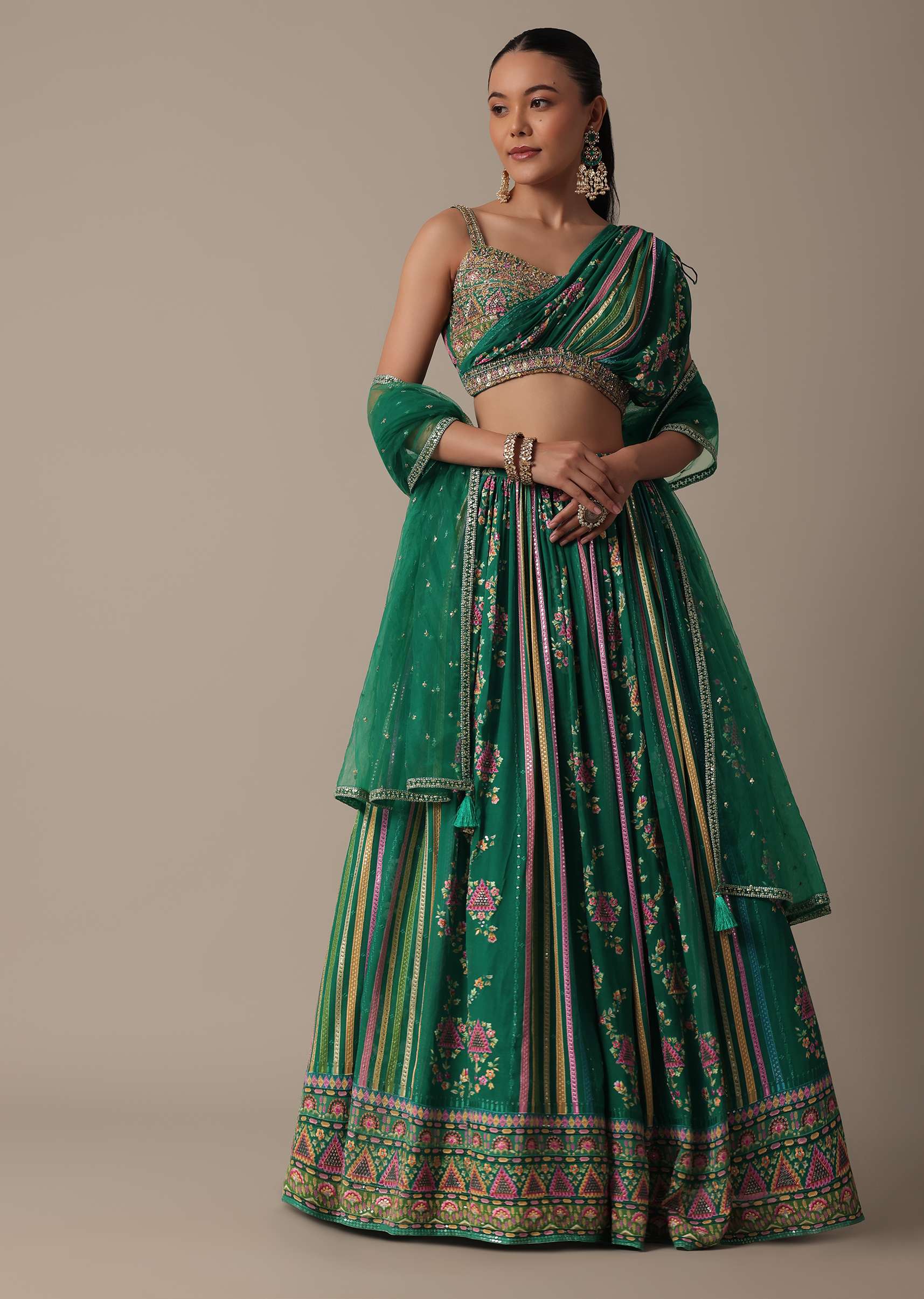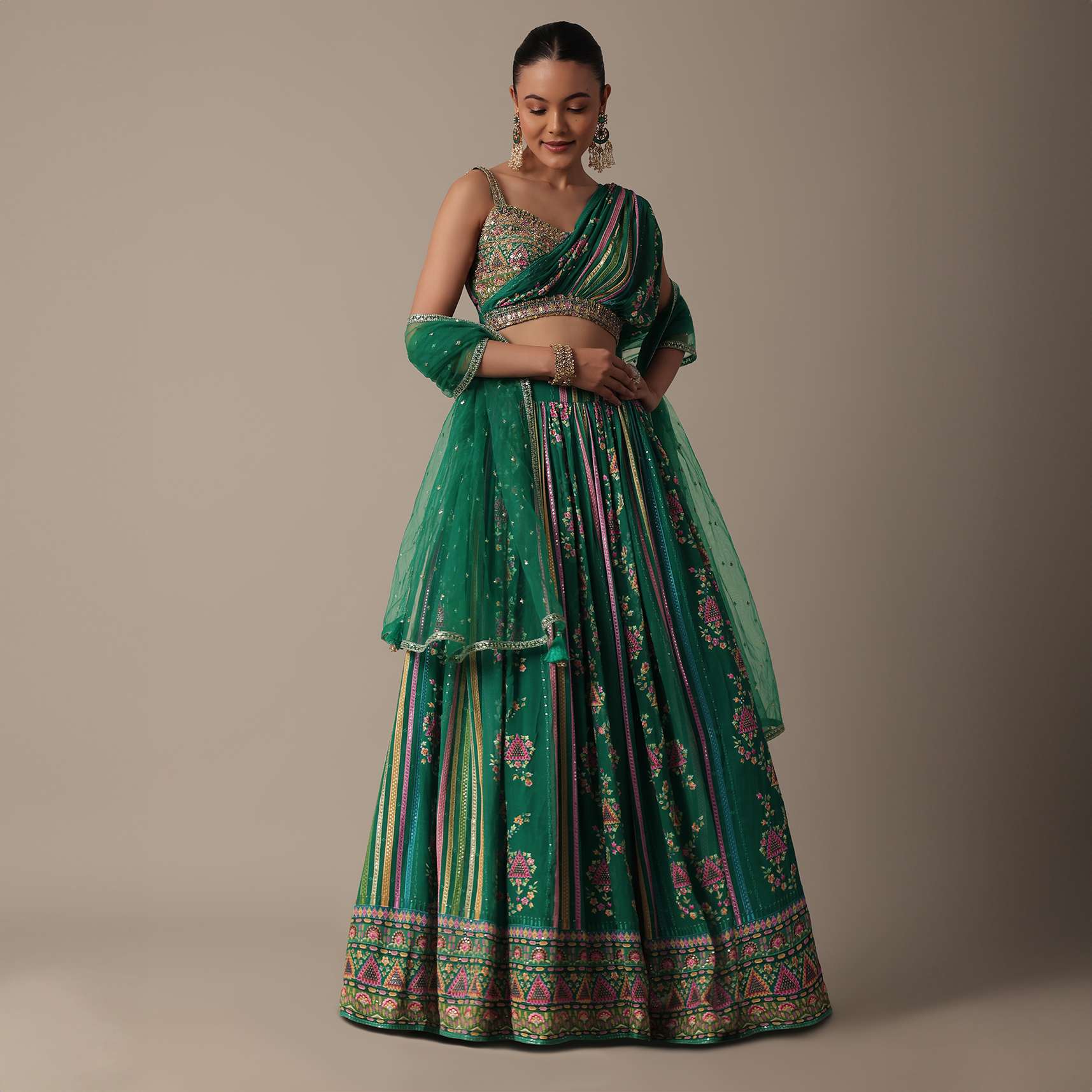 Enhance the charm of this green lehenga set by pairing it with the Emerald Elegance Kadda Bracelet and opting for loose curls to complement the sweetheart neckline.
