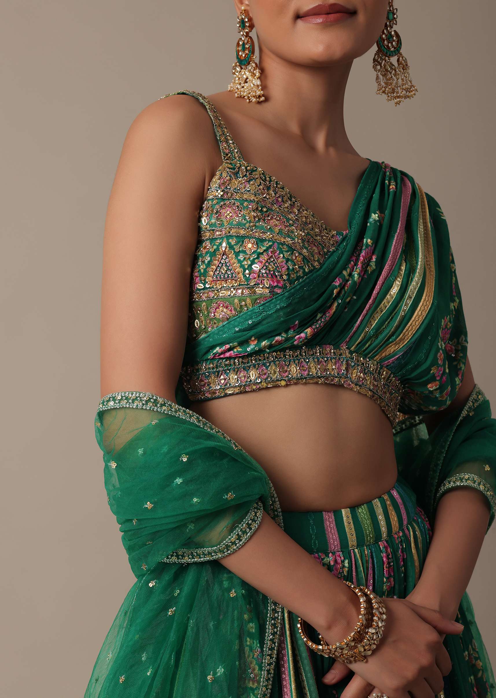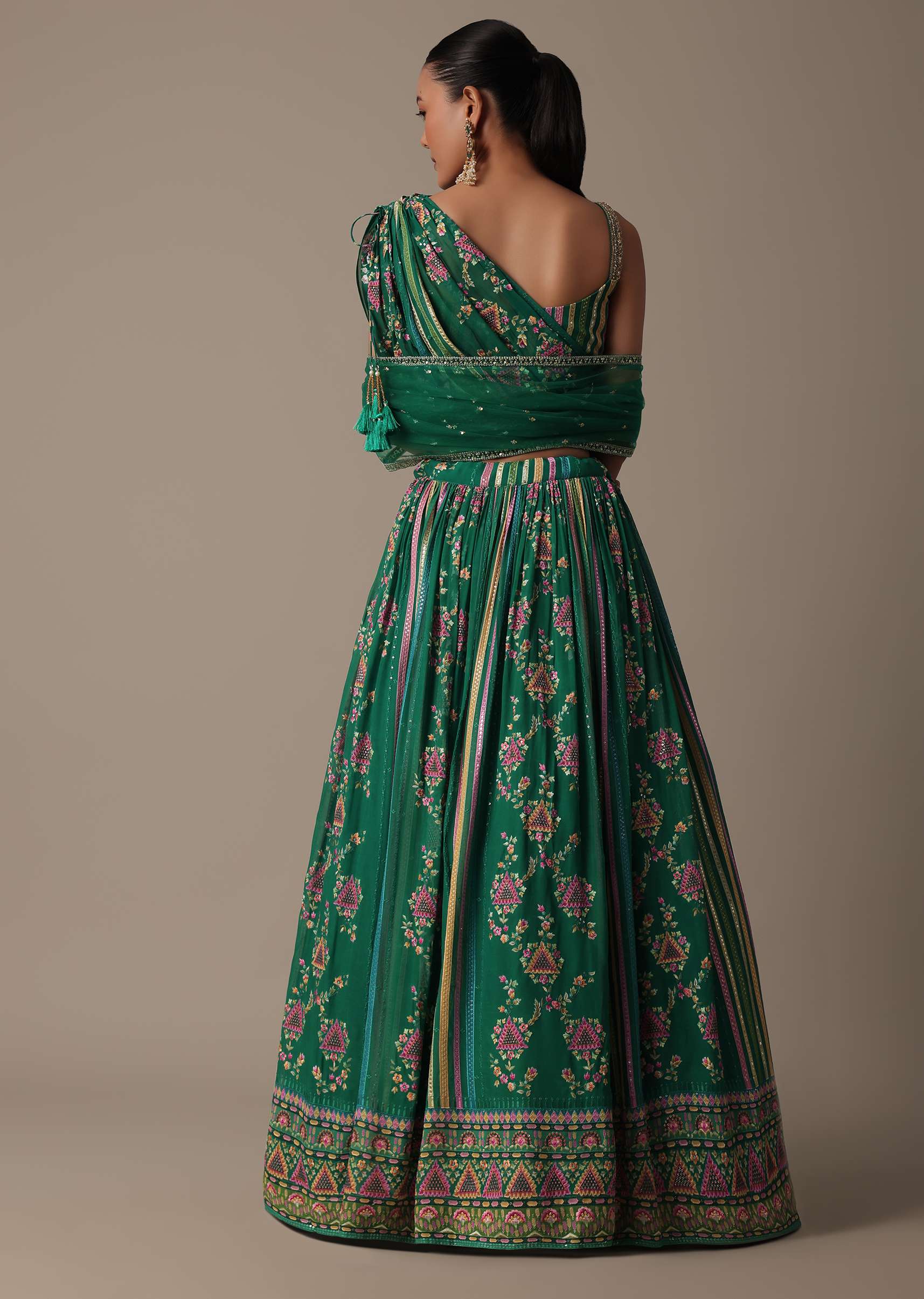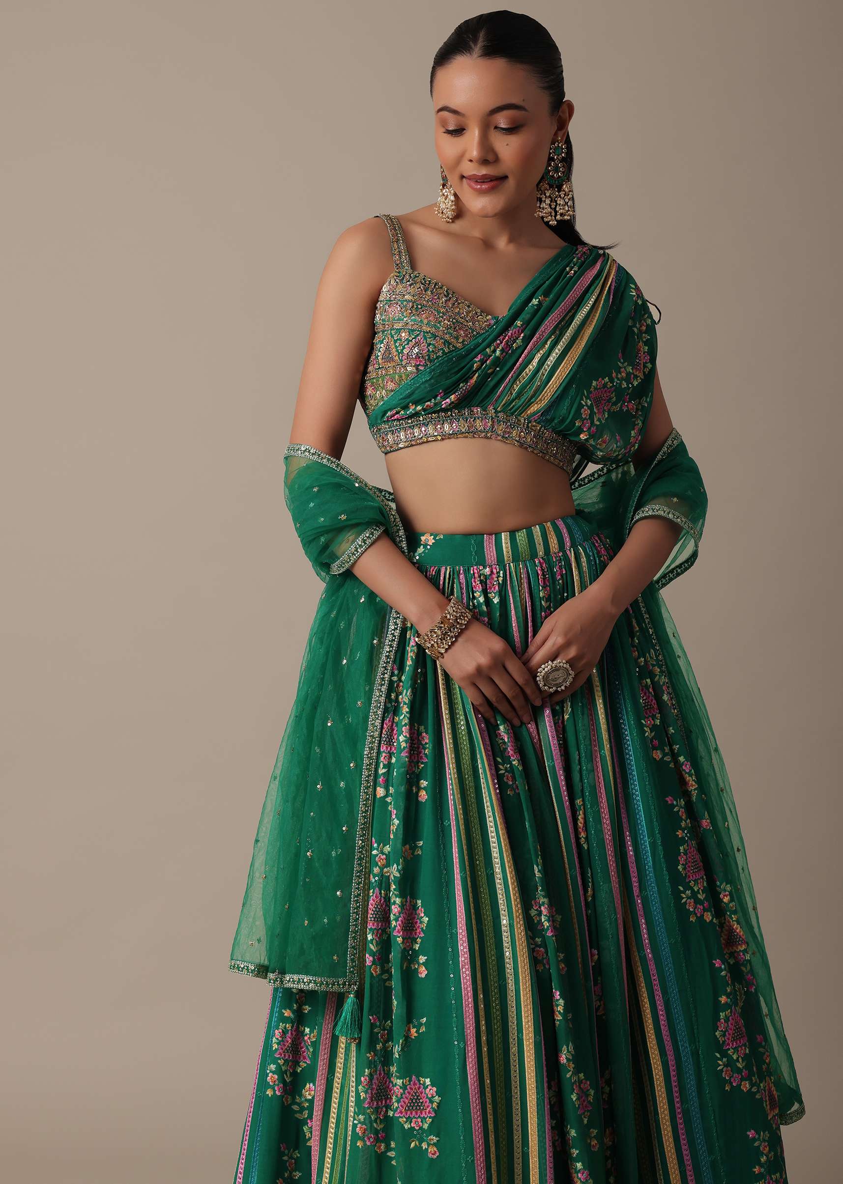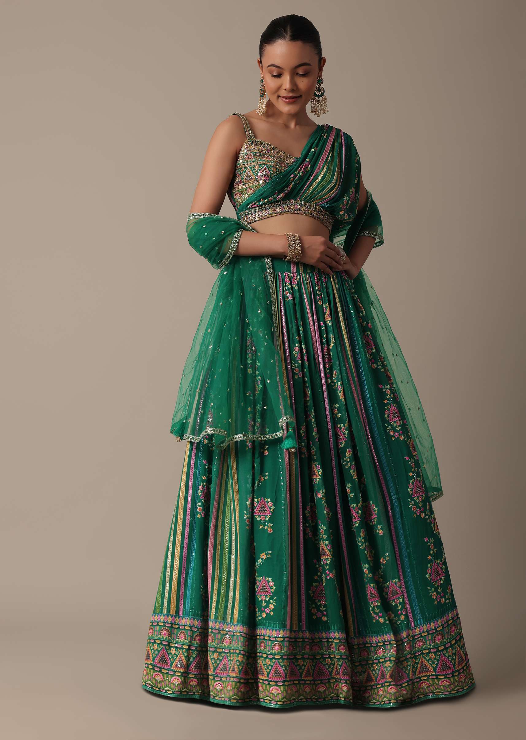 Elevate your bridesmaid style with this Green Printed Lehenga Set. It is adorned with exquisite bead embellishments and intricate embroidery. The georgette ensemble includes a sleeveless choli sweetheart neckline and a net dupatta for a complete wedding look. Awarded as the Most Trusted Brand, we're delivering styles you love, just as promised.