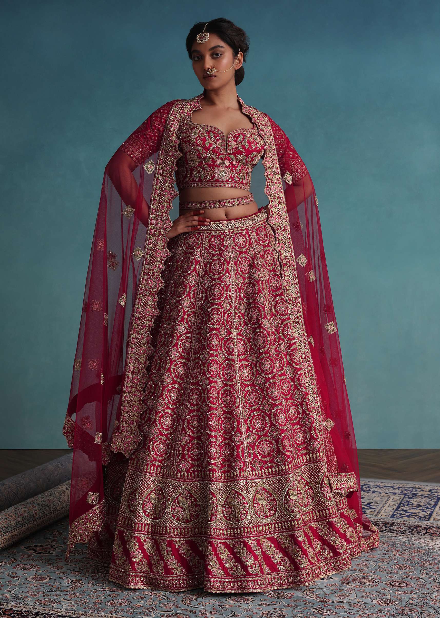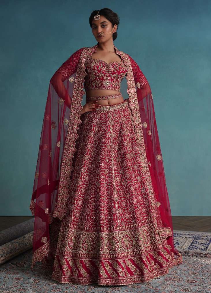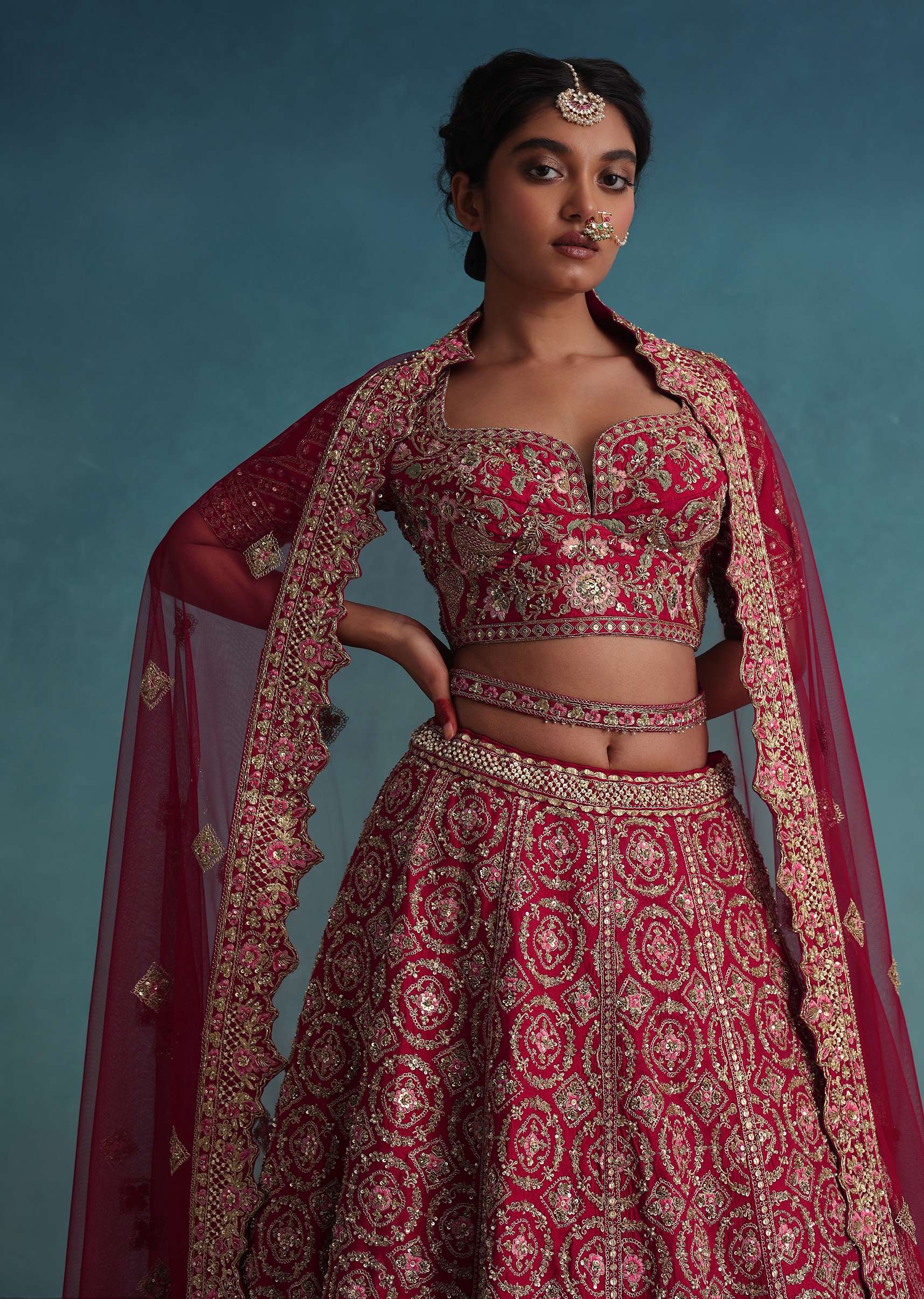 Fiery Red Embroidered Bridal Lehenga In Raw Silk With Hand Embroidery