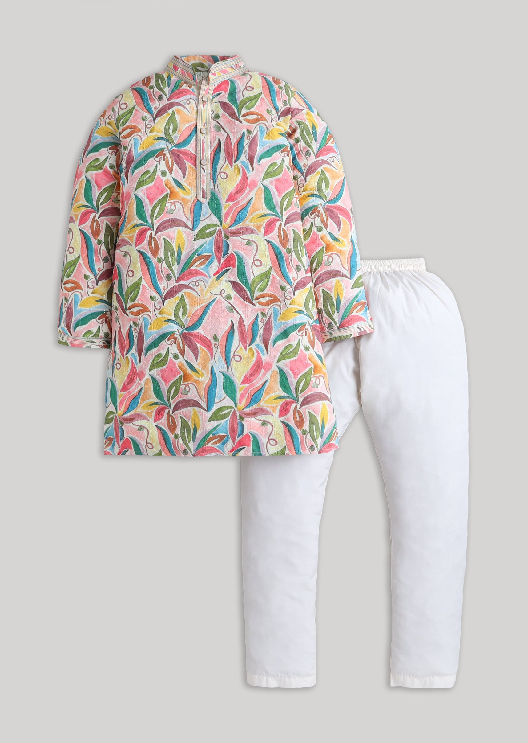 Made in breathable cotton, this festive kurta set features subtle sequin accents and a charming floral-inspired look. The mandarin collar and full sleeves maintain a classic appeal, while the matching... More Product Details