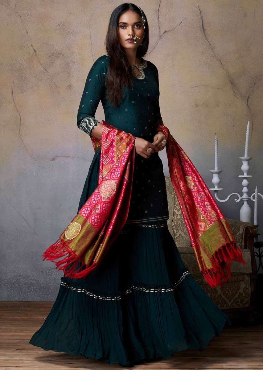 Forest green sharara suit in silk with badla work buttis.Enhanced with zari, zardozi, mirror, sequins and French knots on the neckline.Crafted with a round neckline, 3/4th sleeves and cut out... More Product Details