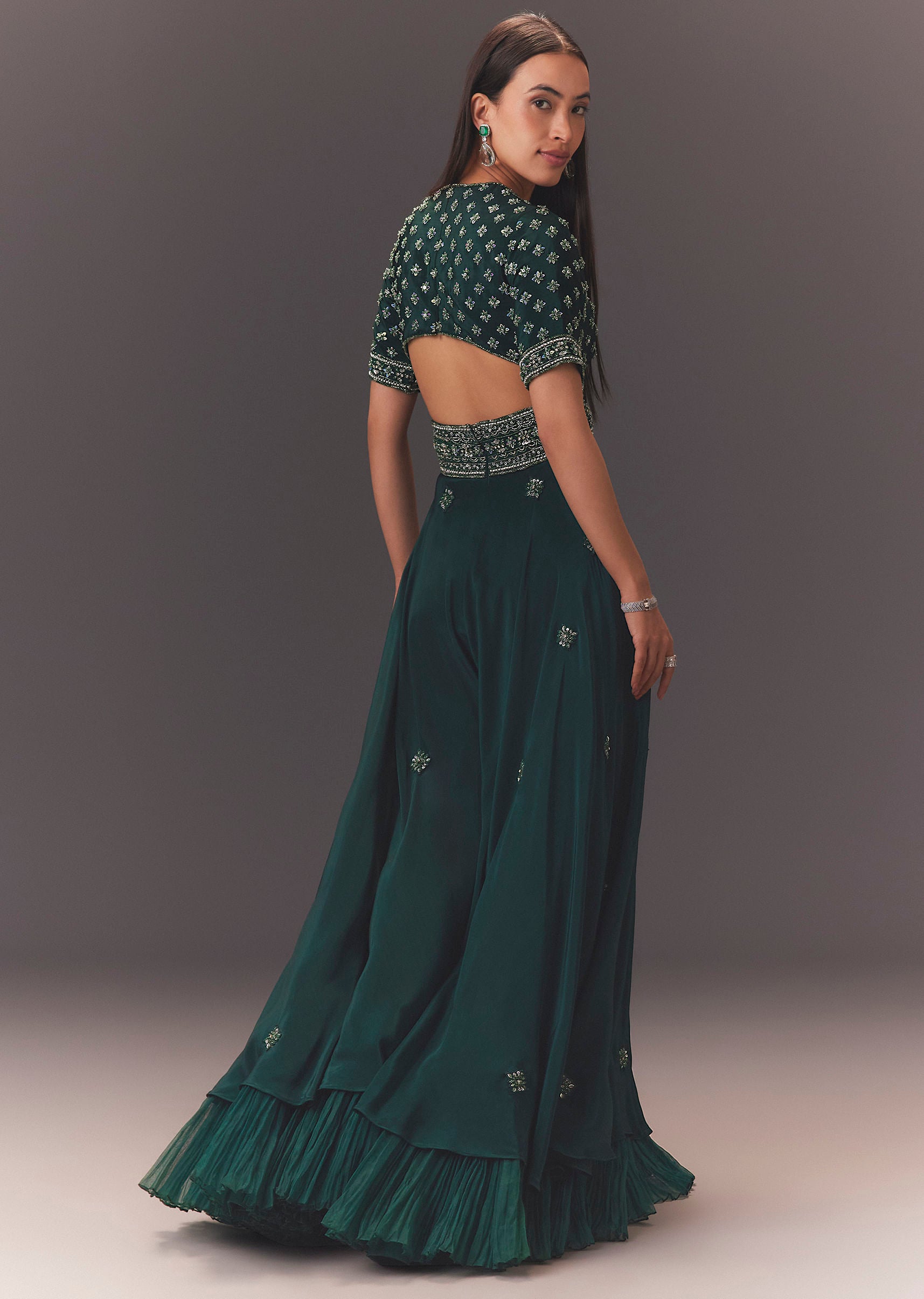 This forest green jumpsuit features a V neck blouse with a broad belt and sharara style pants.Butti accents add unique detailing while the layered design creates a flowy silhouette.Perfect for... More Product Details