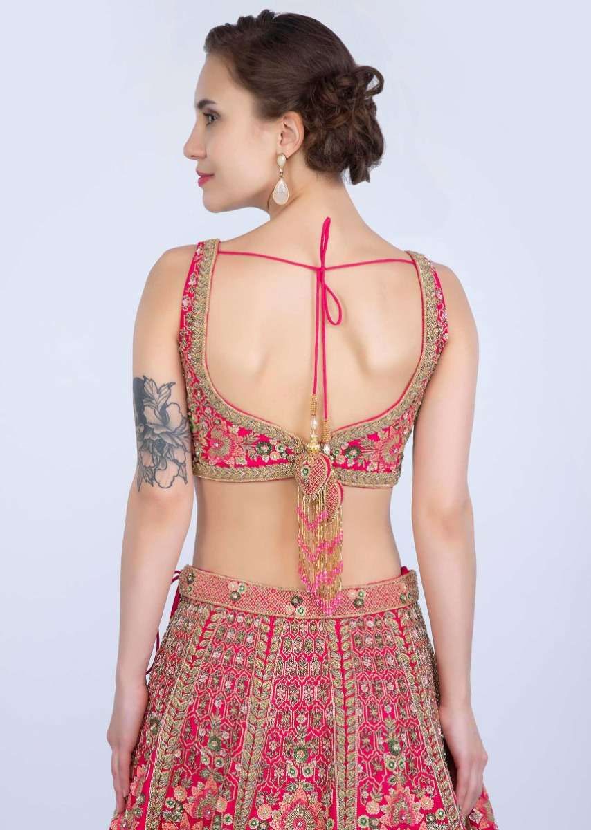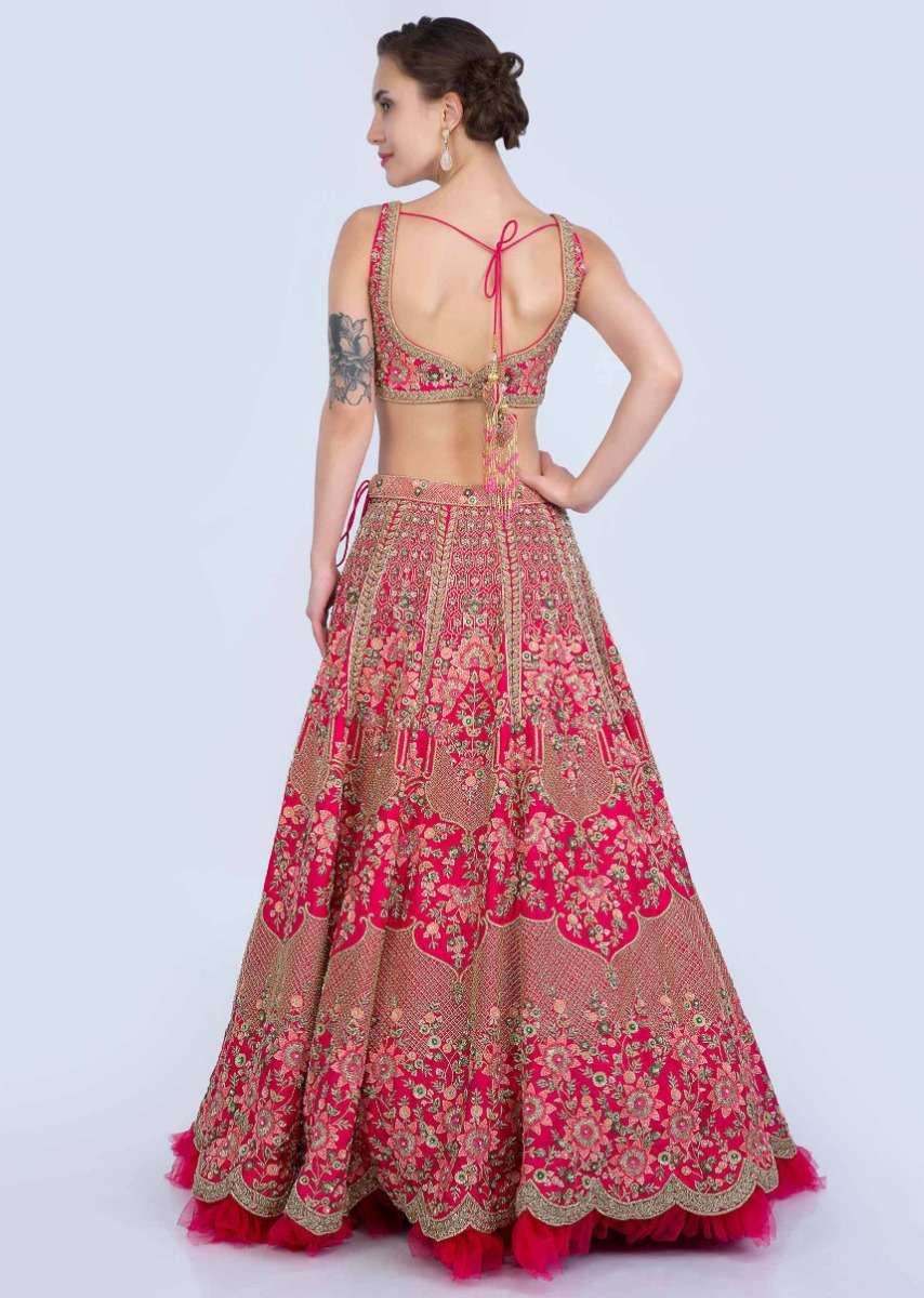 French pink raw silk heavy embroidered lehenga with net ruching. Densily embellsihed with multi color resham, sequins, cut dana and zardosi work in floral and moroccan motif. Along with cut... More Product Details
