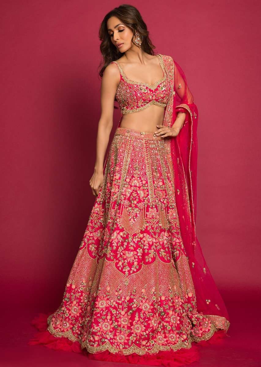Malaika Arora In Kalki French Pink Raw Silk Heavy Embroidered Lehenga With Net Ruching