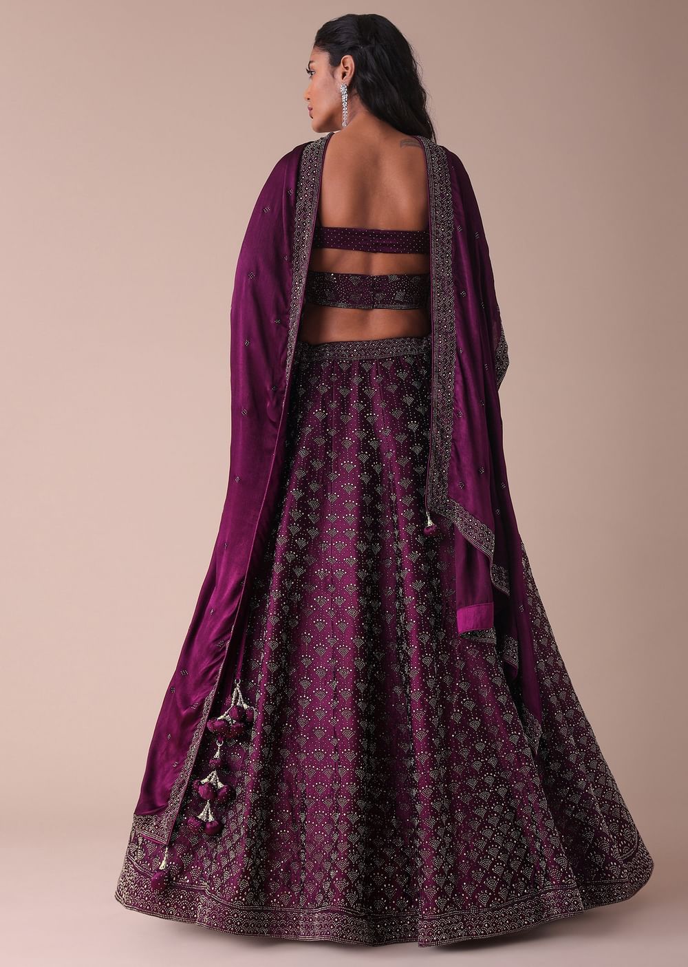 A gorgeous gloxinia purple lehenga set fabricated in a wrinkle satin with swarovski crystals. The embroidered lehenga has beautiful swarovski crystals all over with a side zip closure with a side tassel dori. The dupatta has an enticing embellished border with tassels on the edges. The lehenga comes with an attached cancan and an unstitched blouse. Awarded As The Most Trusted Brand We'Re Delivering Styles You Love Just As Promised.