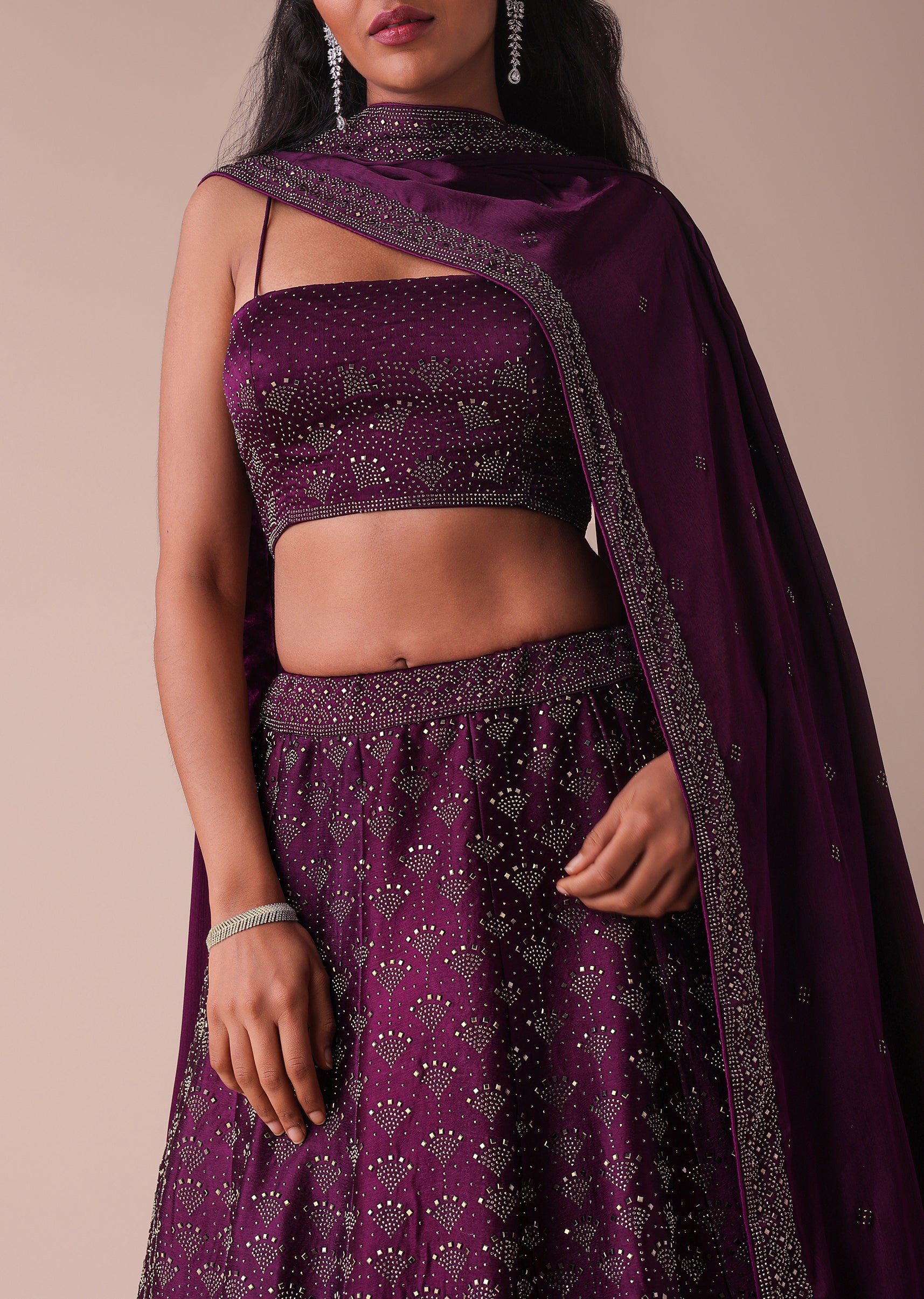 Mulberry Purple Wrinkle Satin Lehenga With Swarovski Crystals