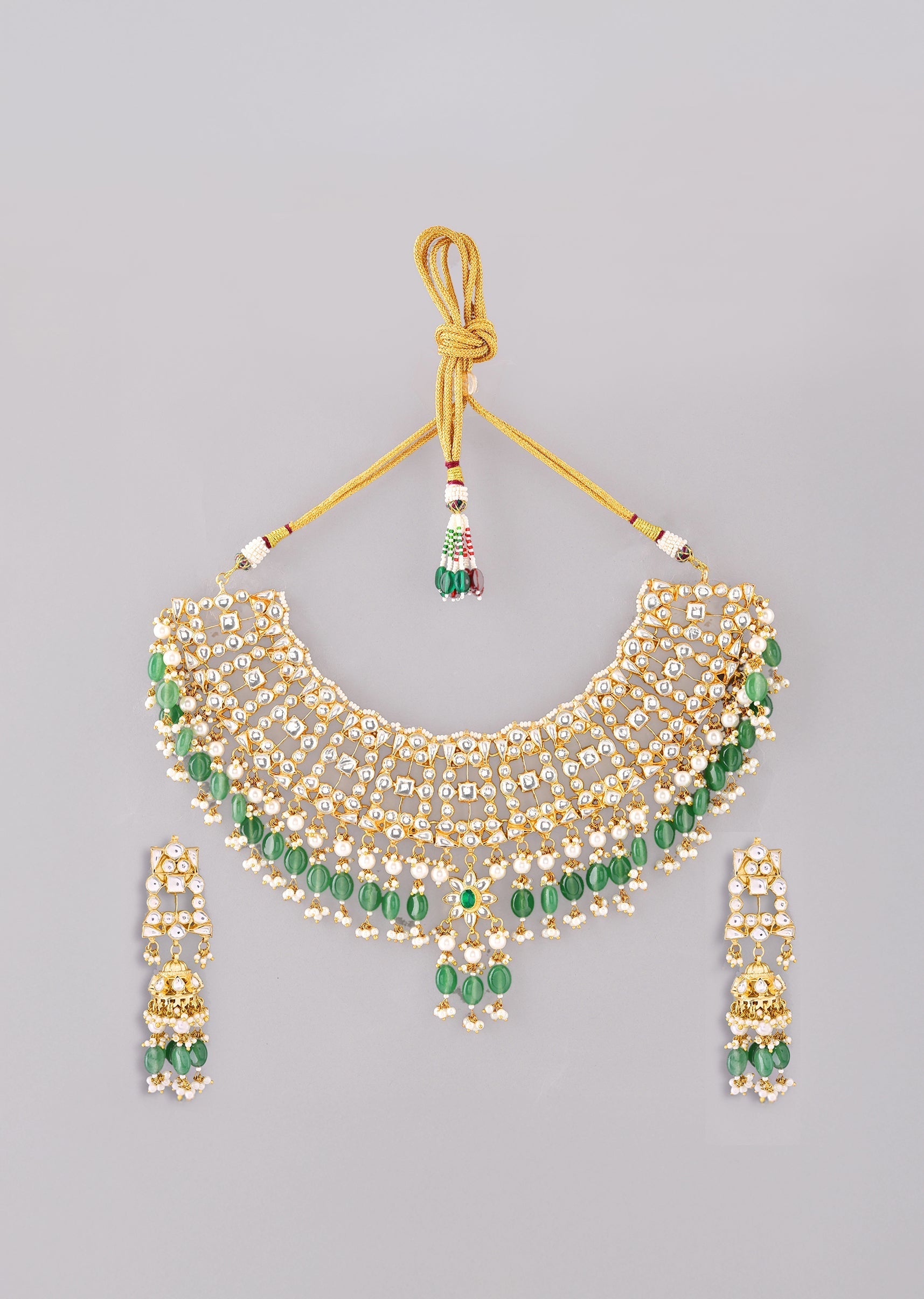 Elevate your lfestive and bridal looks with this green and gold jewellery set, featuring a necklace and a pair of matching earrings crafted with intricate detailing. Perfect for auspicious and... More Product Details