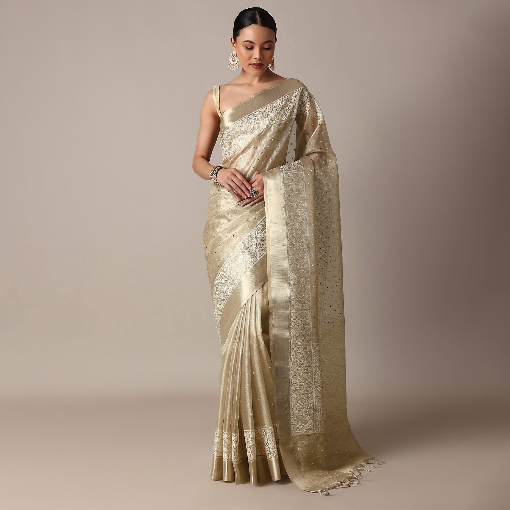 Put forth a royal and stylish look with this luxurious gold and whitehued saree. Tailored from rich chanderi kota silk fabric it is elevated with exquisite allover motifs. Accentuated with meticulous mirror and thread work artistry and a tassel pallu this drape is paired with an unstitched blouse piece. Awarded as the Most Trusted Brand, we're delivering styles you love, just as promised.