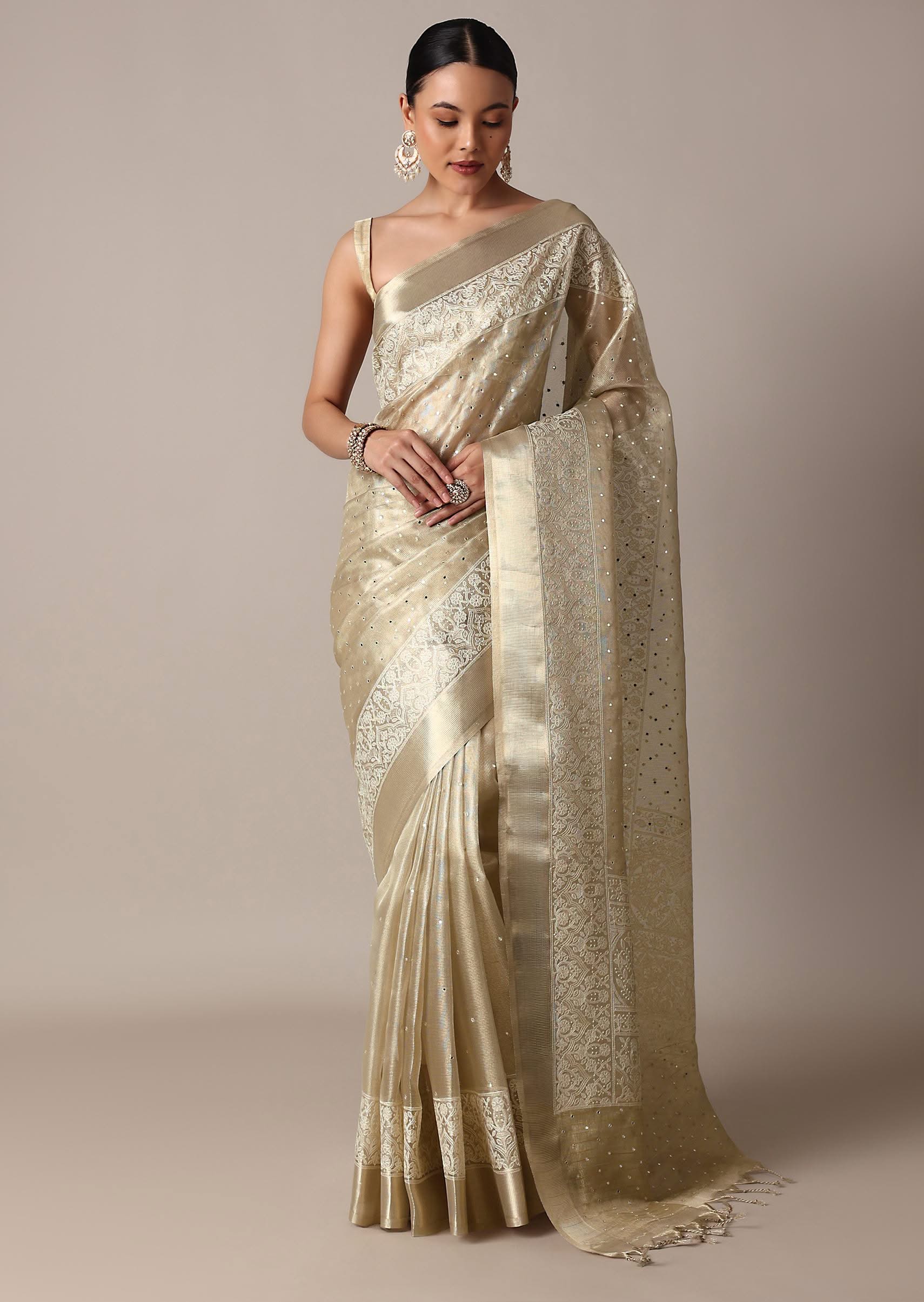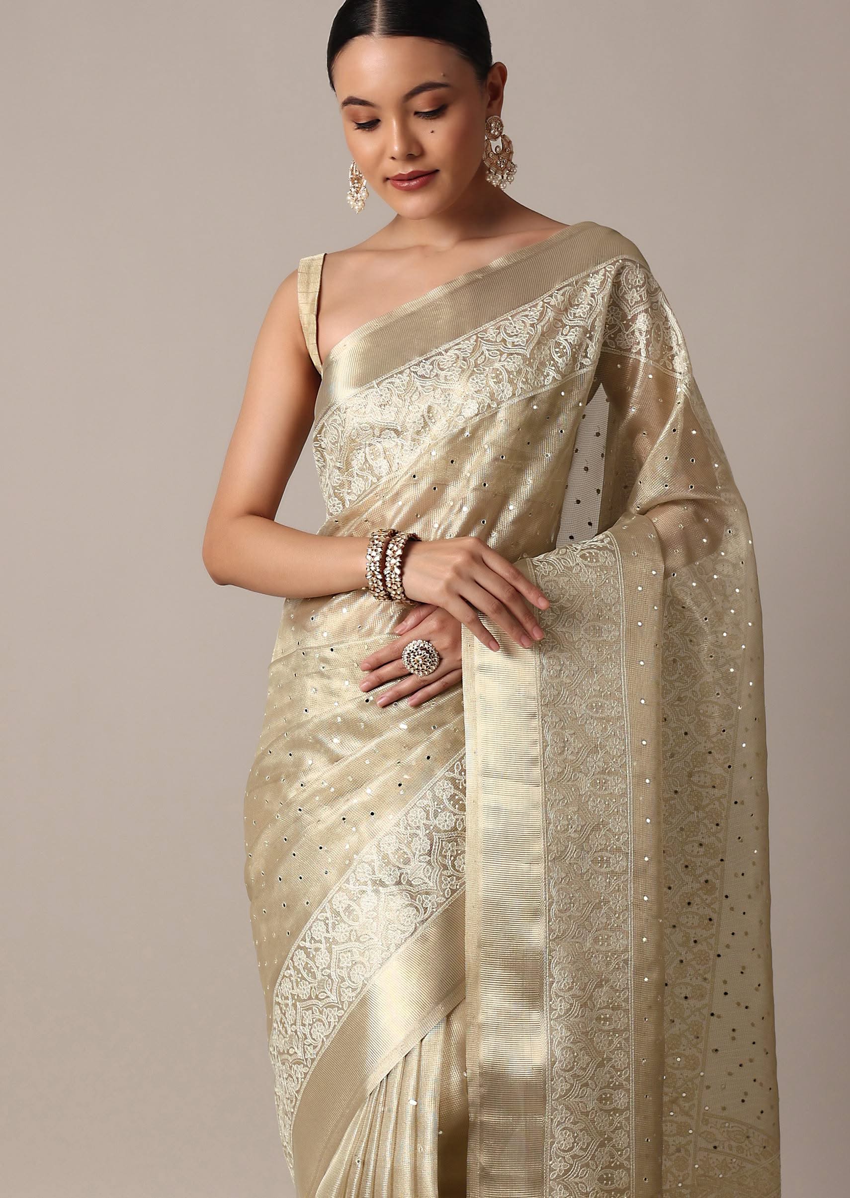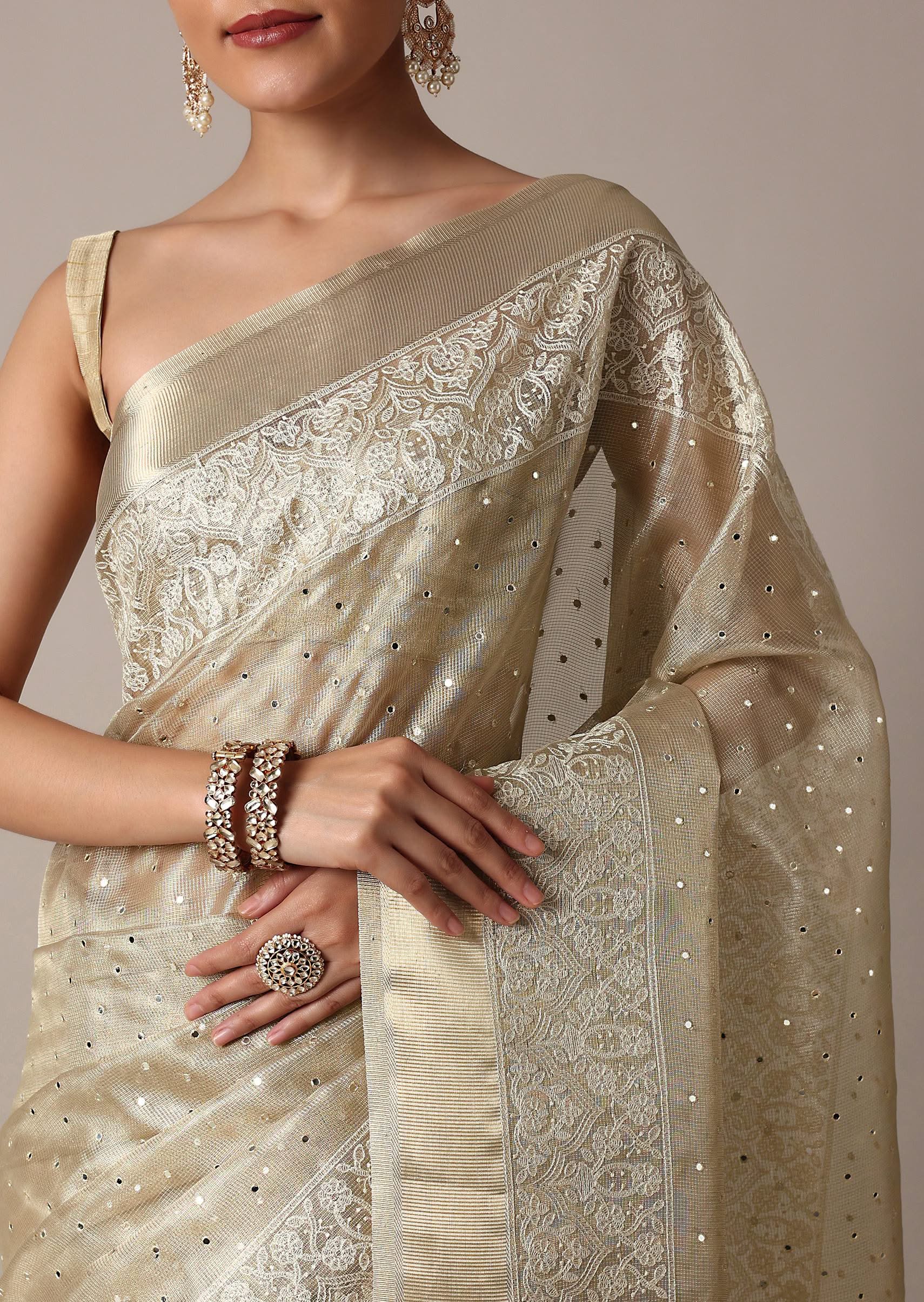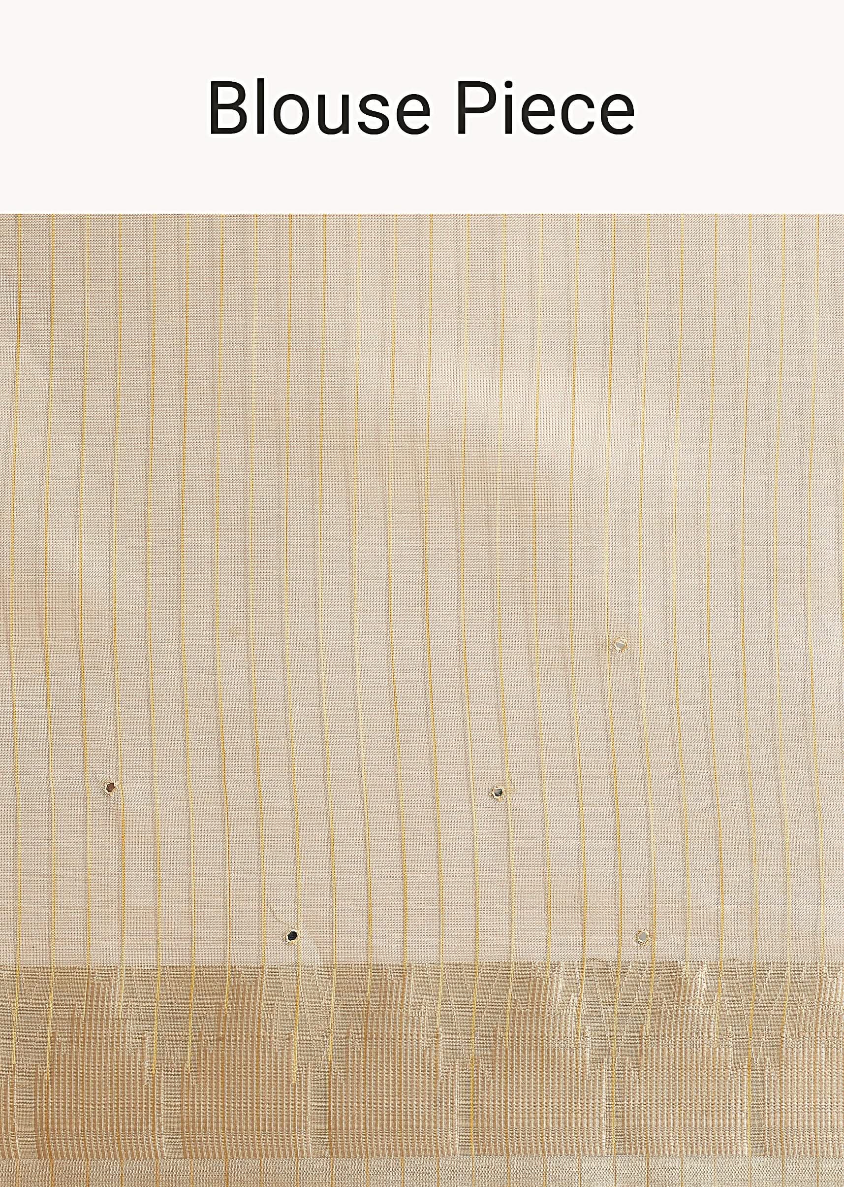 Gold And White Kota Chanderi Kota Silk Saree With Mirror Work And Unstitched Blouse Piece