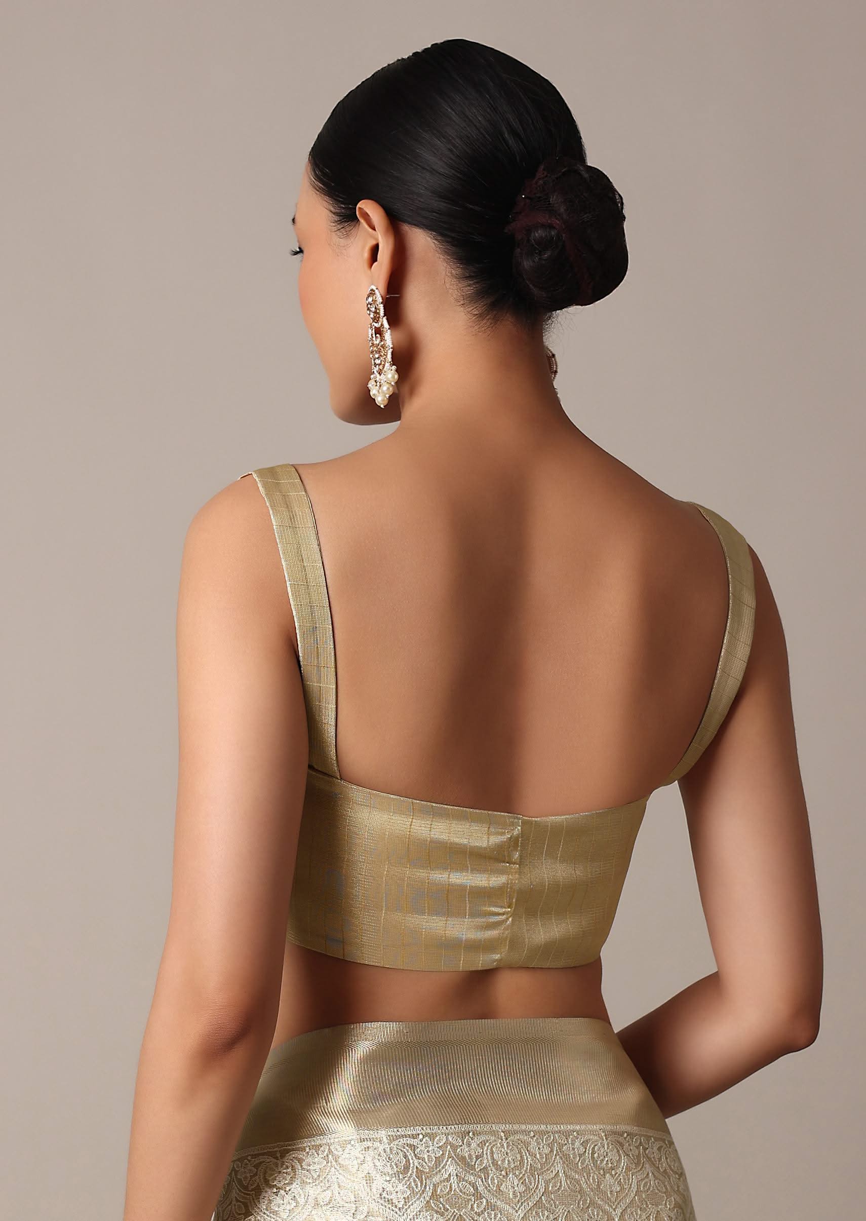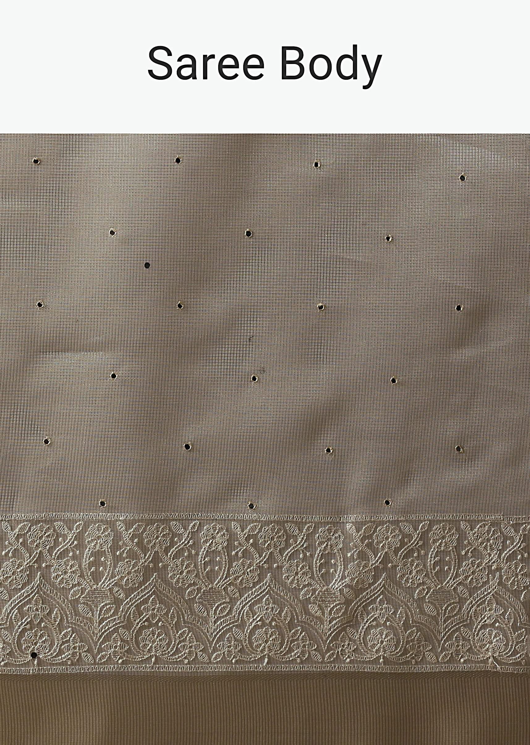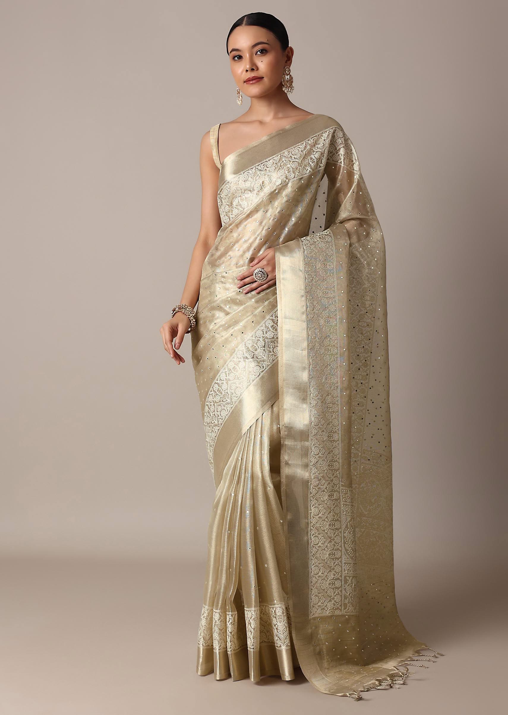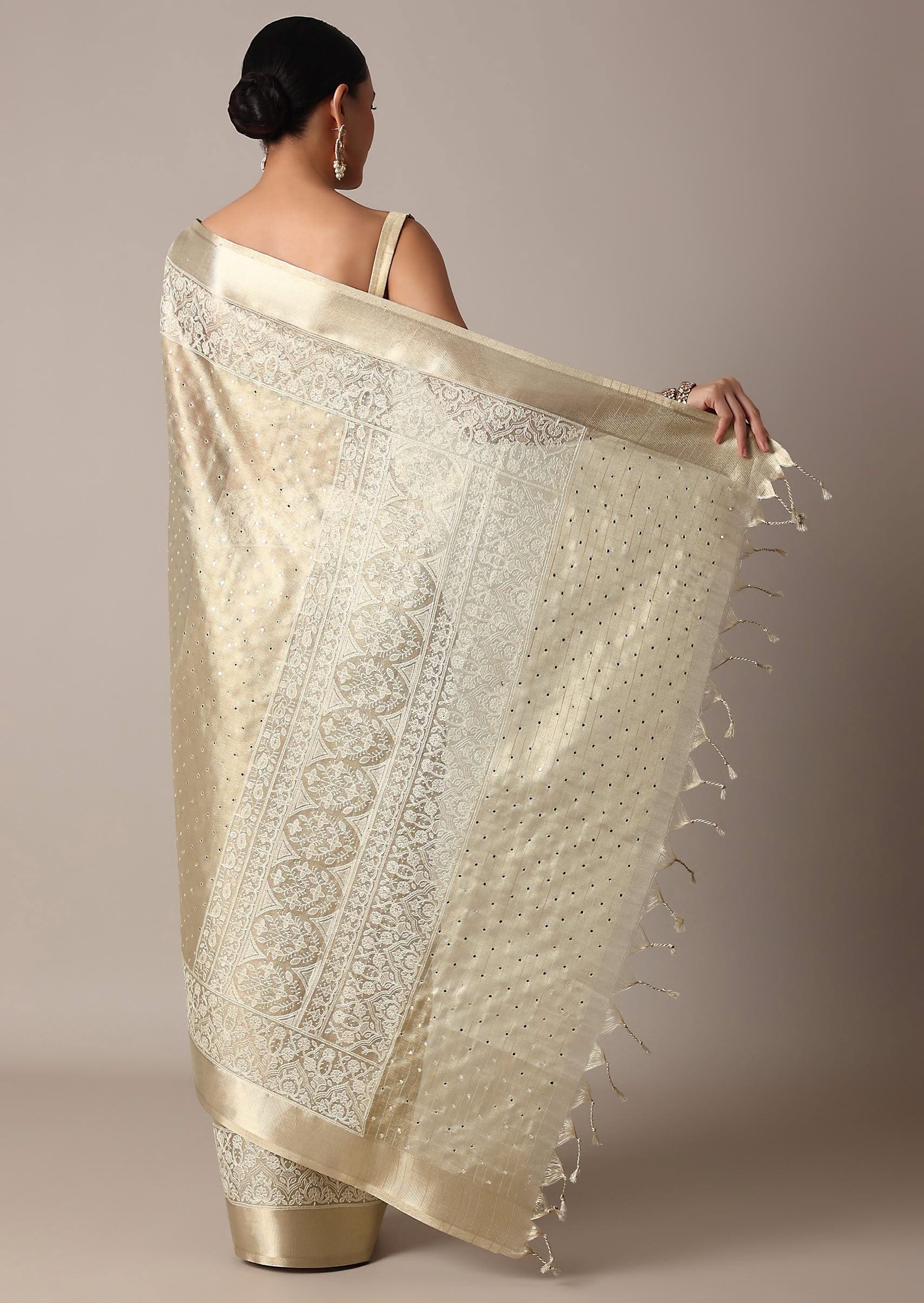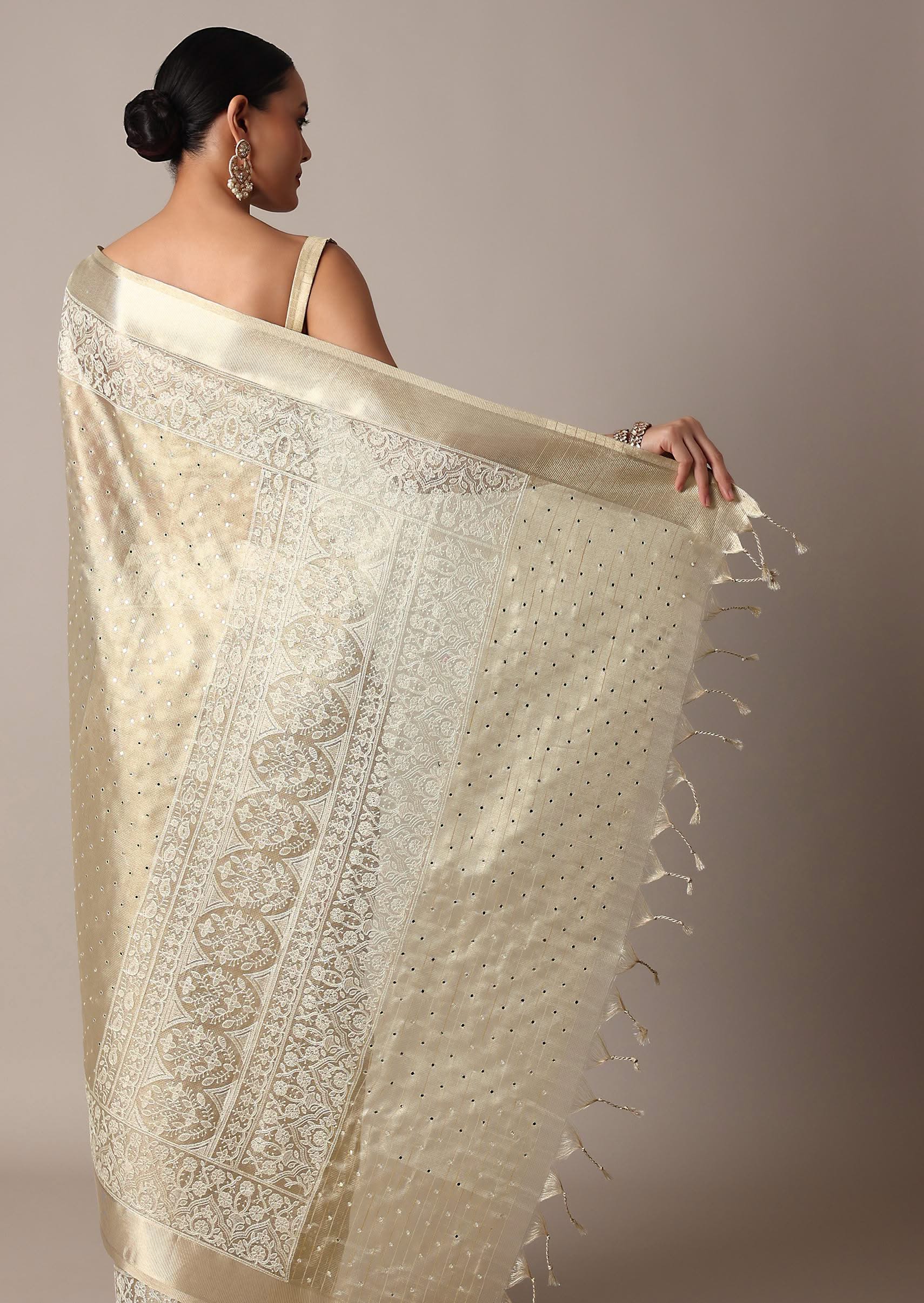Gold And White Kota Chanderi Kota Silk Saree With Mirror Work And Unstitched Blouse Piece
