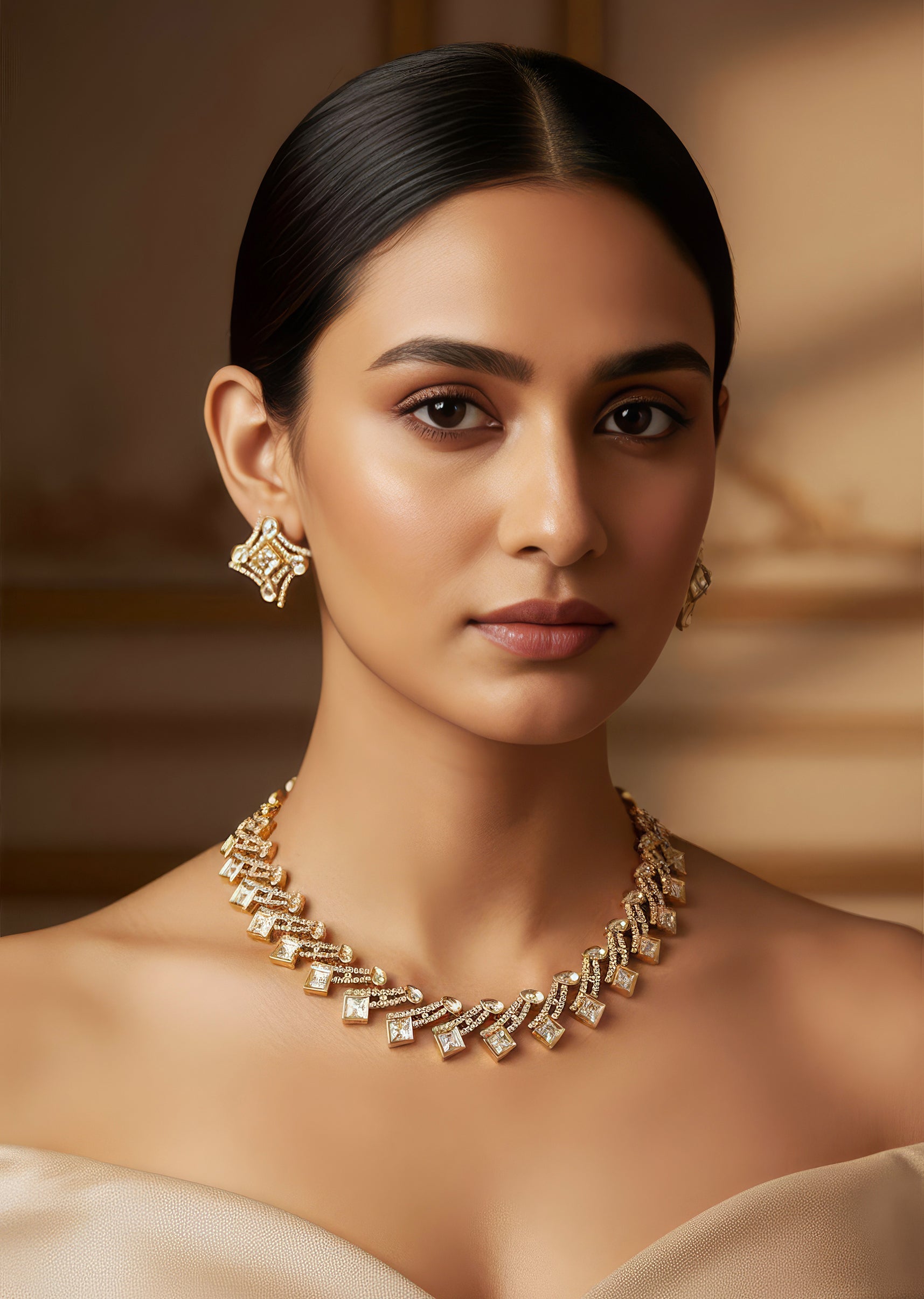 An elegant gold and white necklace set crafted with Polki uncut diamonds using the timeless Kundan Jadau technique. Handcrafted with precision, this versatile piece adds a subtle festive glow, making... More Product Details