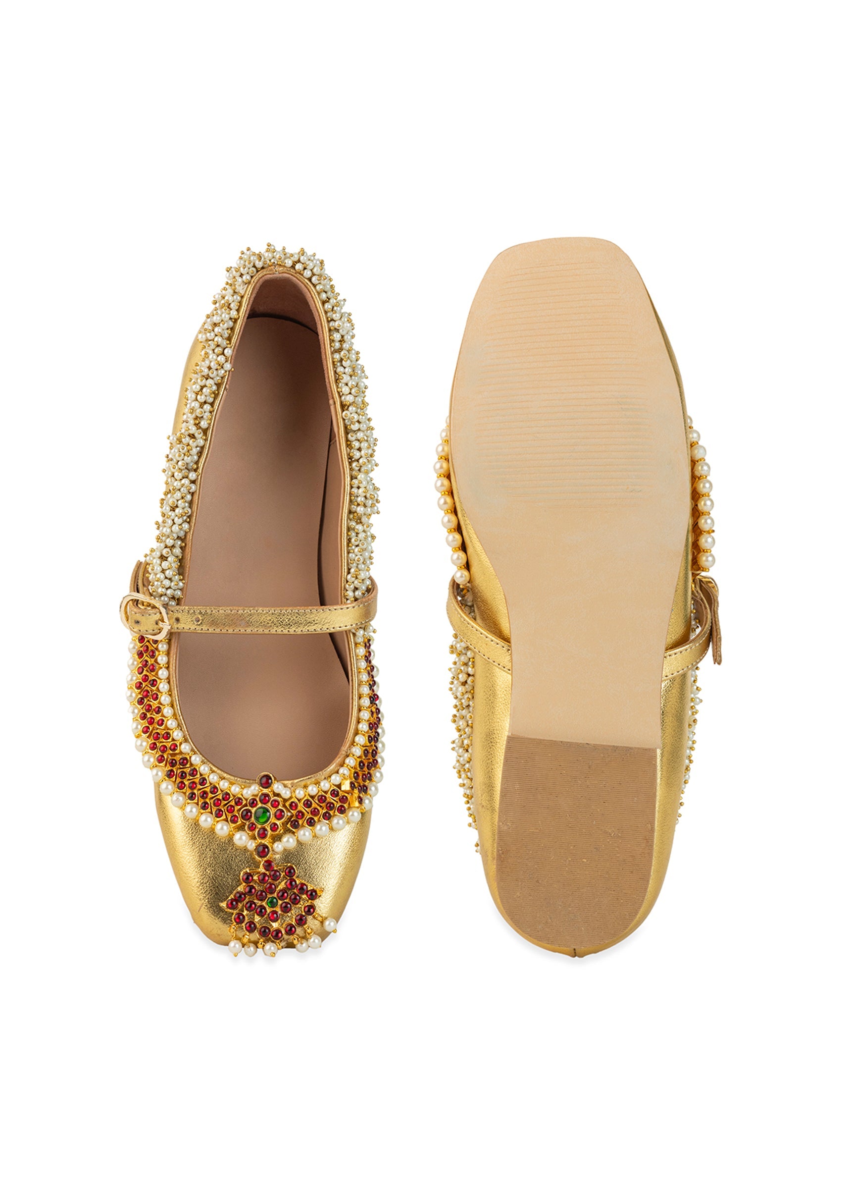 Turn every entrance into a statement with gold juttis decorated in a striking blend of pearls, ruby toned crystals, and antique beads that sparkle like festive treasures. Set on smooth... More Product Details