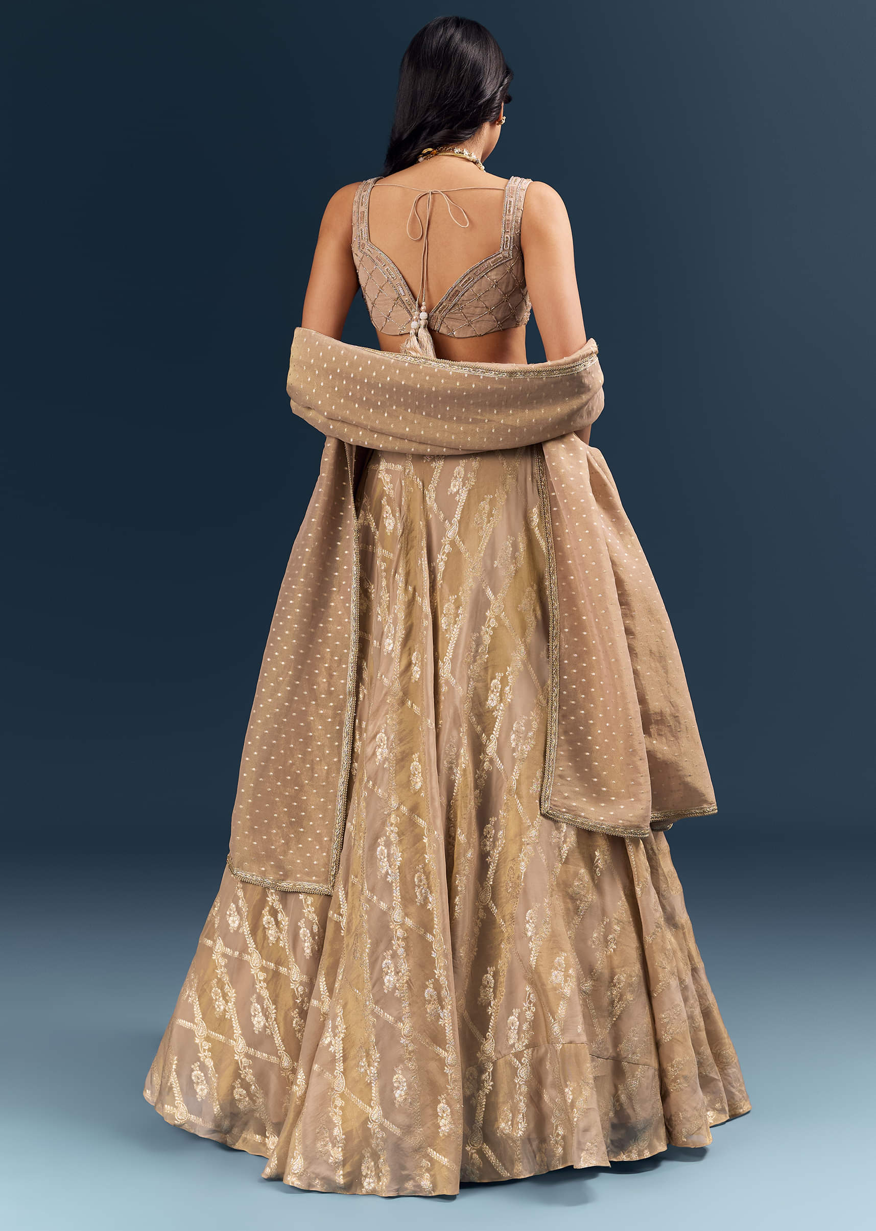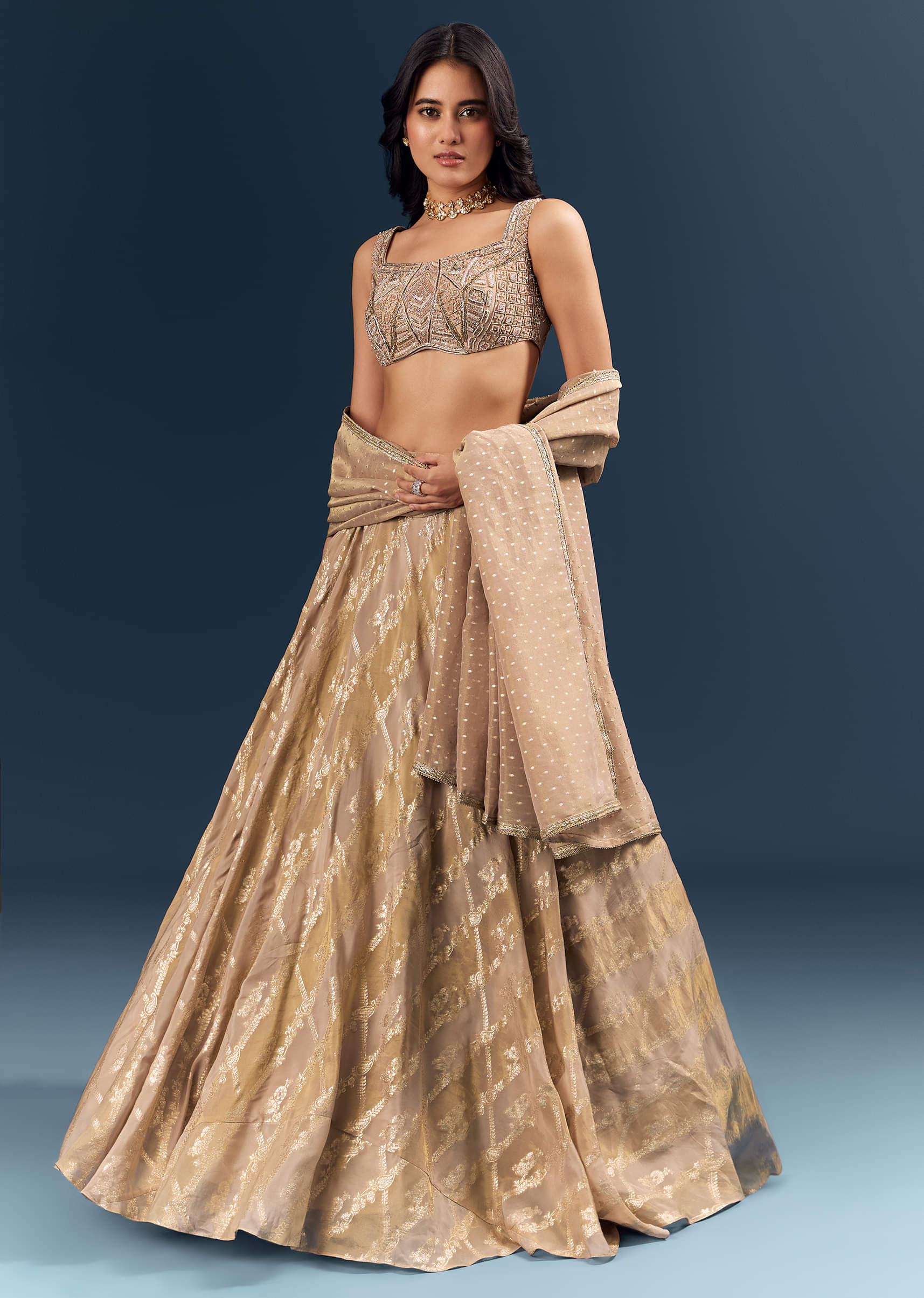 Even before the music starts, this gold banarasi silk bridesmaid lehenga sets an opulent, evening-ready tone. Hand embroidery lays down sequin sparkle with bead depth and a neat lace finish... More Product Details