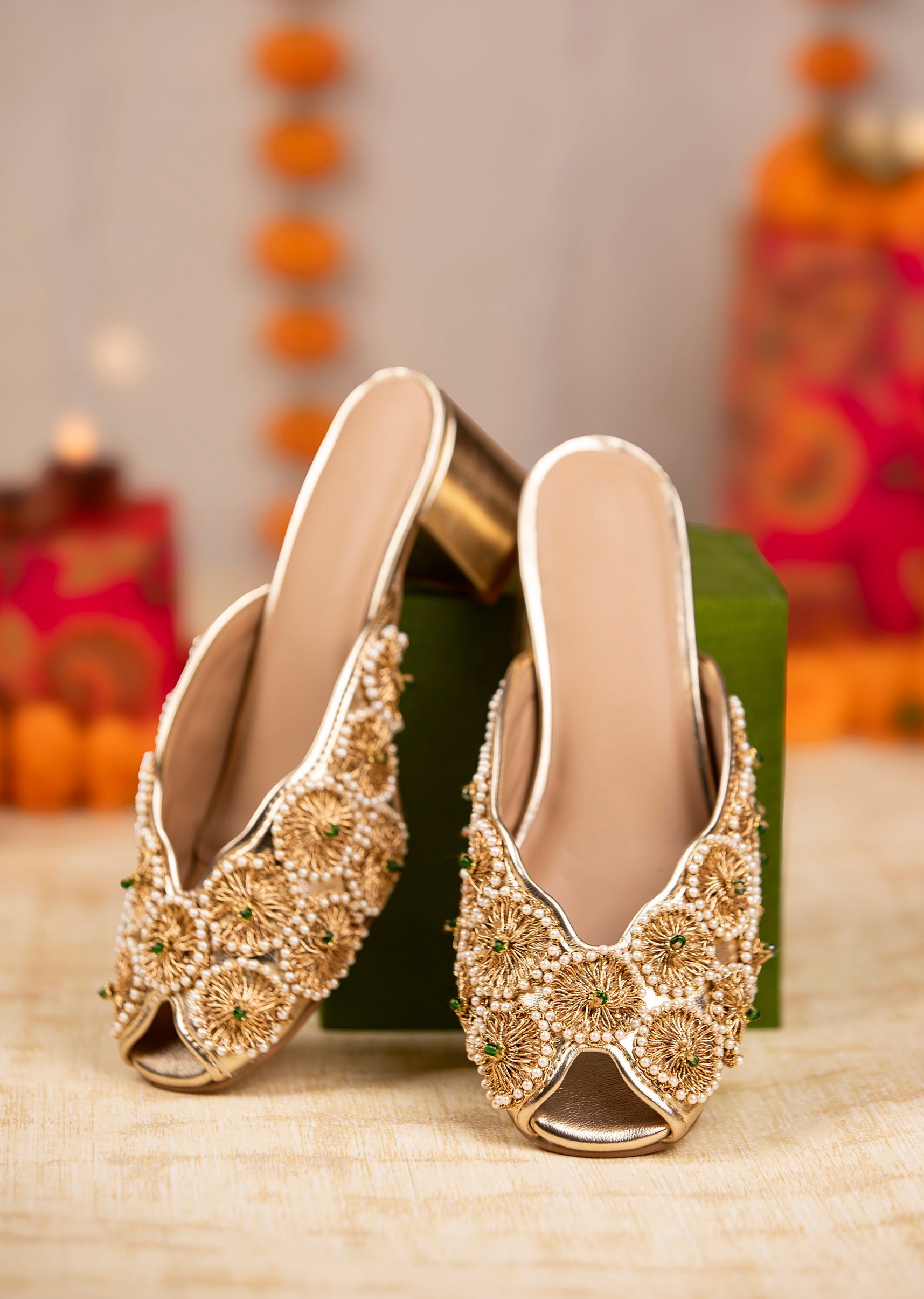 Step into elegance with gold mules featuring intricate floral embroidery crafted in shimmering gold threads and highlighted with delicate green bead accents that add a refreshing pop of color. Set... More Product Details