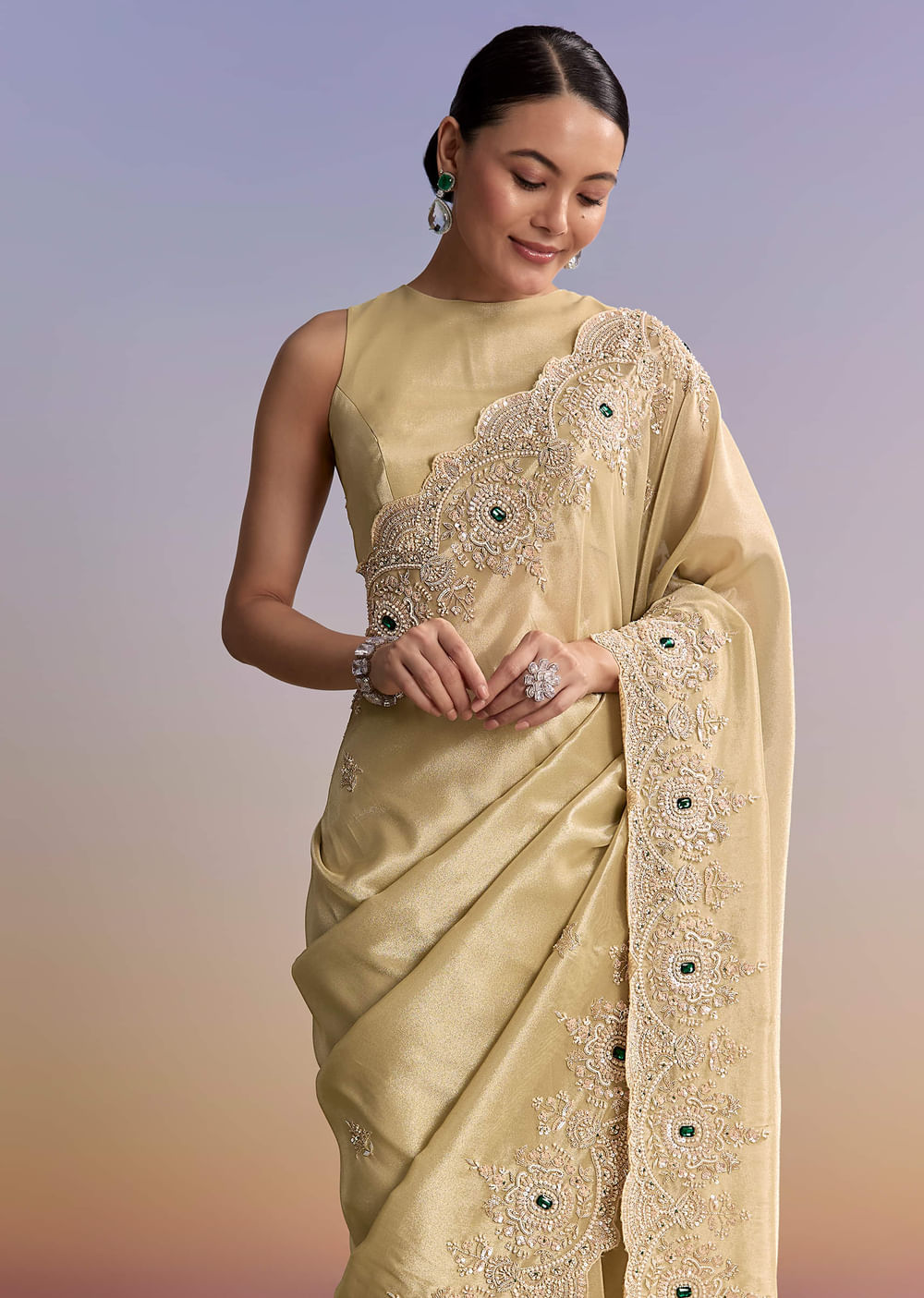 Golden hues in this beige tissue saree bring a regal glow, further enhanced by heavy scallop borders and embroidered buttis all over. Cutdana, sequins, beads, stones, and emerald stone detailing... More Product Details