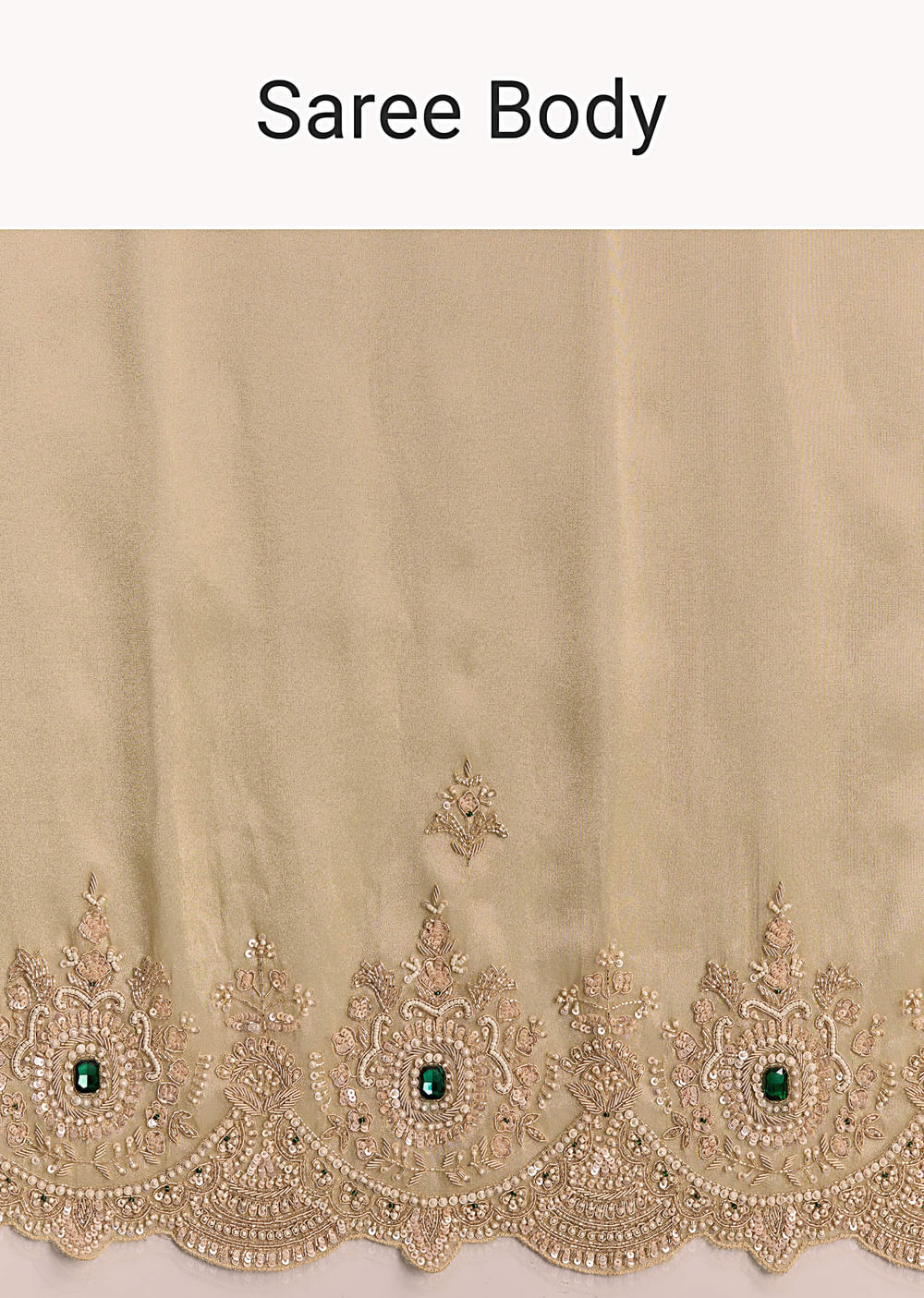 Golden hues in this beige tissue saree bring a regal glow, further enhanced by heavy scallop borders and embroidered buttis all over. Cutdana, sequins, beads, stones, and emerald stone detailing create a design that feels rich. Designed for the bride’s mother, it makes you stand out at sangeet, weddings, or engagement functions. Awarded as the Most Trusted Brand, we're delivering styles you love, just as promised.