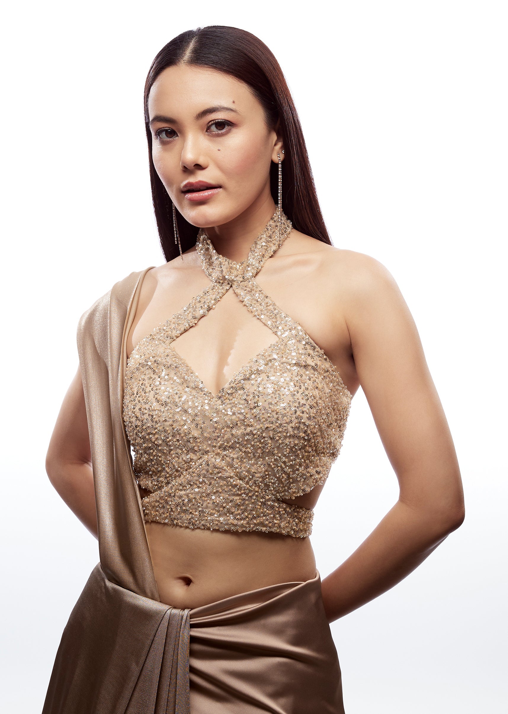 This gold blouse is a showstopper designed for elevated festive and wedding looks. Featuring a high neckline and cross-line design, it gives a bold, structured appearance that instantly upgrades any... More Product Details