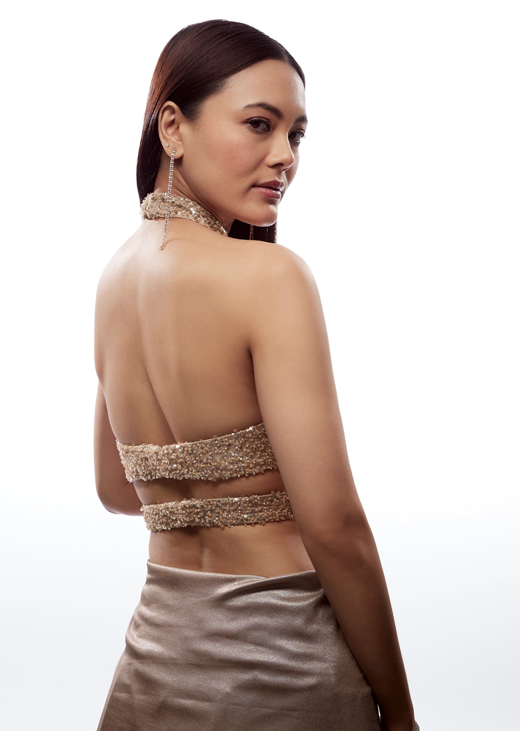 This gold blouse is a showstopper designed for elevated festive and wedding looks. Featuring a high neckline and cross-line design, it gives a bold, structured appearance that instantly upgrades any saree or lehenga. Crafted in fancy fabric with stone embellishment, it carries a rich festive shine without needing heavy accessories. The side gap detail adds a modern edge, while the back tassel finishing keeps it traditional and occasion-appropriate. This blouse is perfect for sangeet nights, cocktail events, and wedding receptions when you want a strong statement piece that stands out in photos and in person. Awarded as the Most Trusted Brand, we're delivering styles you love, just as promised.