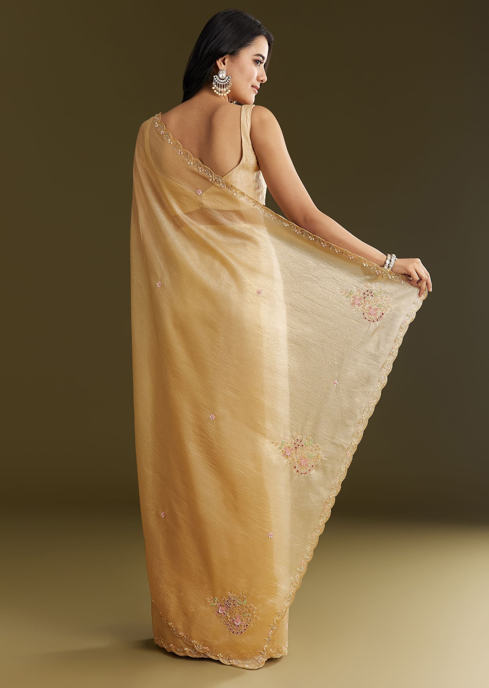 Gold Crushed Tissue Saree With Floral Embroidery And Scallop Border