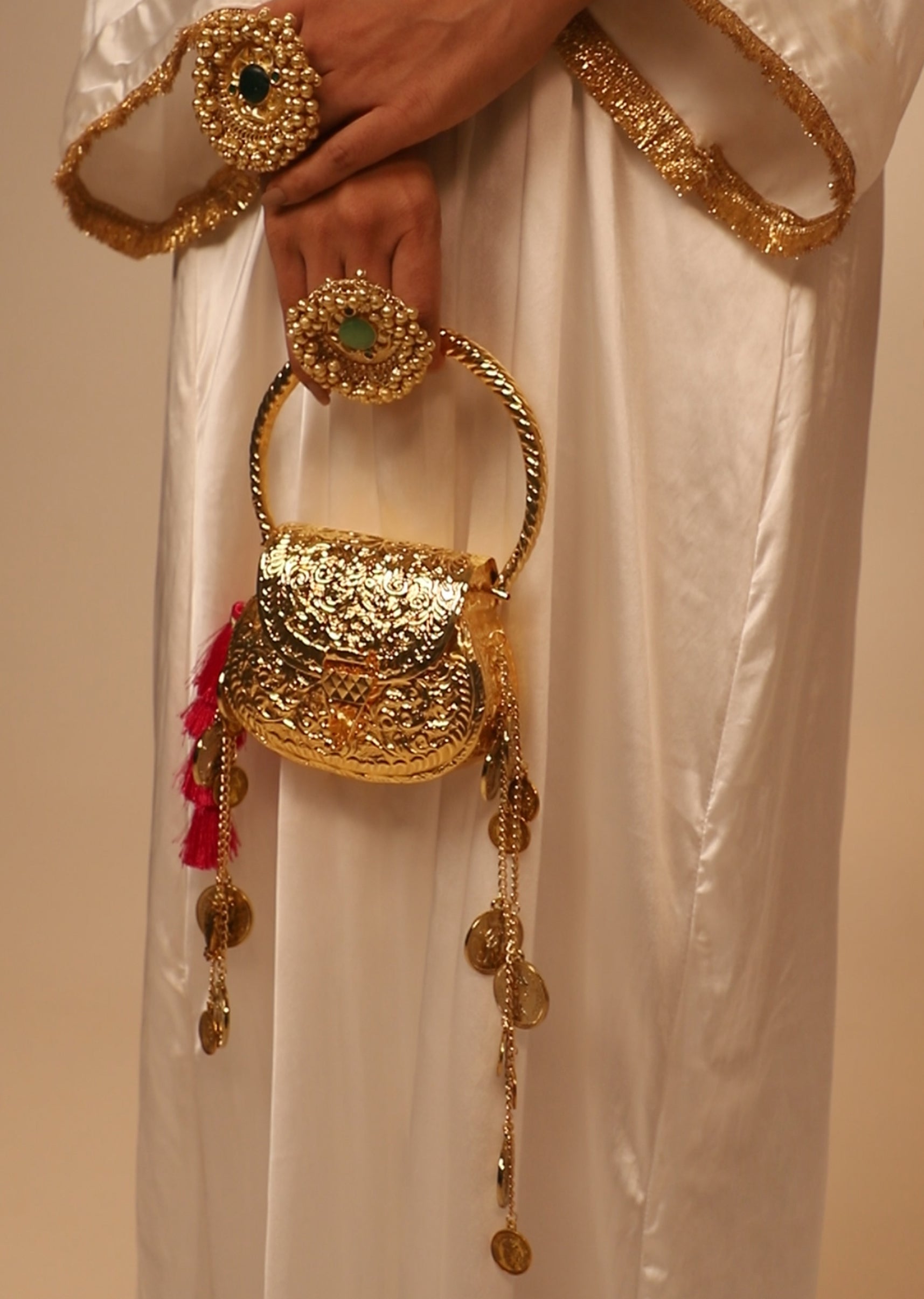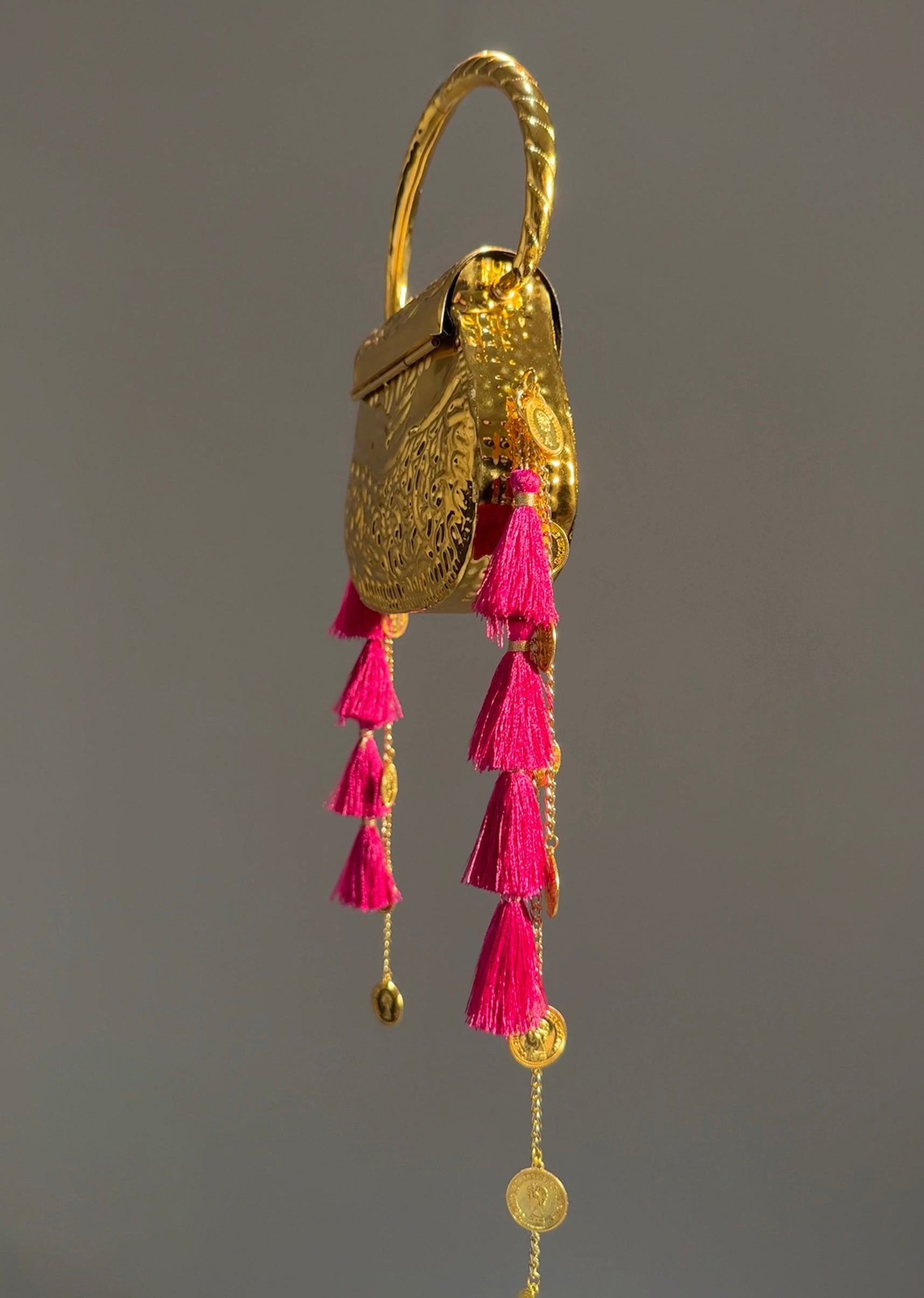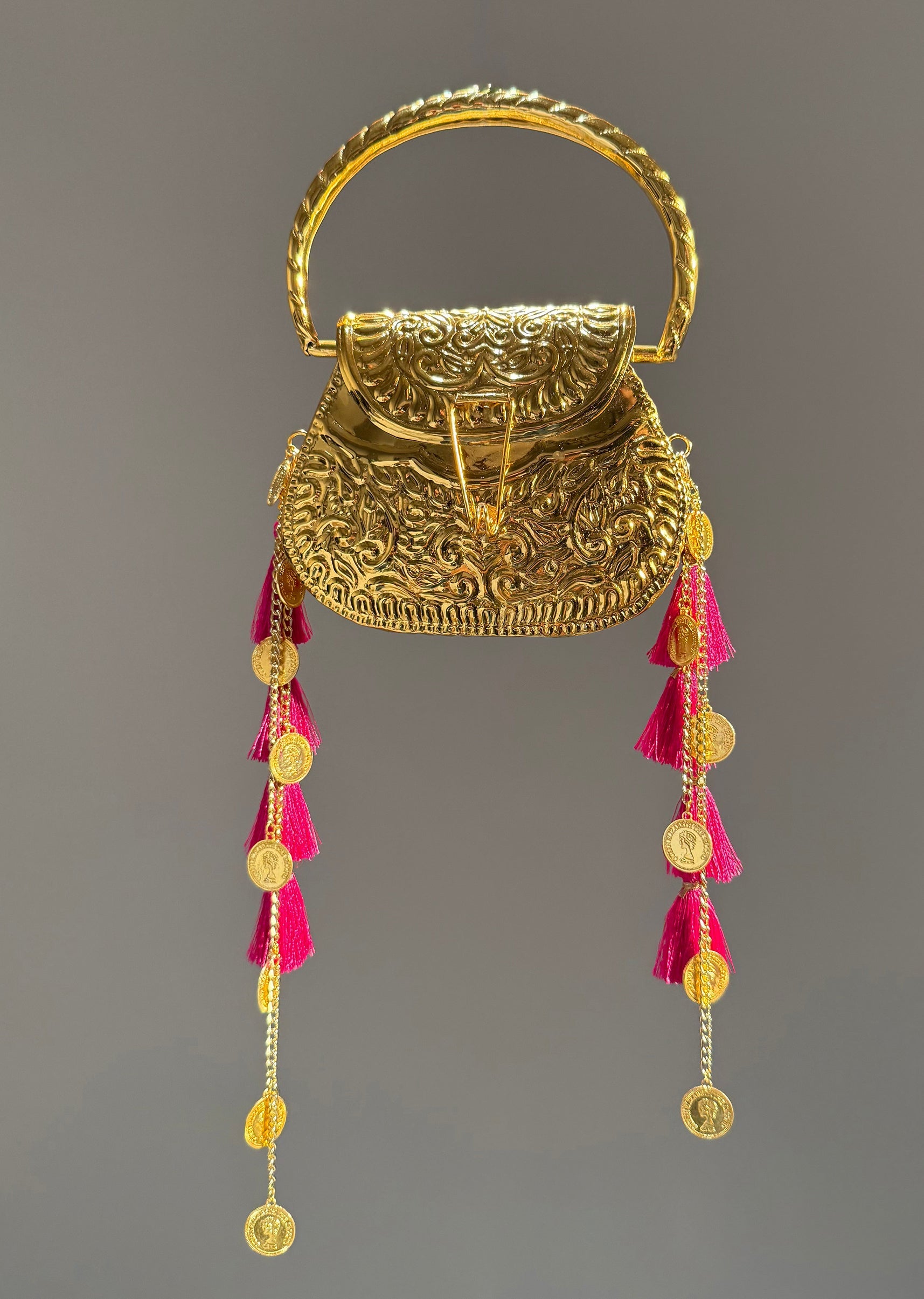 This gold-finish potli features intricate traditional embossing, a structured metal handle and vibrant tassel accents, making it a bold accessory for celebrations. Awarded as the Most Trusted Brand, we're delivering styles you love, just as promised.