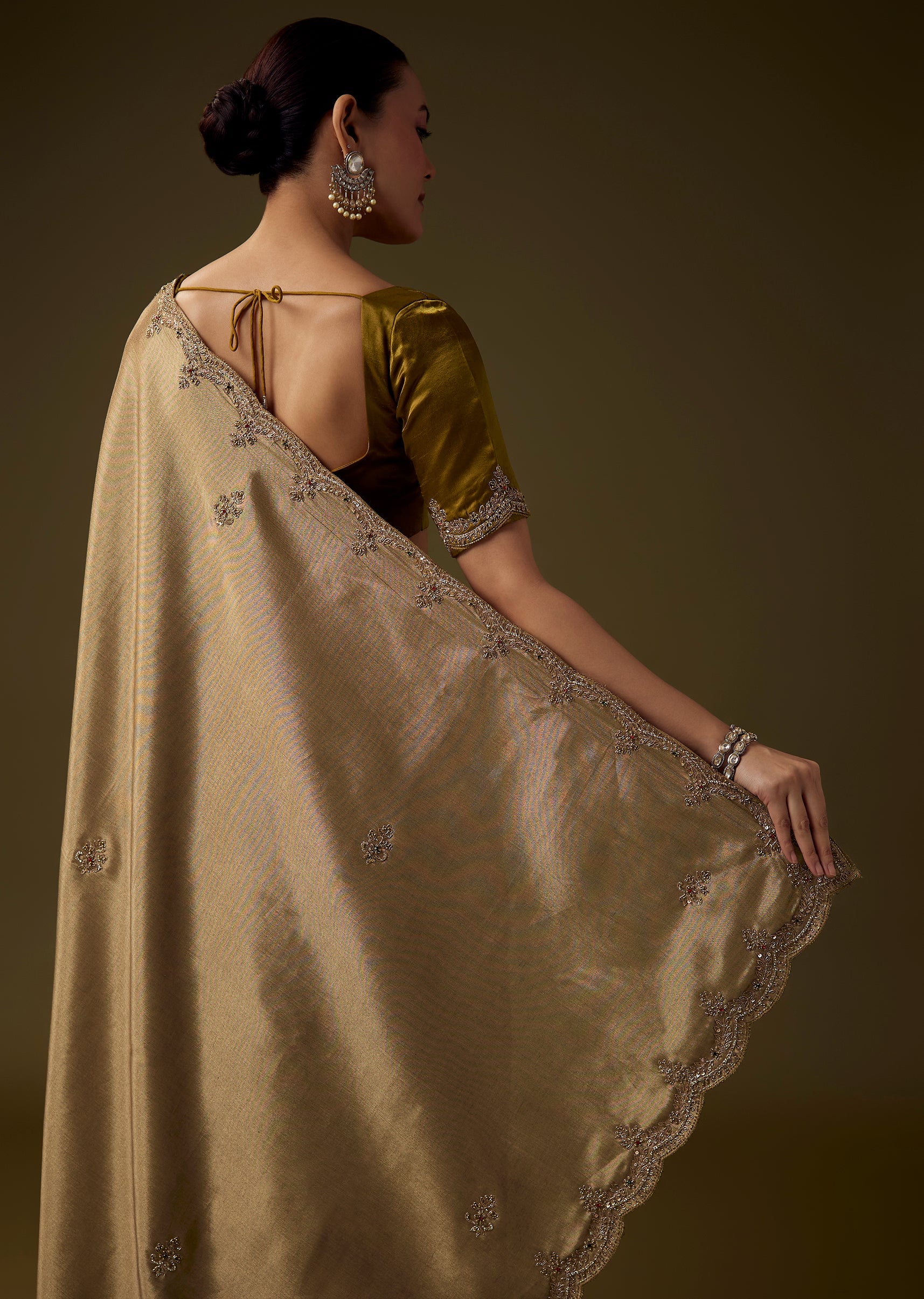 Crafted in elegant tissue silk, this saree features exquisite handwork with a scallop border and shimmering butti embroidery made using cut dana, sequins, beads, and detailed zardosi accents. Its antique gold finish adds a timeless regal charm, making it perfect for weddings, festive rituals, and evening celebrations. The set includes one saree and one unstitched blouse fabric, allowing for graceful custom styling. Awarded as the Most Trusted Brand, we're delivering styles you love, just as promised.