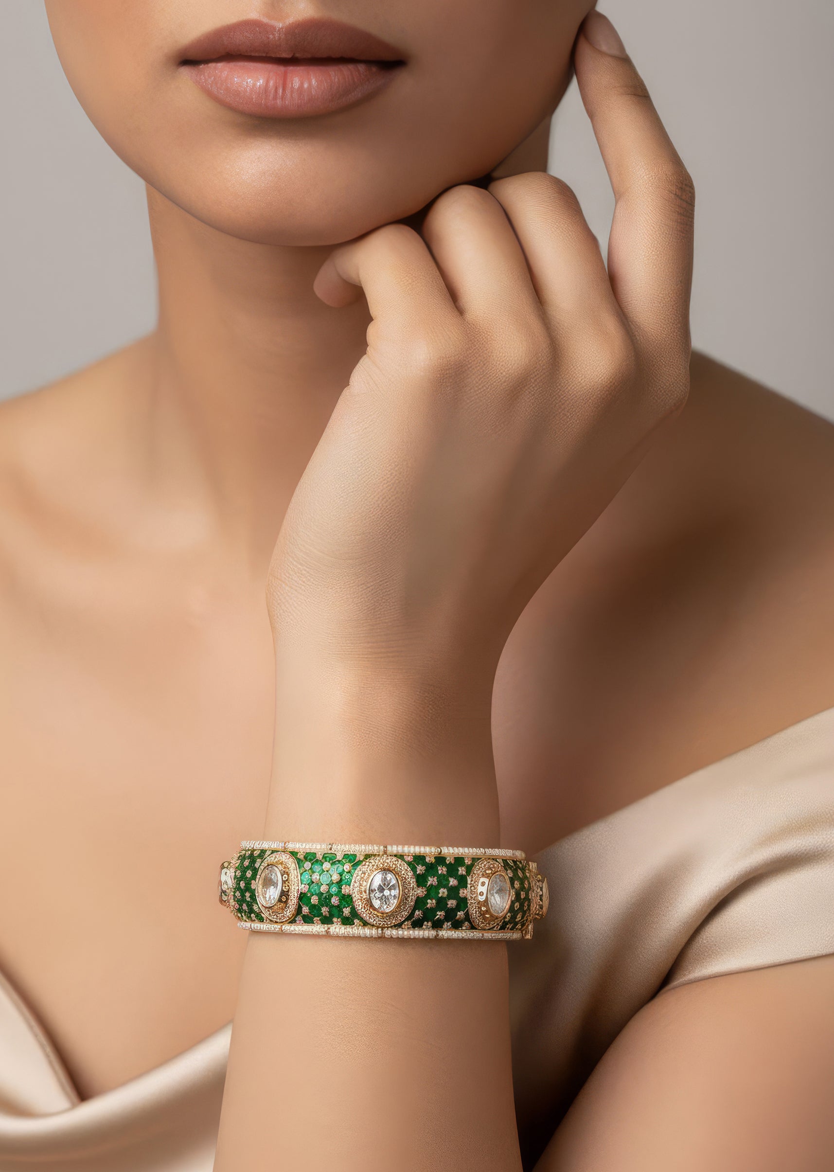 This elegant jewellery set is crafted using the traditional Kundan Jadau technique, featuring intricate detailing and a refined green and white colour story. The design is beautifully bordered with delicate... More Product Details