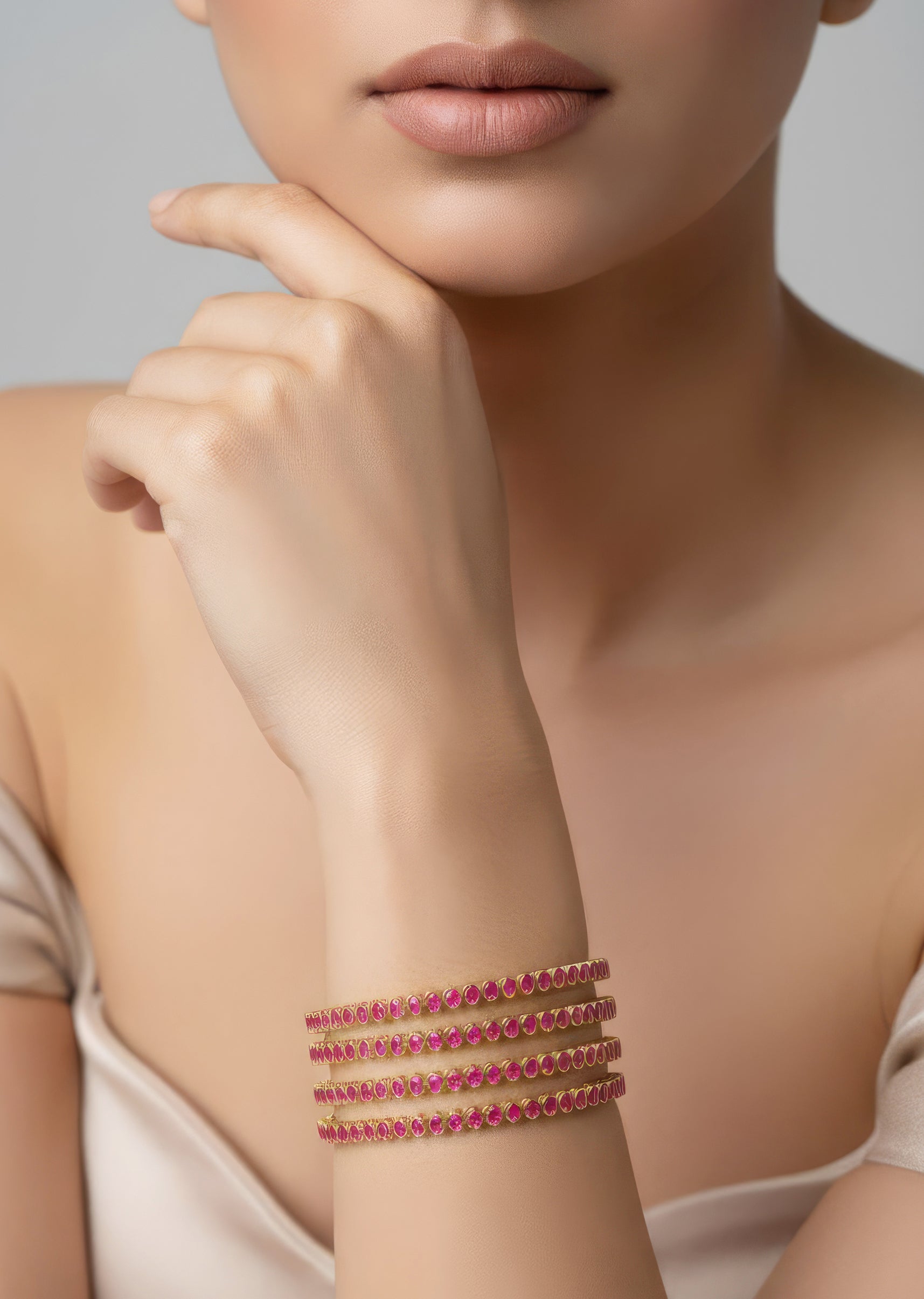 A stunning bangle in a radiant gold finish featuring finely detailed traditional temple motifs accented with simulated ruby stones. The rich red hue of the rubies adds a vibrant and festive touch, making it perfect for weddings and celebratory occasions.