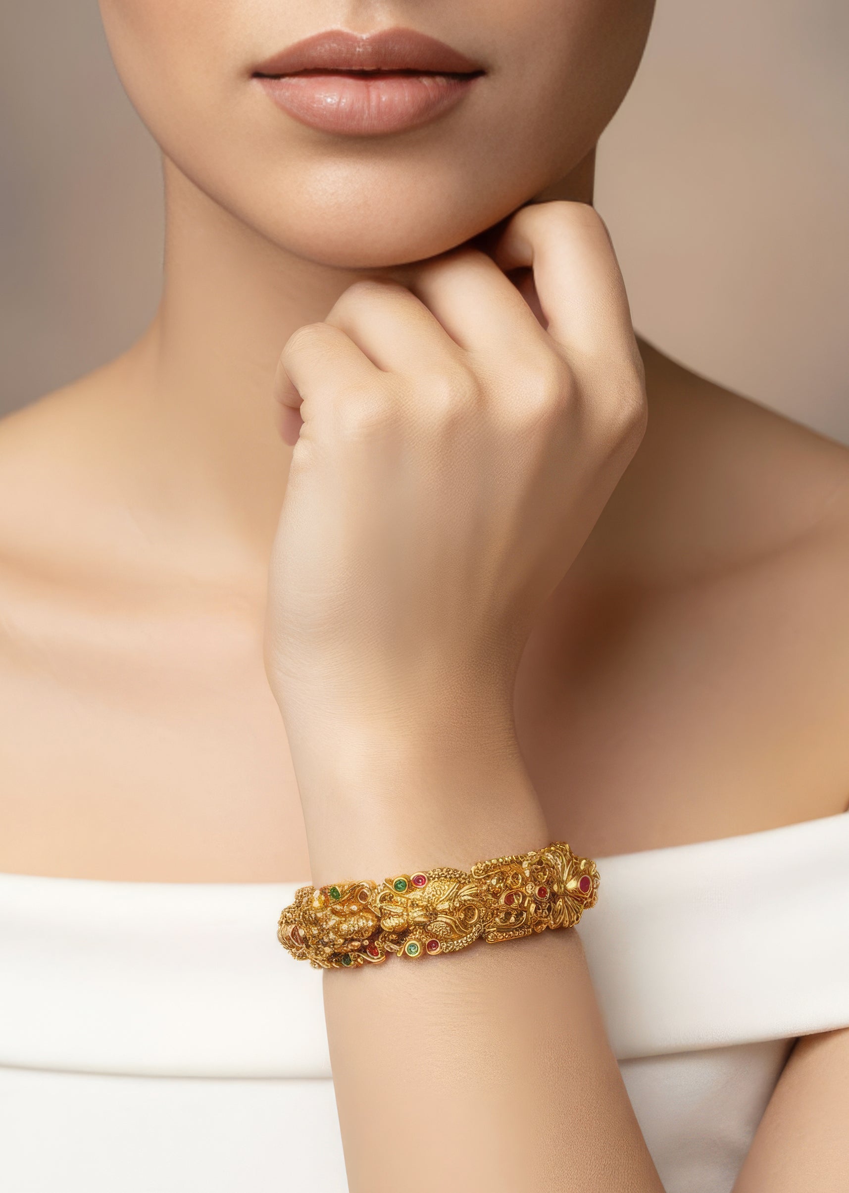 A traditional temple inspired bangle set crafted in a radiant gold finish. The design features intricate temple motifs accented with pink and green simulated stones that add a festive and elegant charm. Perfect for weddings and traditional celebrations, these bangles enhance bridal and family looks with timeless ethnic appeal.