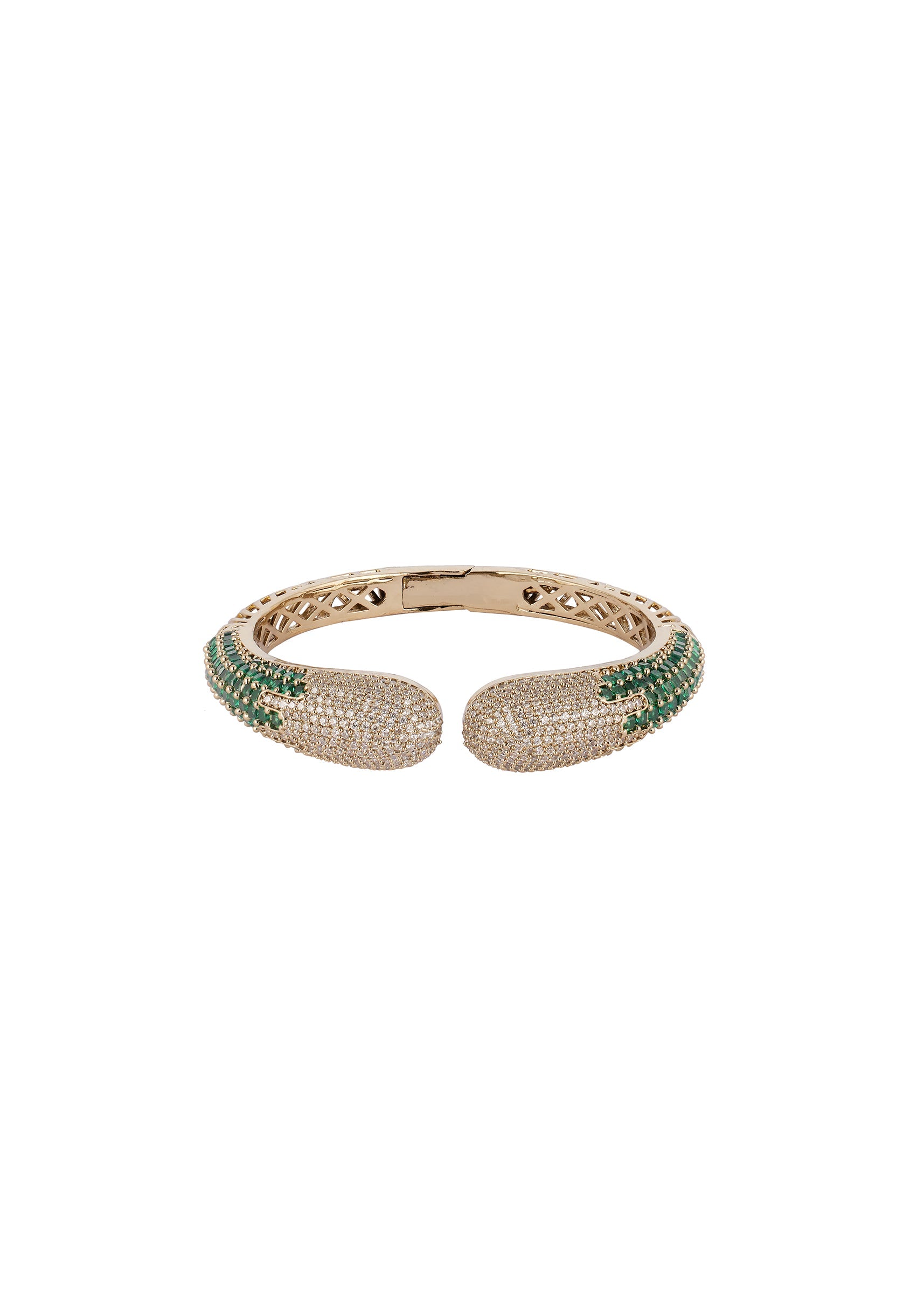Gold Finish Bracelet In Mix Metal With Modern Cuff Style And Green Simulated Emerald And Cubic Zirconia Accents