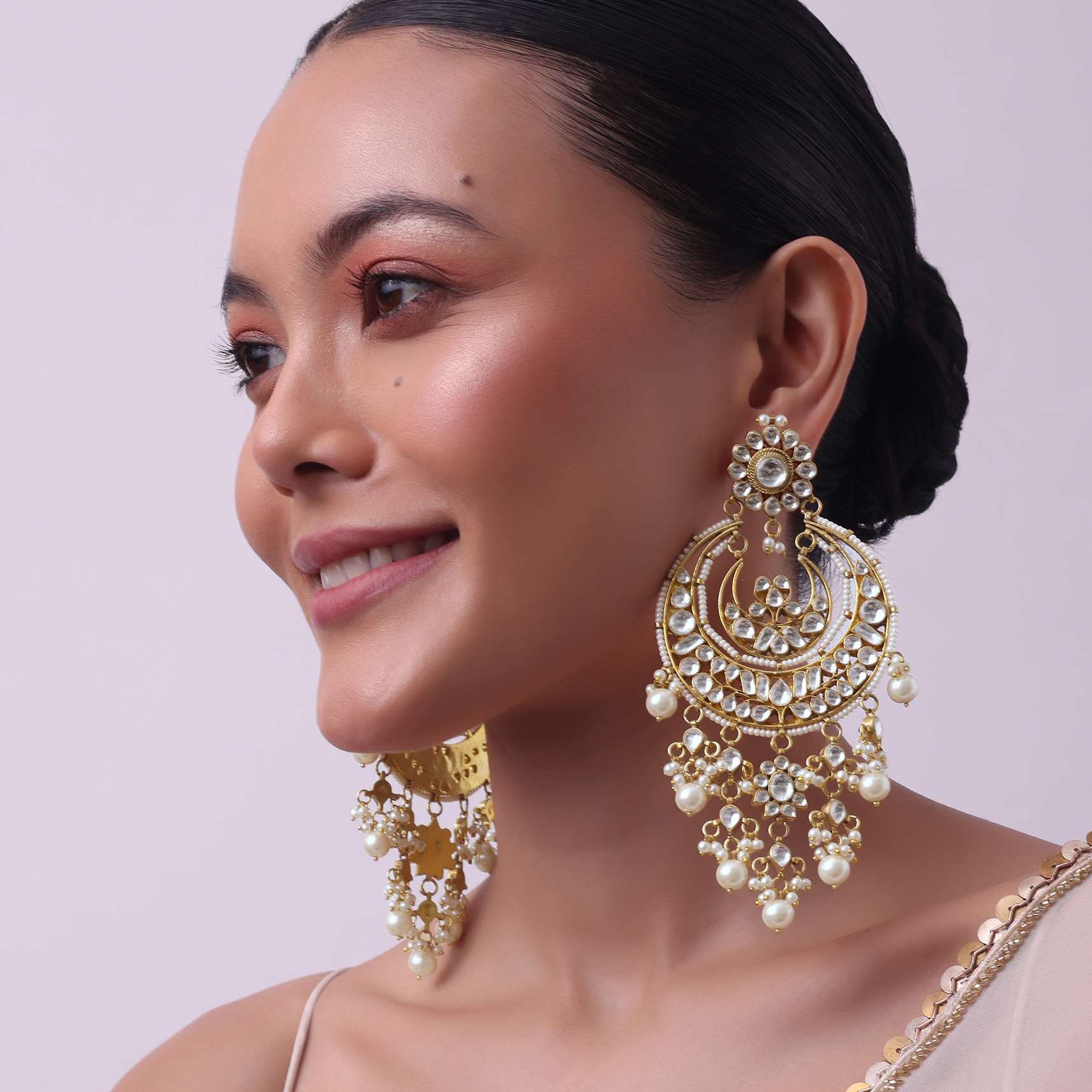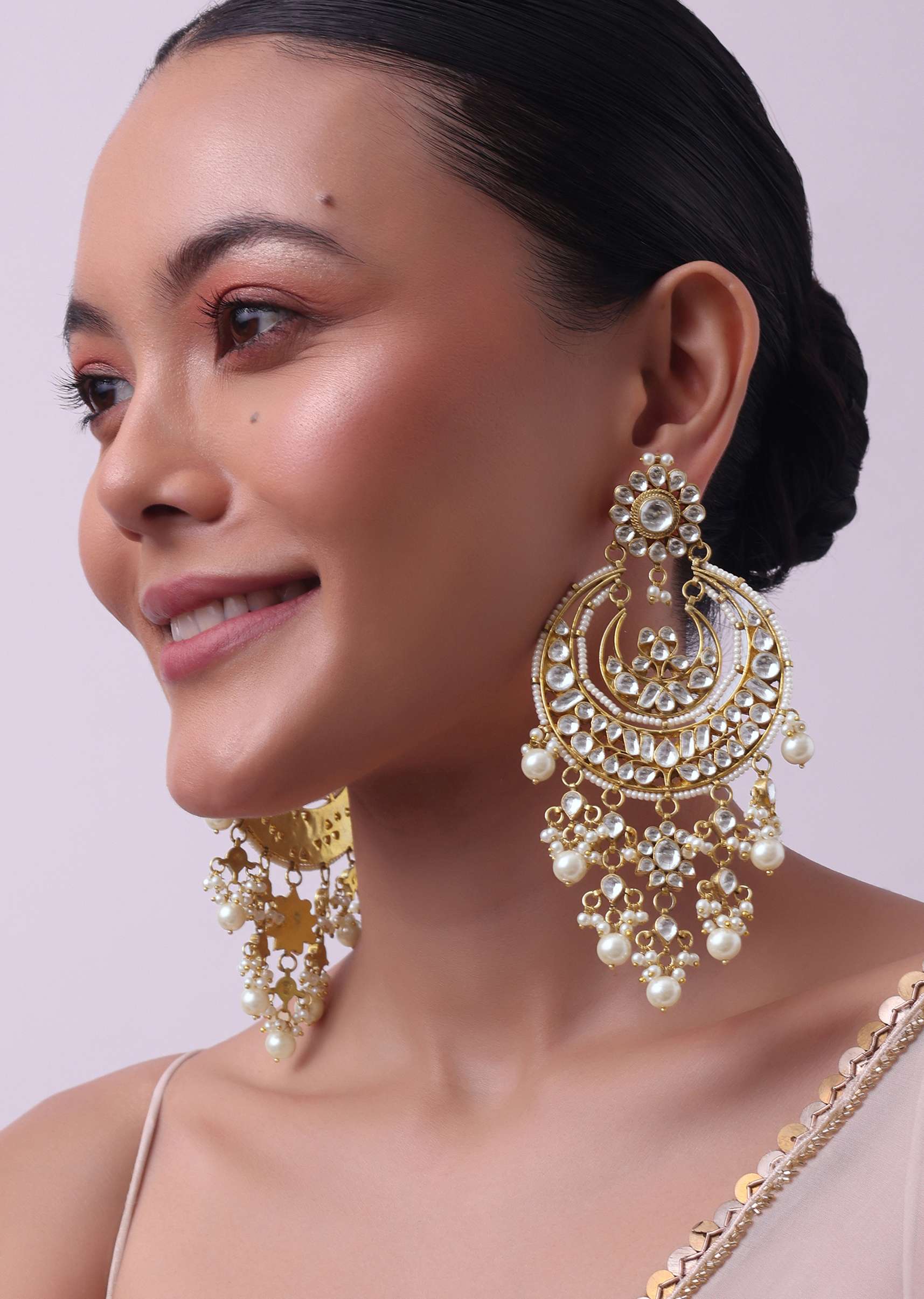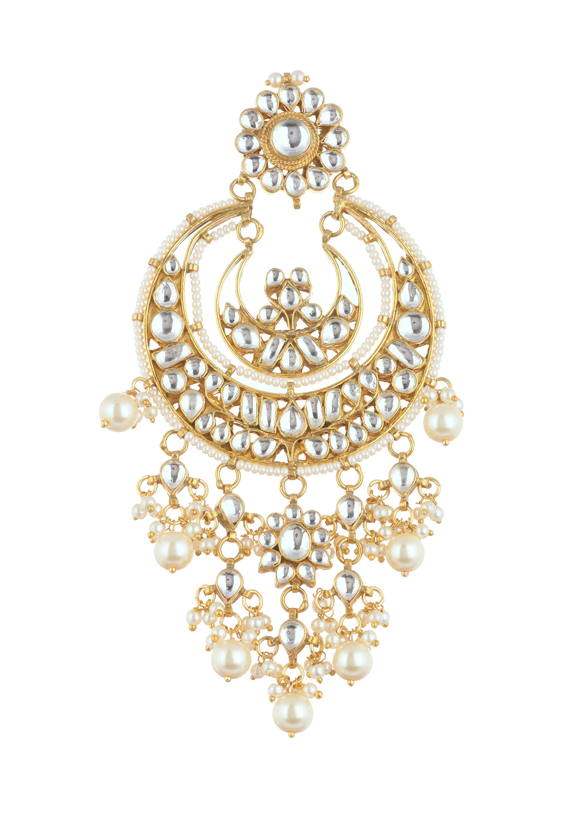 Step into a world of grandeur with our gold finish chandbalis in mix metal.These captivating chandbalis are adorned with intricate white kundan work accentuating their regal charm. The addition of lustrous pearls further enhances their allure making these earrings a cherished piece of jewelry.EVENT - Perfect for weddings formal events and festive celebrations.Store in a dust bag. Keep away from moisture perfume alcohol and harsh chemicals. Spot clean only. Keep away from sharp objects. Actual color may slightly vary due to photographic lighting sources and device screen settings. Awarded as the Most Trusted Brand, we're delivering styles you love, just as promised.
