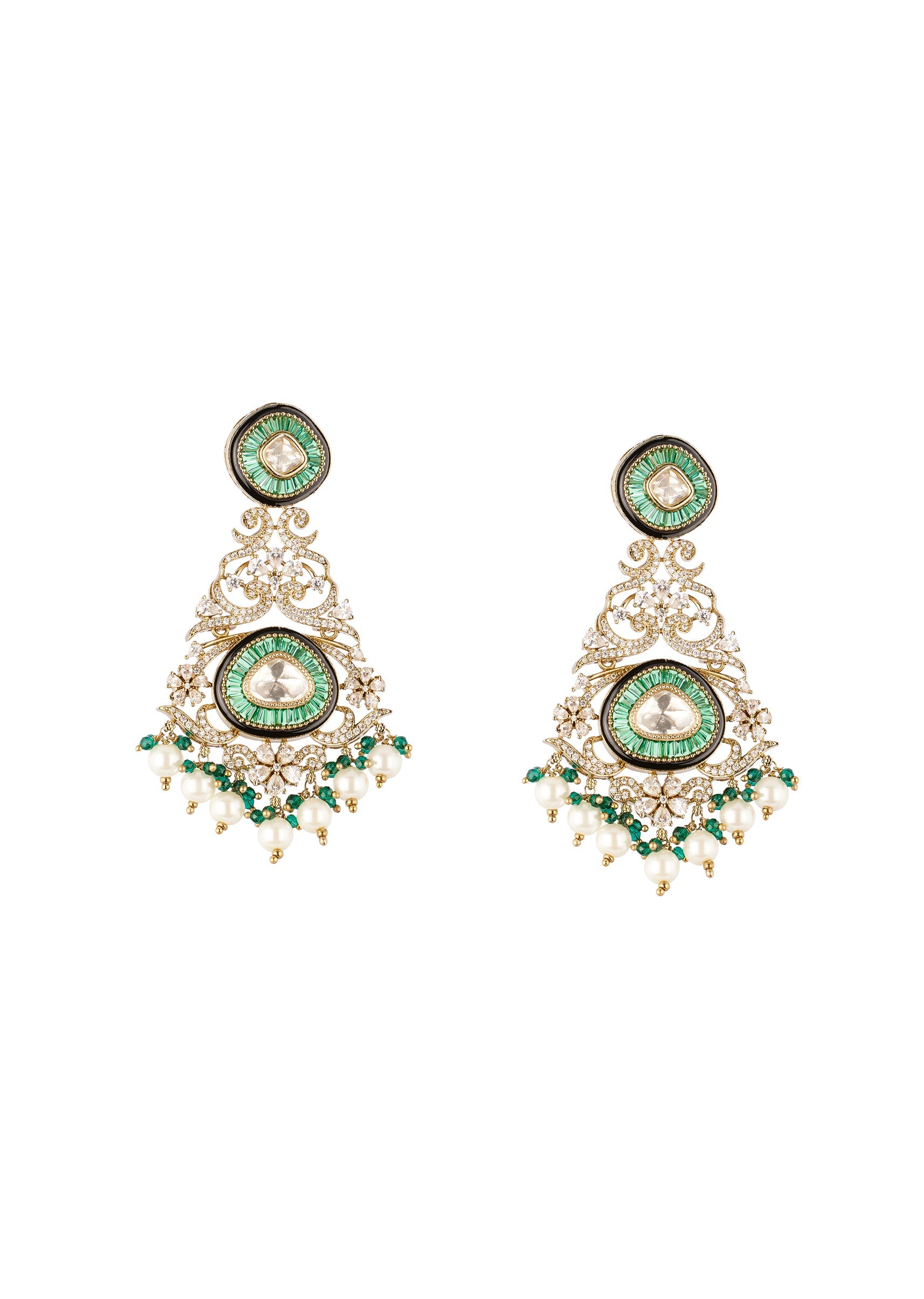 Gold Finish Chandelier Earrings In Polki With Simulated Pearls and Green Beaded Accents
