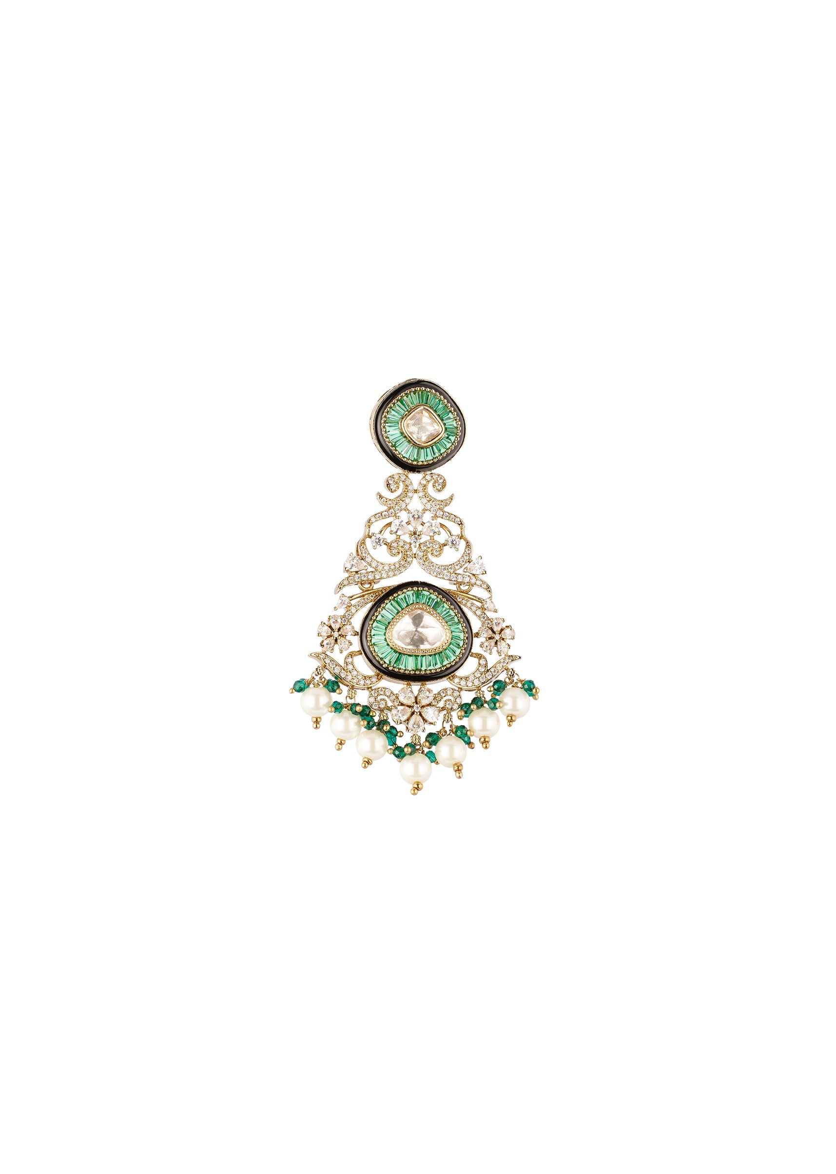 A traditional pair of chandelier earrings crafted in a rich gold finish, inspired by classic polki styling. Designed with simulated pearls and green beaded accents, the layered structure adds movement... More Product Details